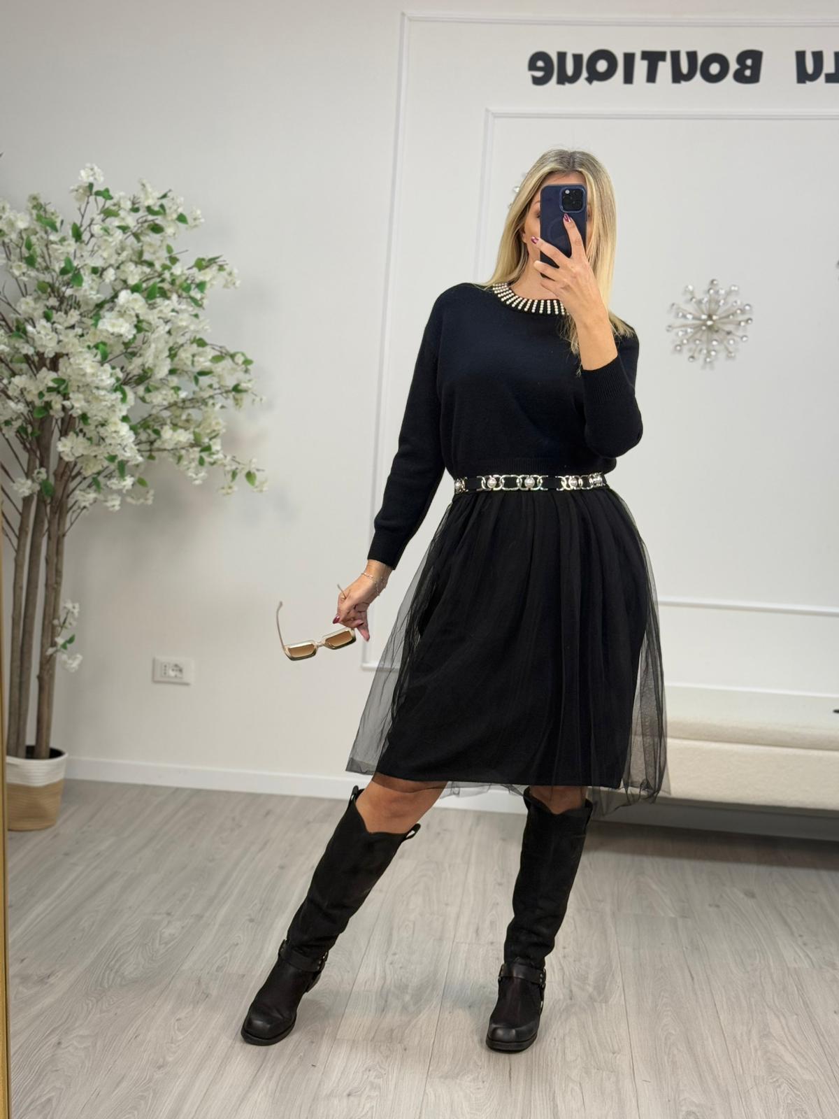 - Descrizione: Abito Con Maglia Susy Mix , perline sul giro colò, composto da maglia e abito .Si possono usare anche separatamente.