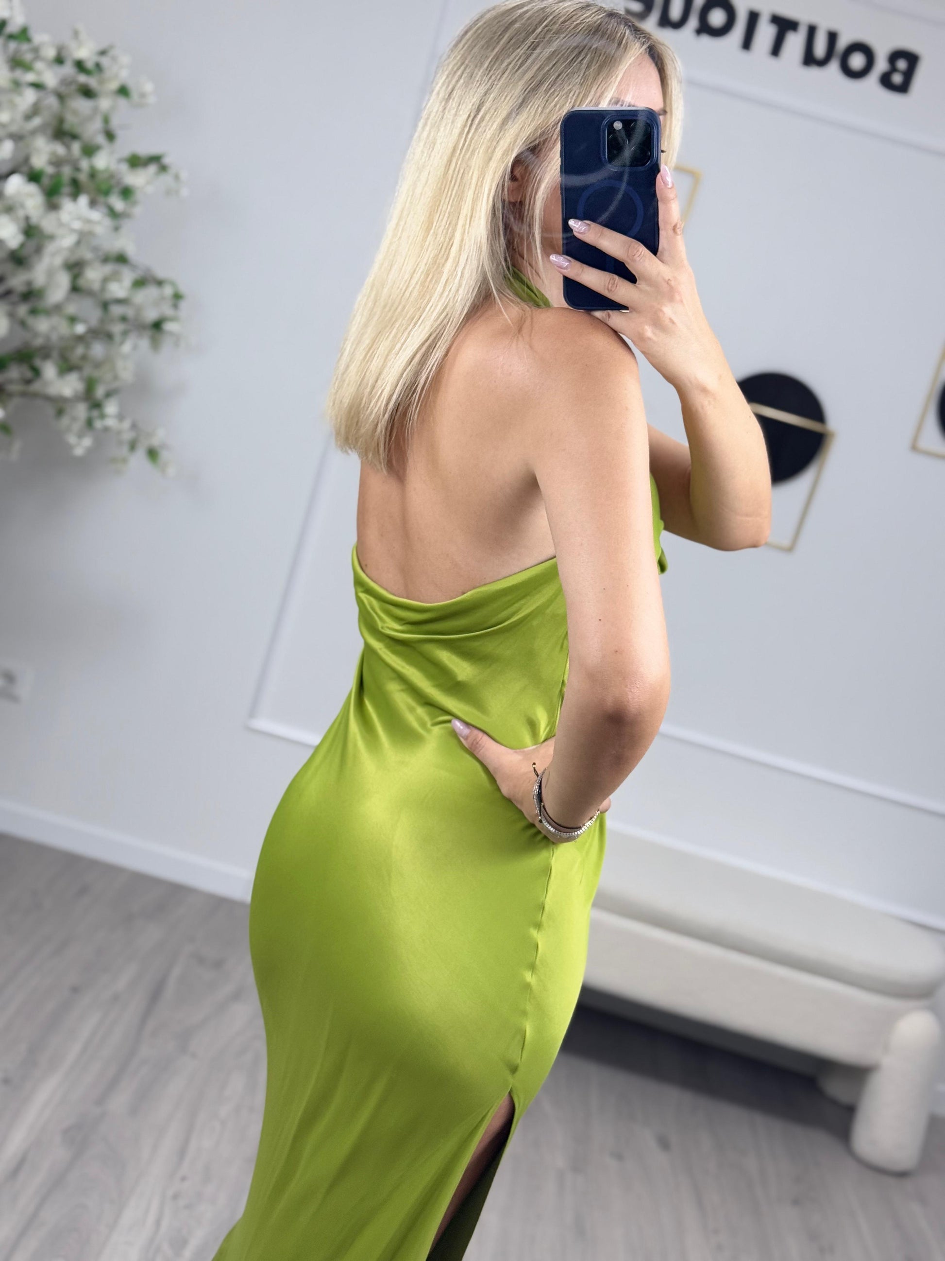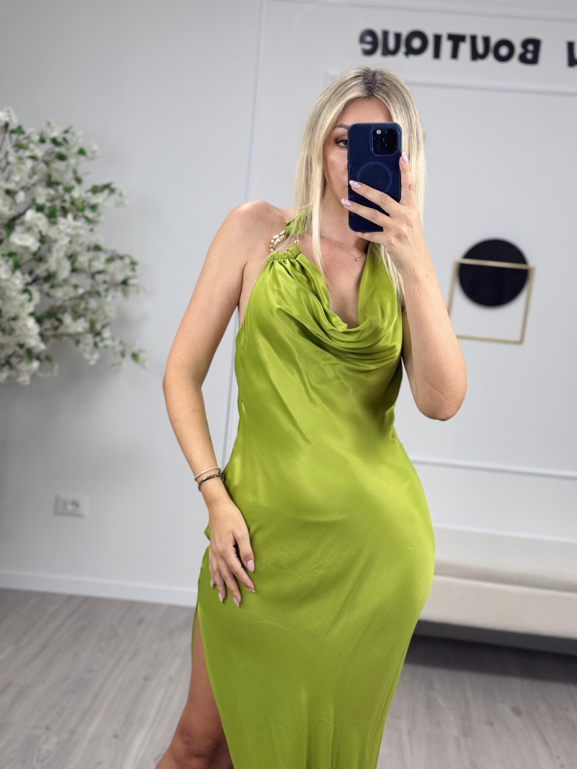 - Descrizione: Abito Lungo Olio Con Accessorio e Spacco Laterale. Schiena Nuda .