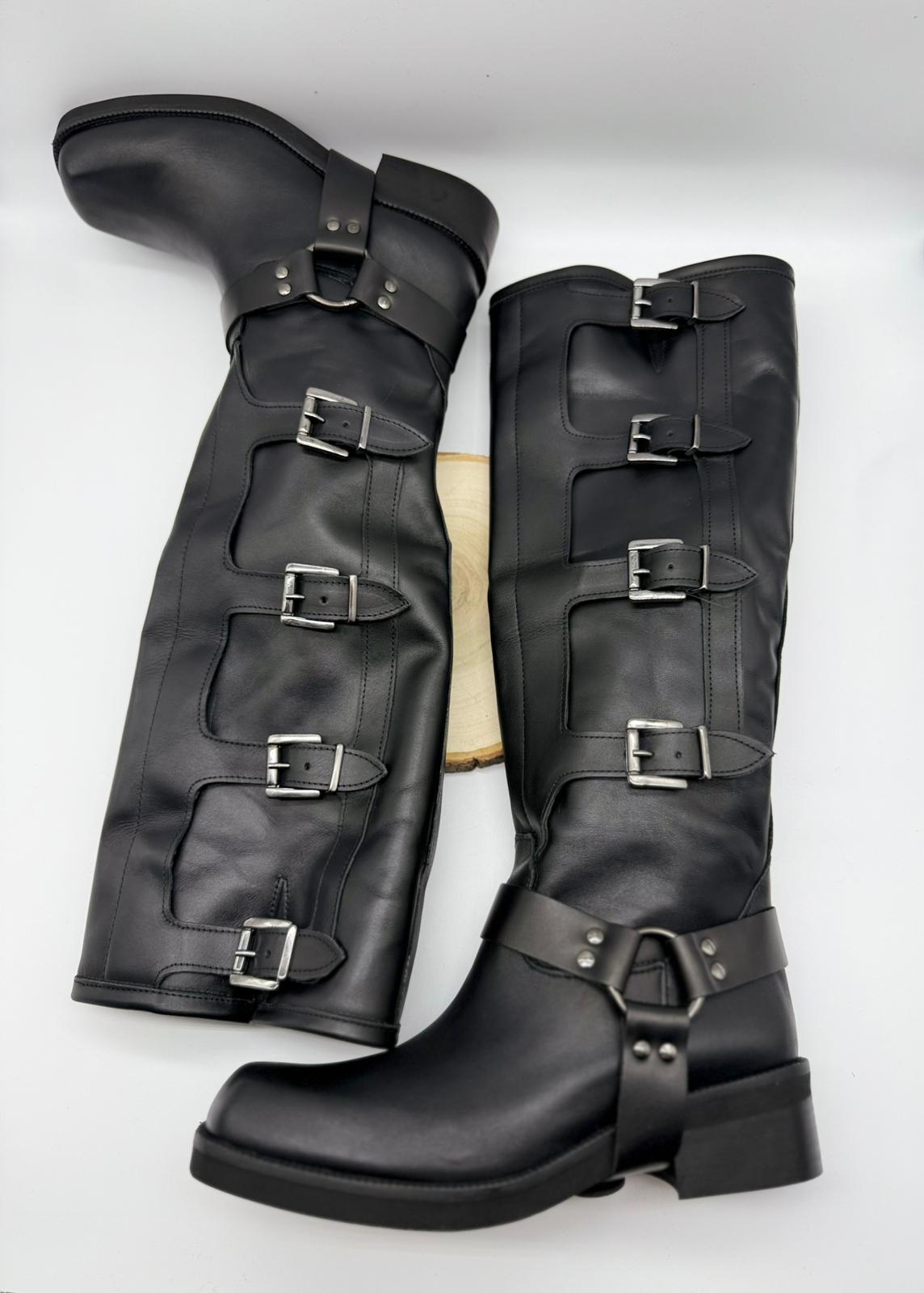 - Descrizione: Biker Con Fibbie Divine Follie. Modello gambale alto e punta squadrata con dettaglio di fibbia alla caviglia e lacci sulla lunghezza.