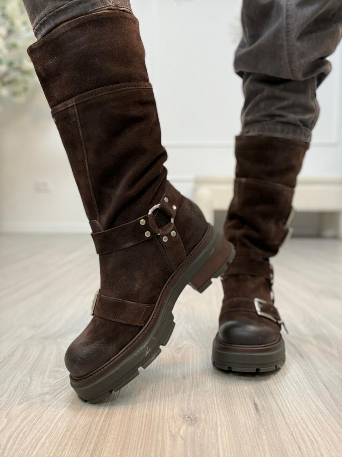 - Gli stivali sono di colore marrone scamosciato, alti fino a metà coscia e presentano diverse fibbie decorative lungo la gamba e la caviglia.