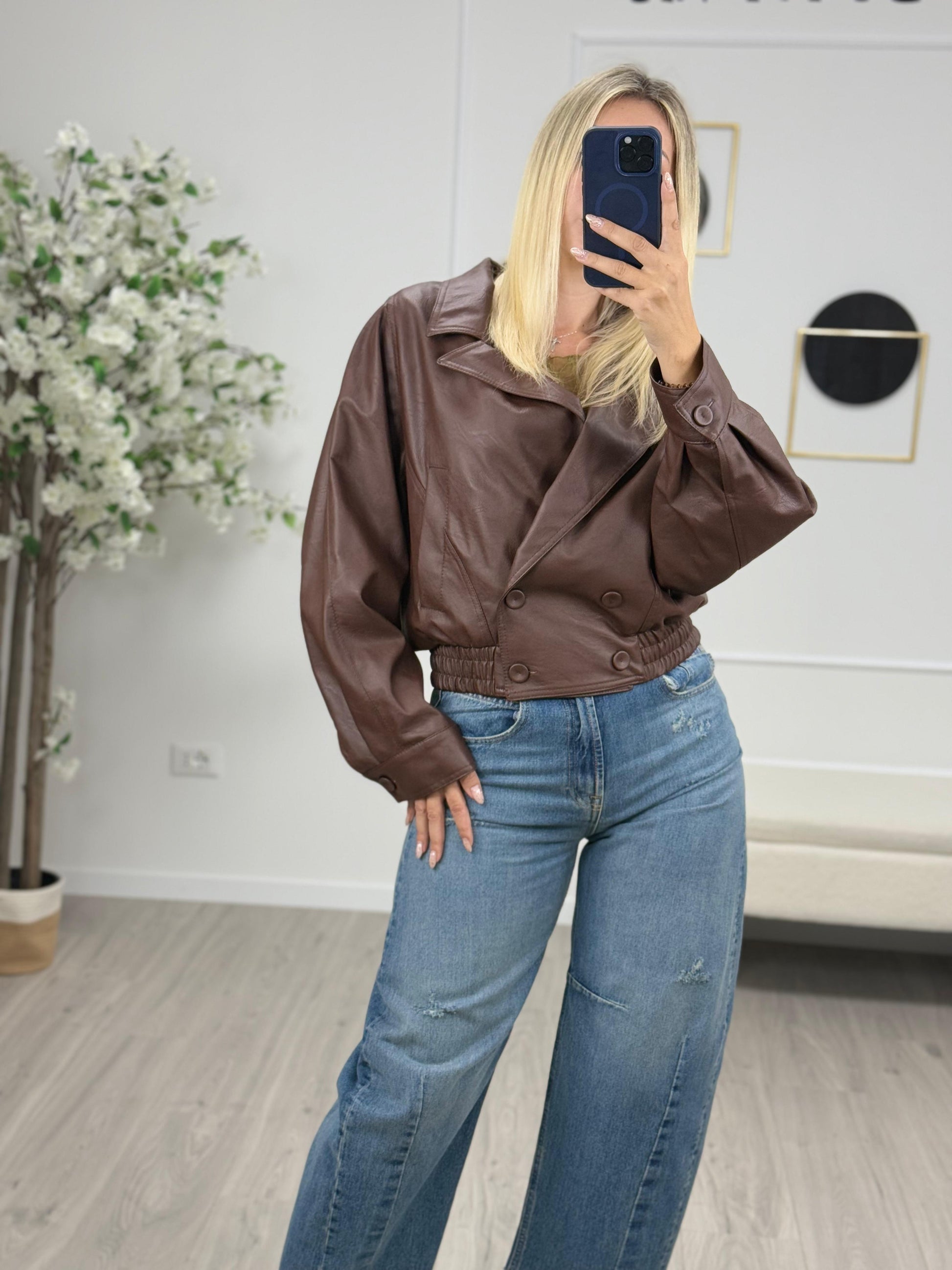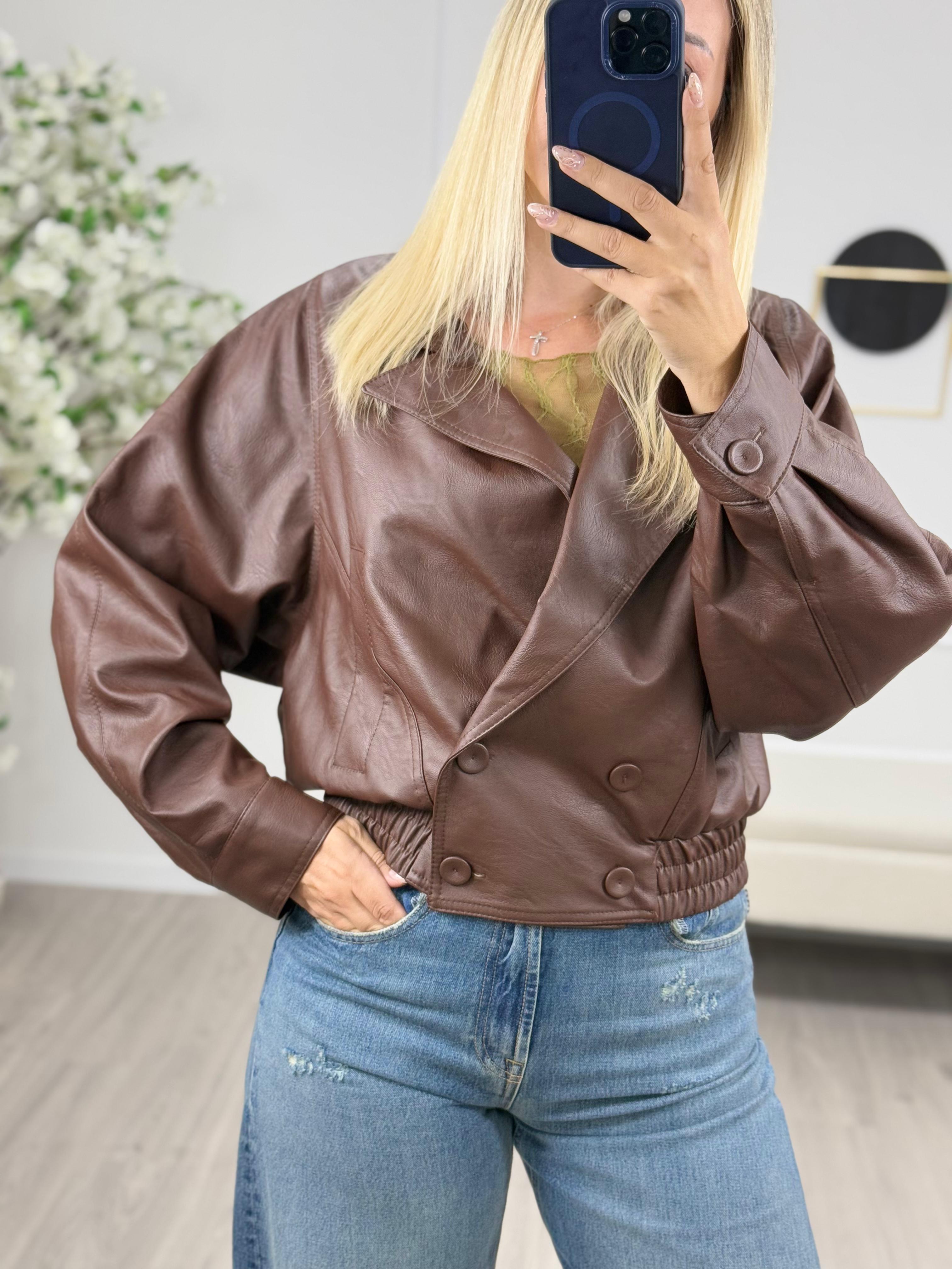 - Descrizione: Bomber Ecopelle Moro Doppio petto e elastico dietro, tasche e chiusura a bottone.