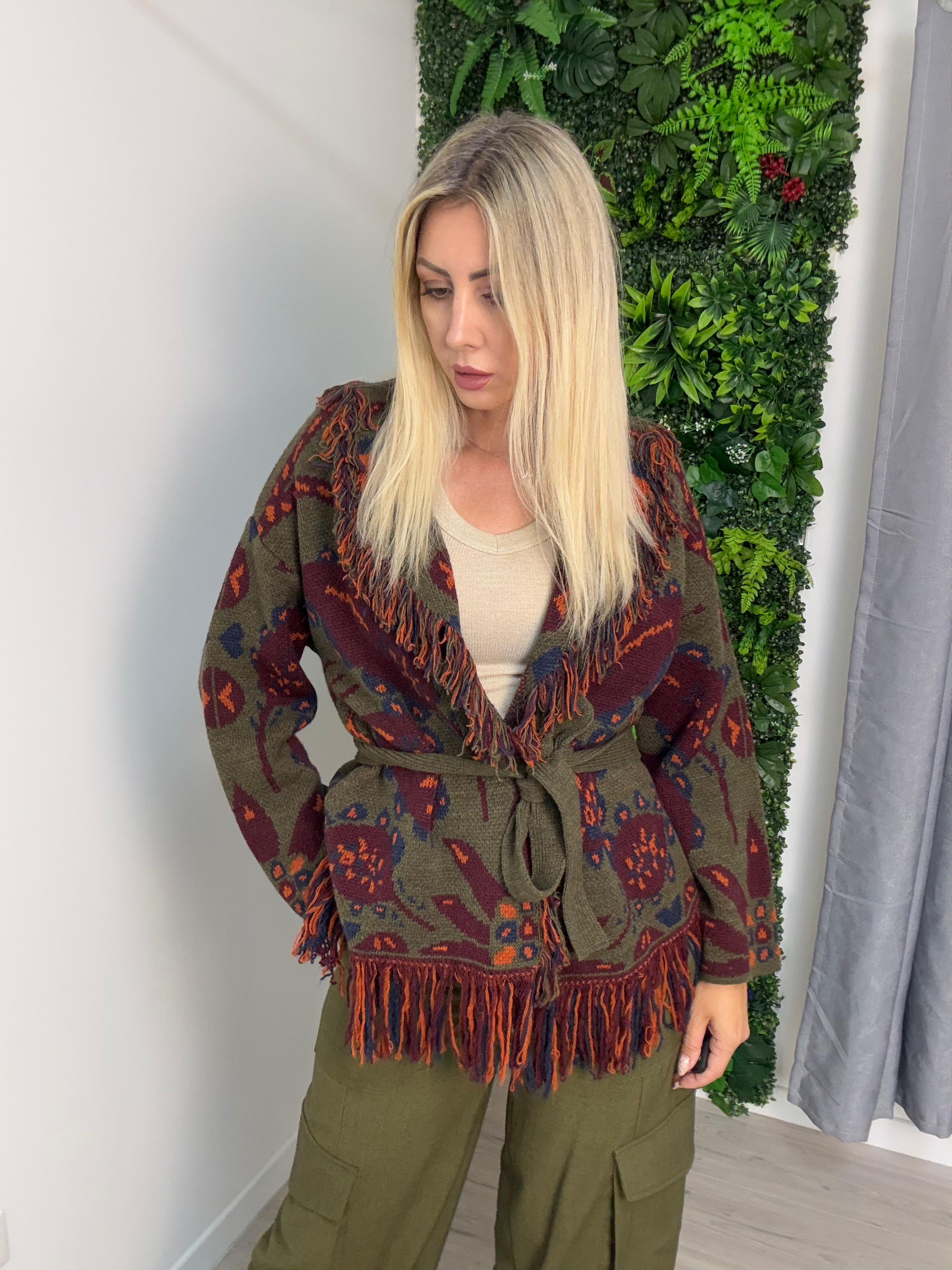 Descrizione: Cardigan Frange Fantasia Foglie militare/vino/blu misto alpaca con cintura. composizione:75%pc,10%lana,10%vi,5%alpaca