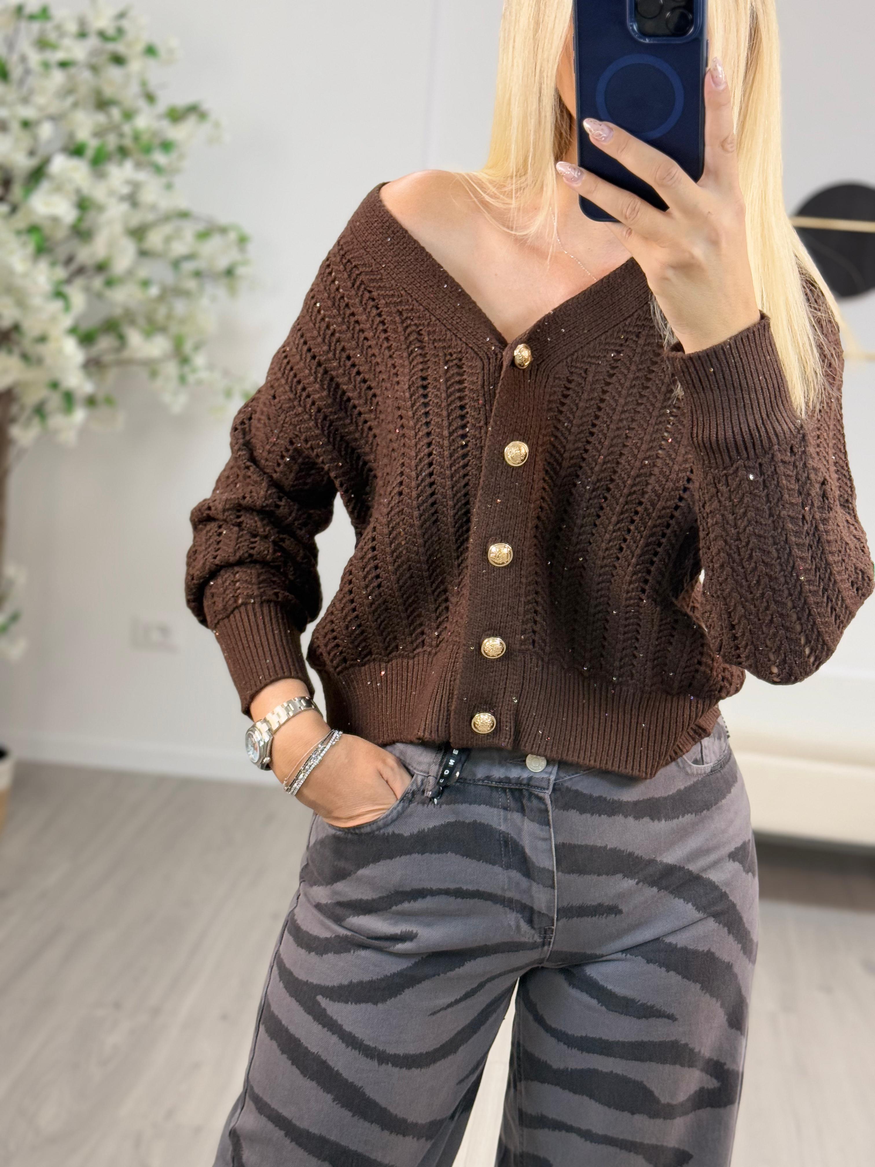 - Descrizione: Cardigan Paillette con Chiusura a Bottoni. Disponibile in colore marrone e Crema. Composizione: 47%viscosa, 35%pl 18%pa