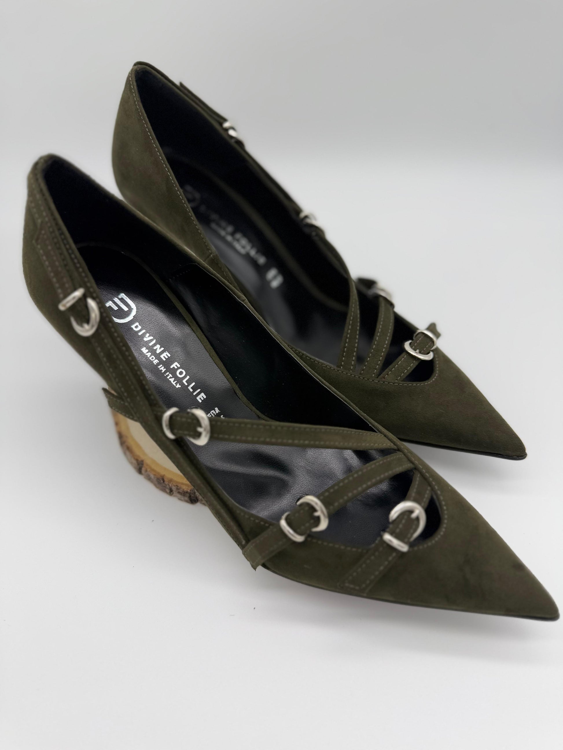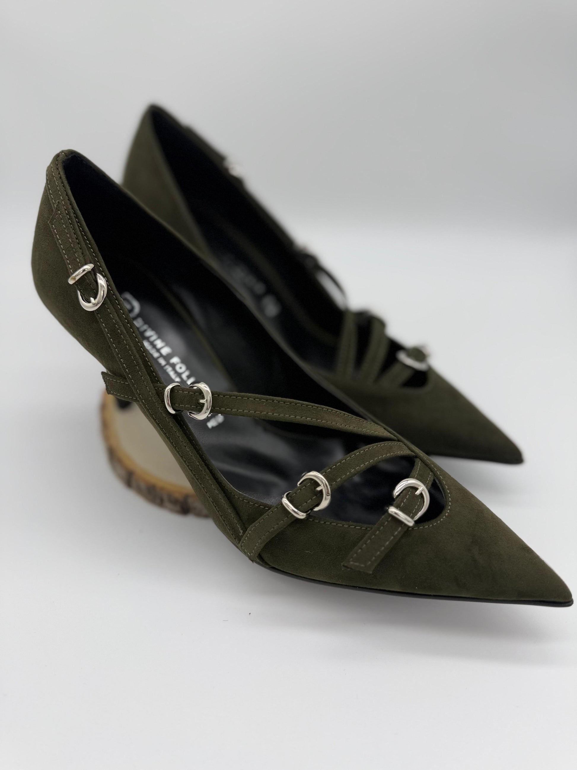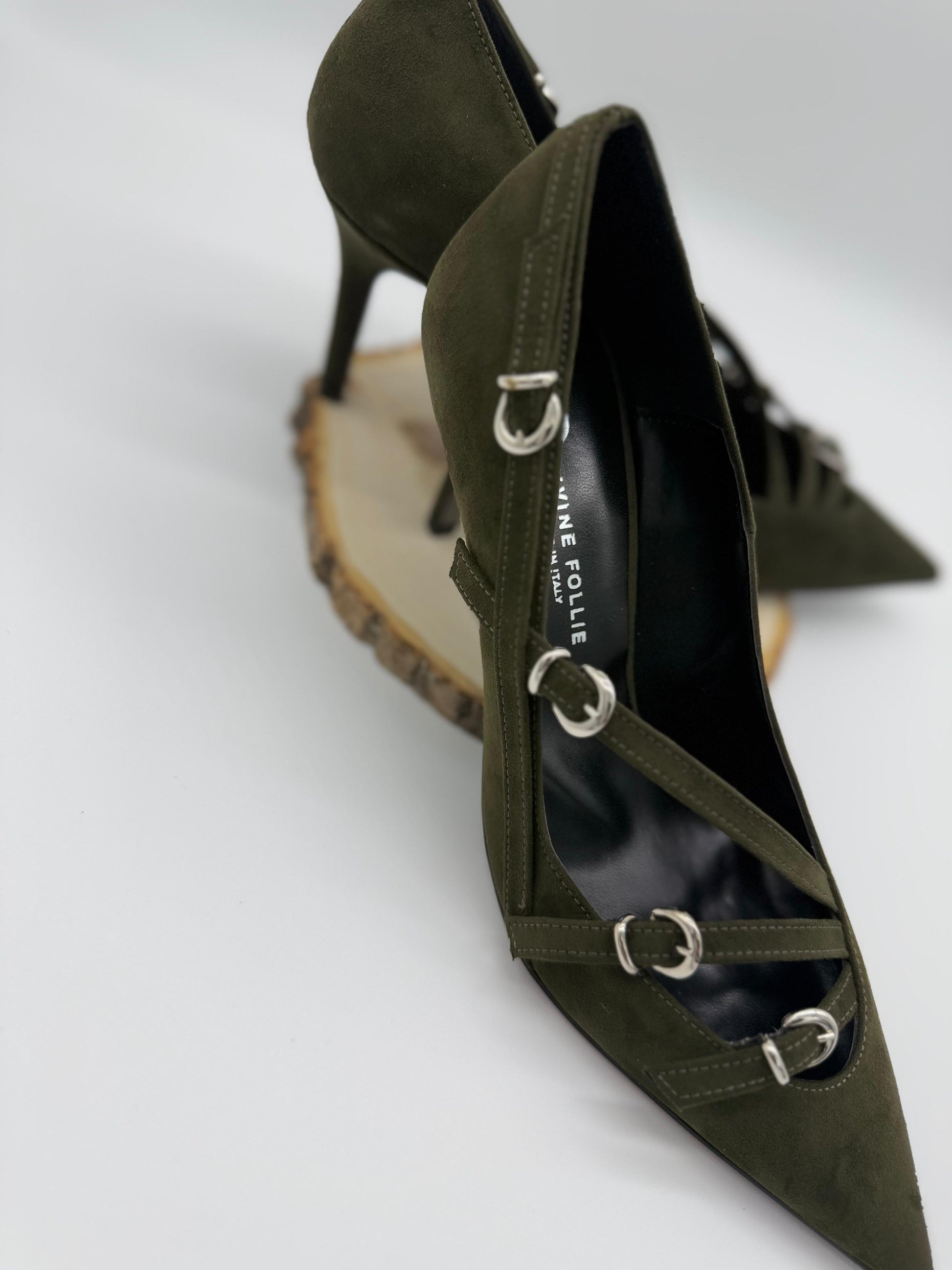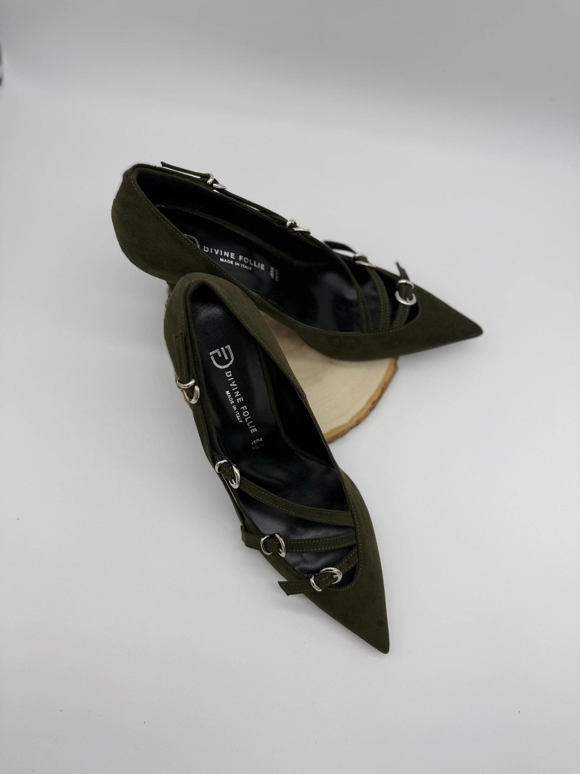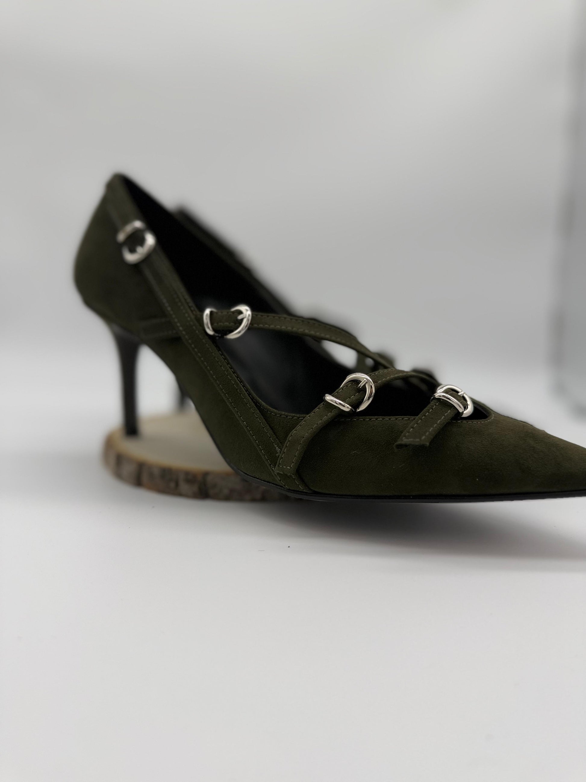 Descrizione: Décolleté Scamosciata Verde Con Fibbie Argento.