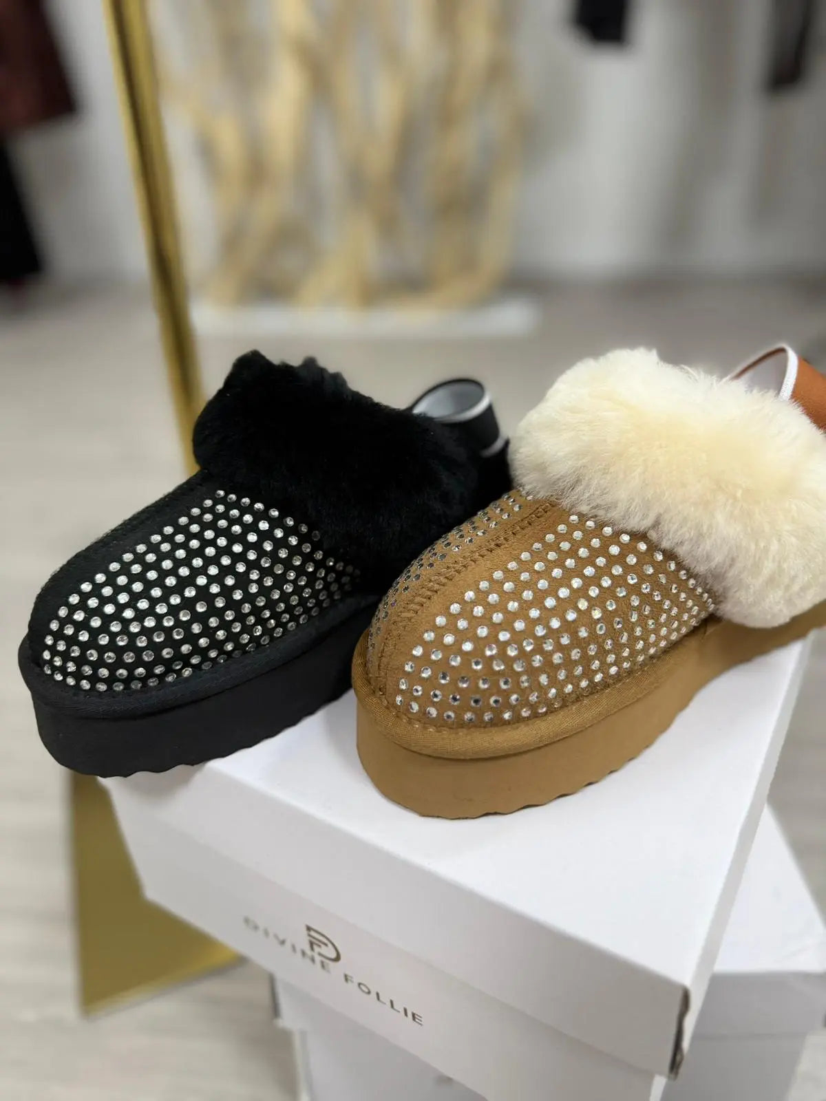 DIVINE FOLLIE Ciabatte imbottite stile Ugg con brillantini e elastico per una maggiore comodità .Sono Musthave di questo inverno si possono abbinare con tutto per dare un tocco di brillantezza al tuo look .100% Made in Italy