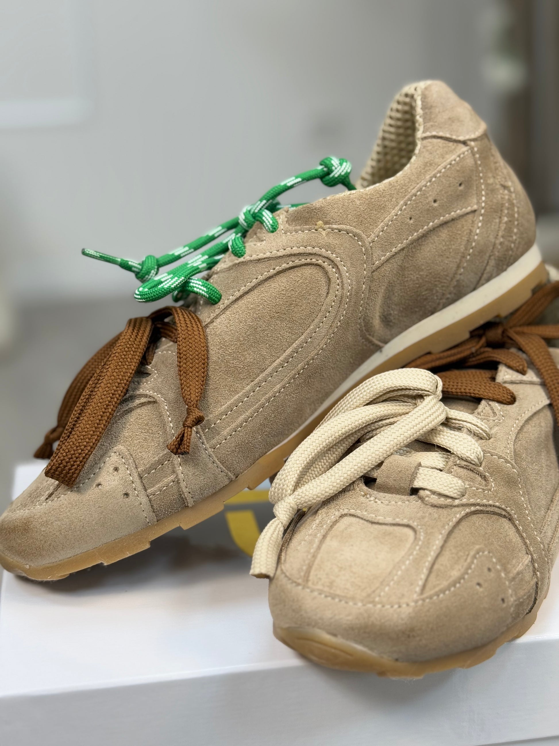 - Descrizione: Divine Follie Sneakers Scamosciate Taupe con lacci bi-color.