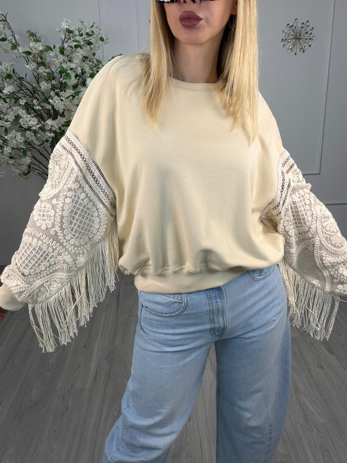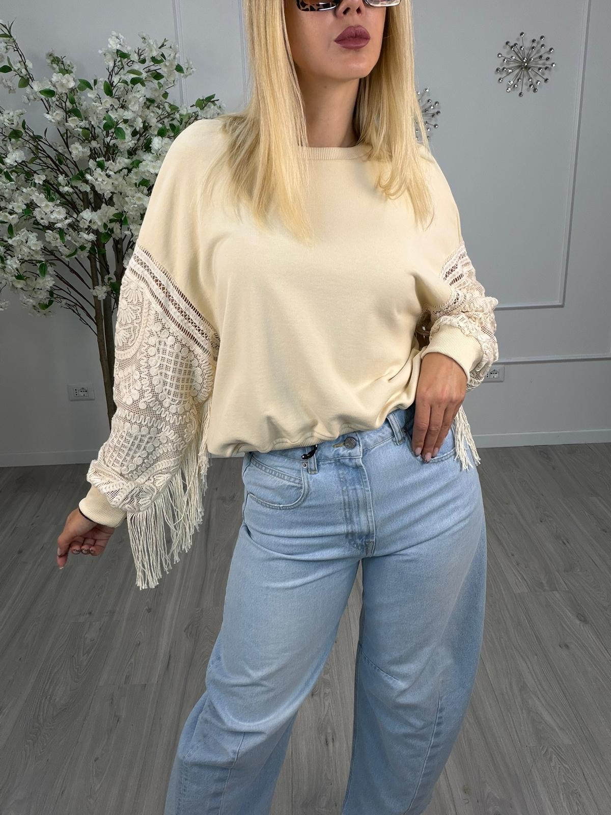 Felpa dal design unico con maniche over caratterizzate da frange e raffinati ricami. Un capo urban-chic che combina comfort e dettagli artigianali.