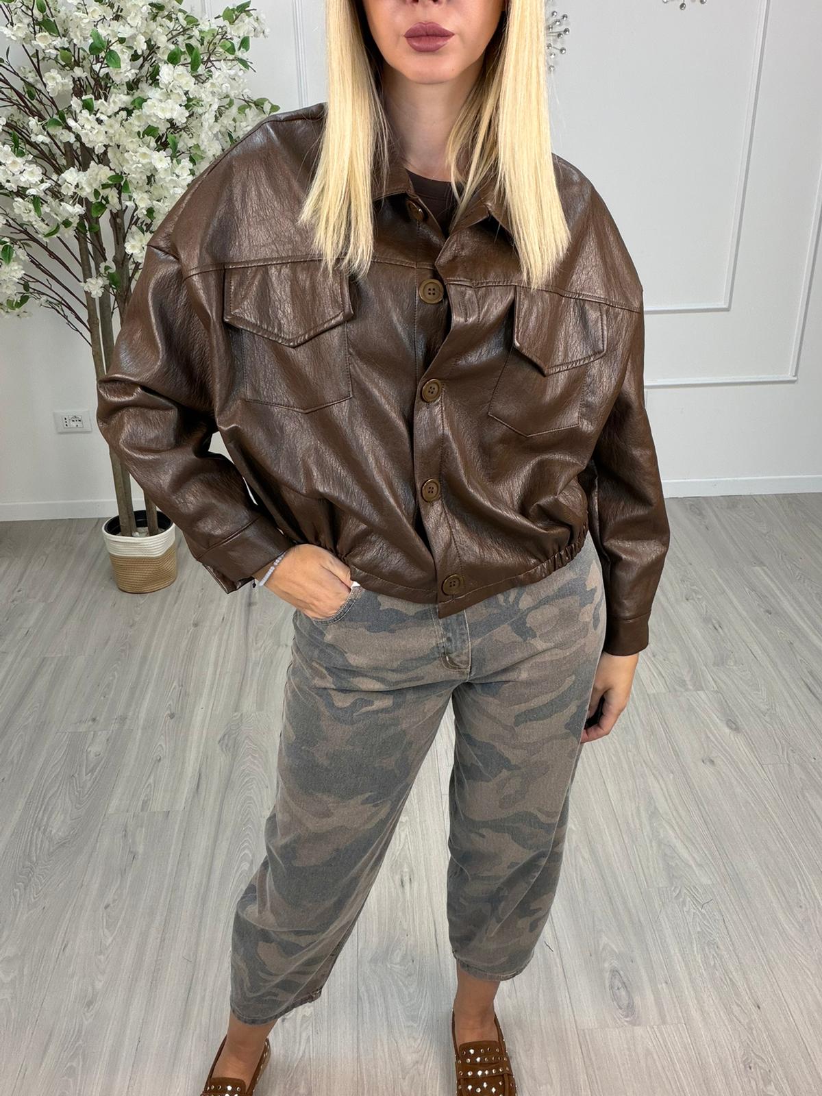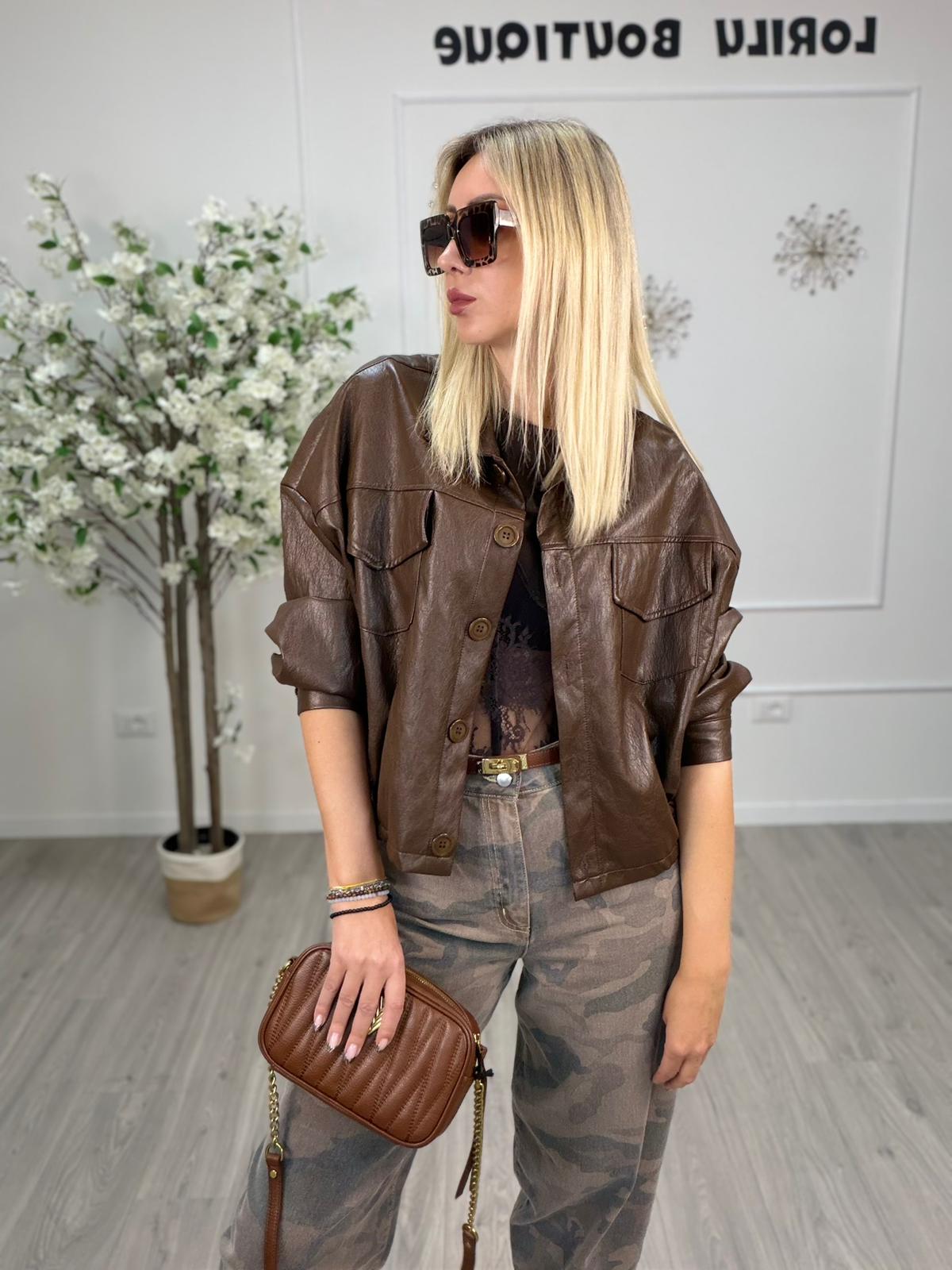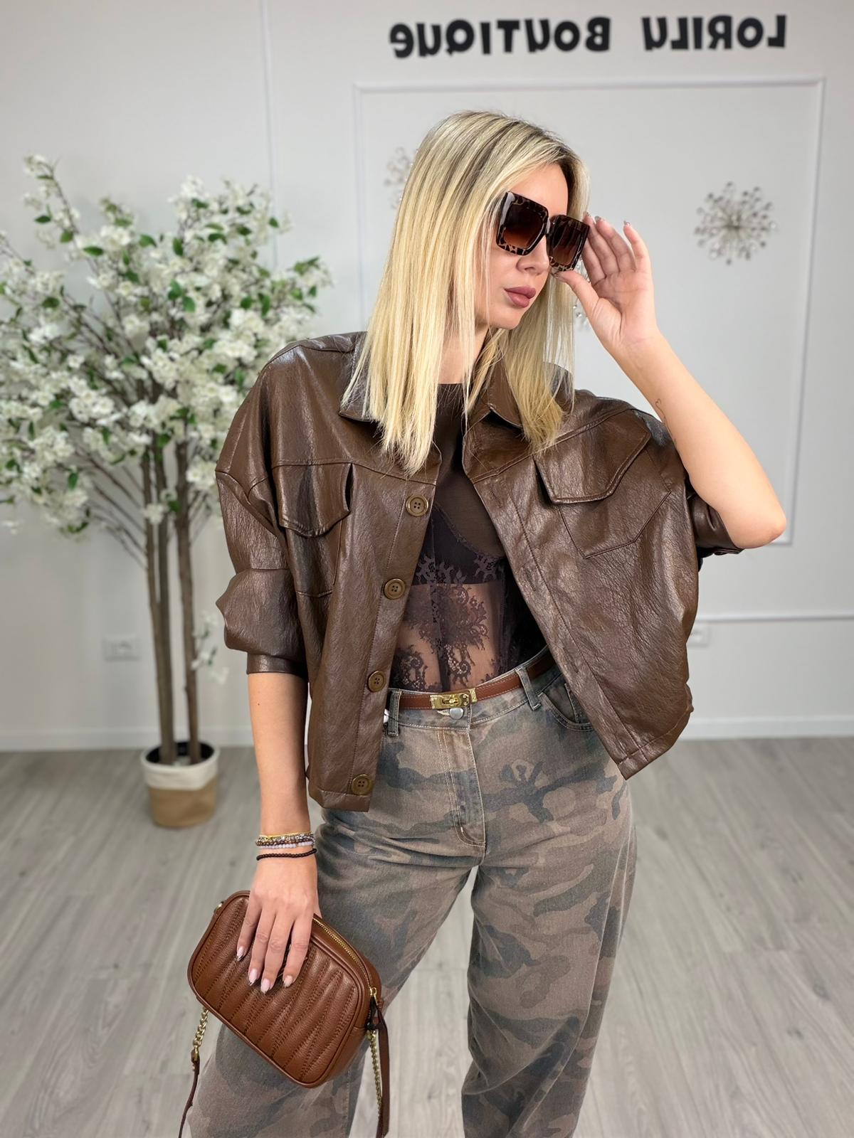 Giacca dal taglio corto in morbida ecopelle marrone, ideale per chi cerca un look deciso e moderno.