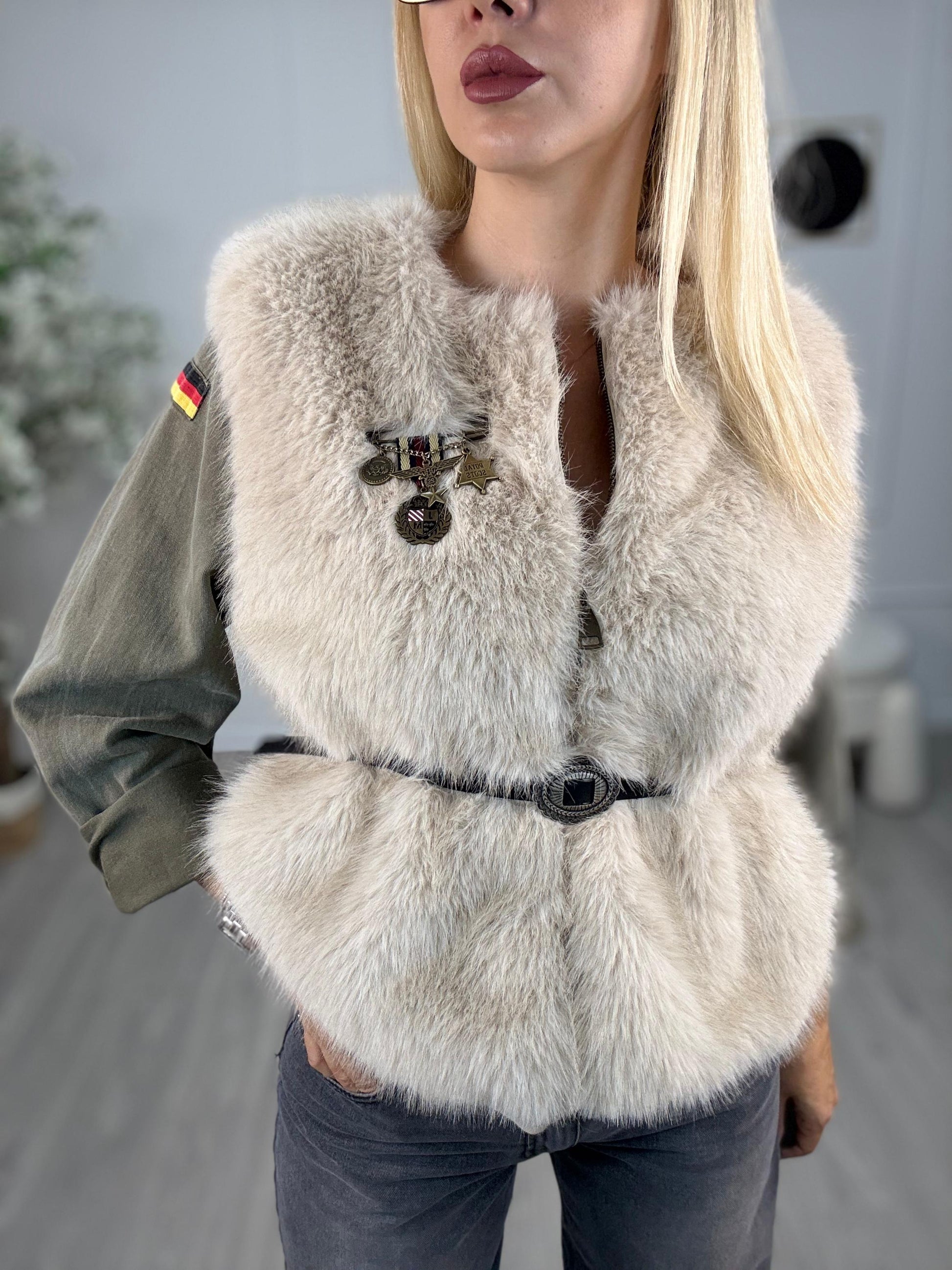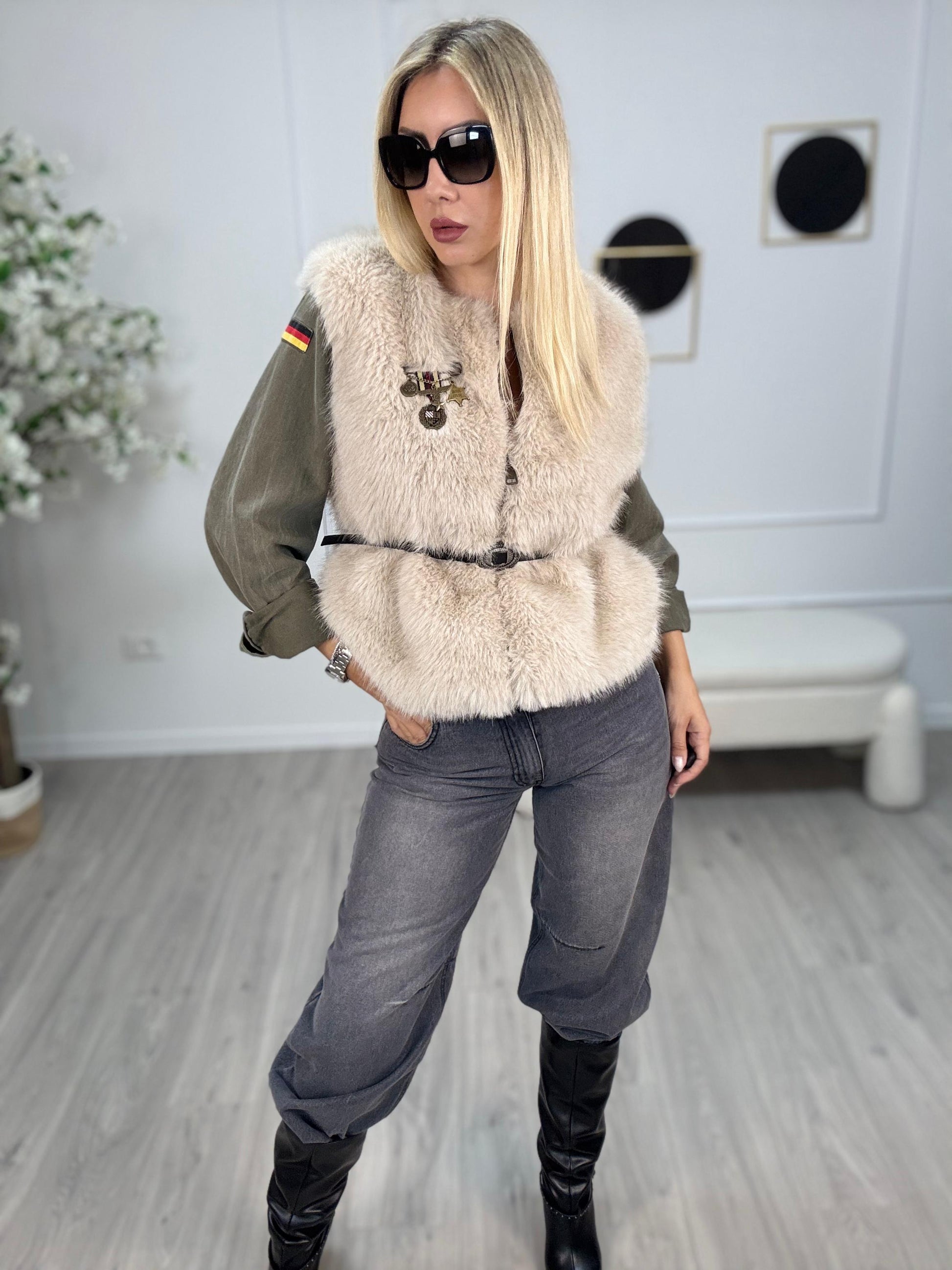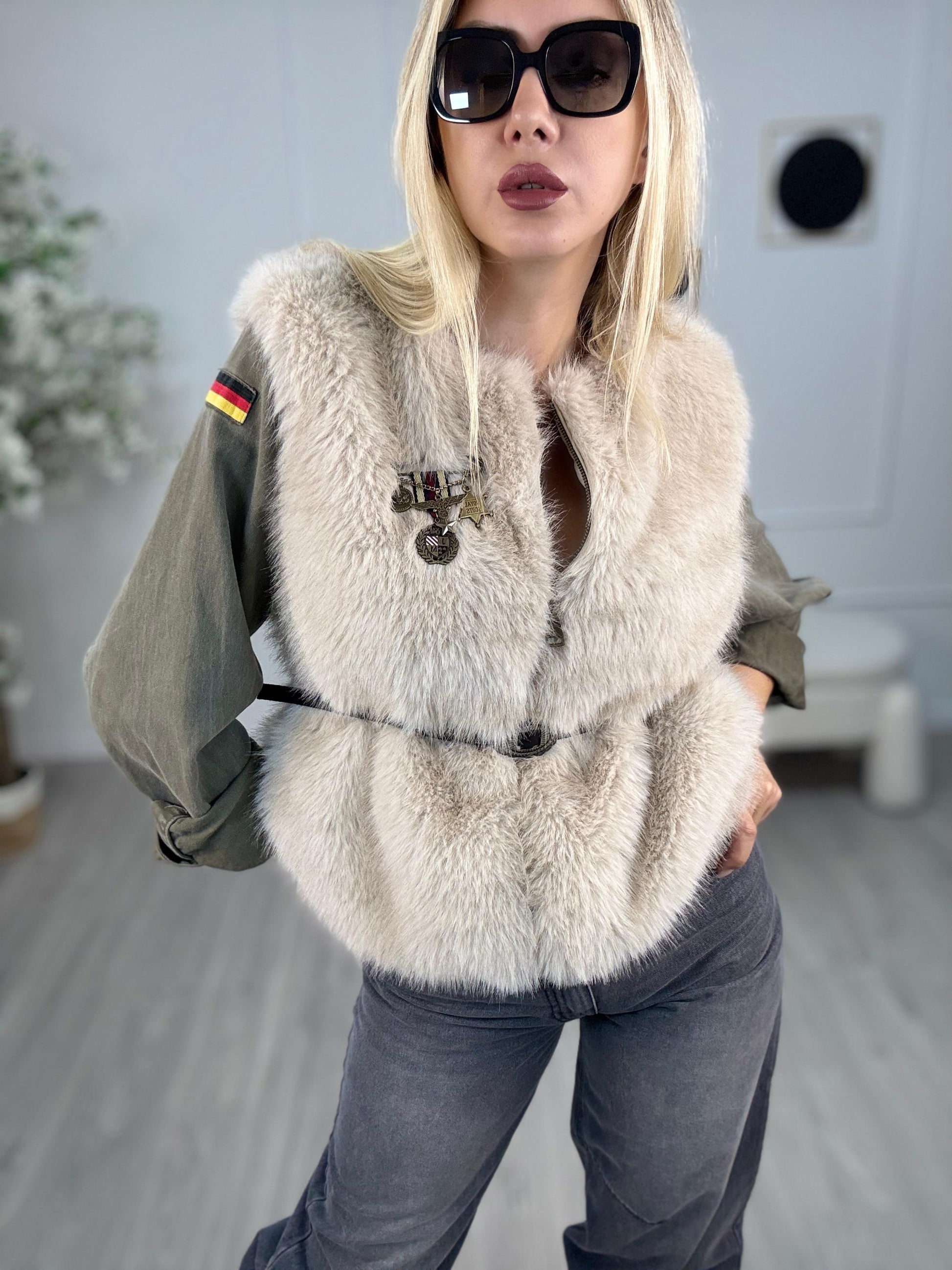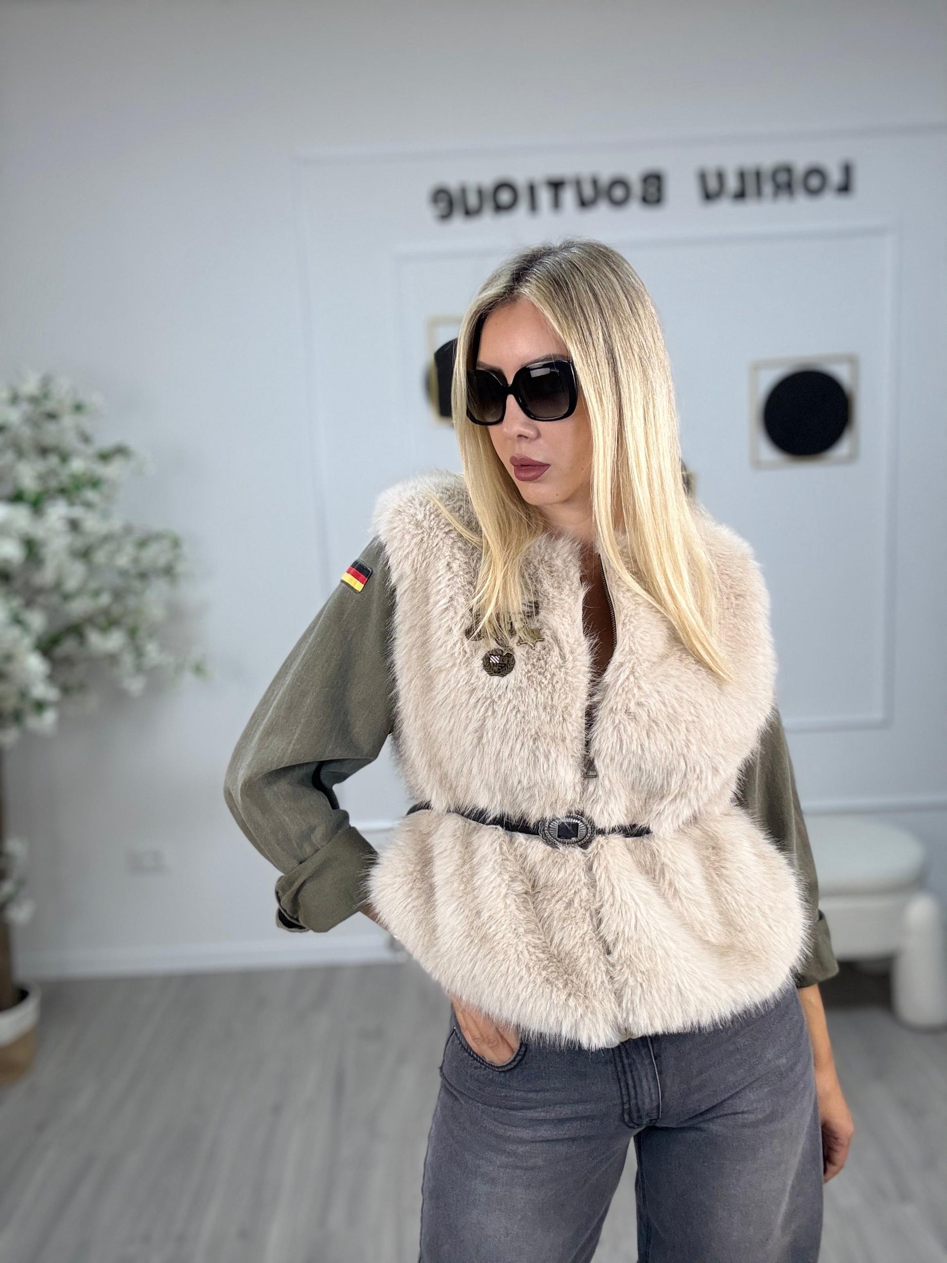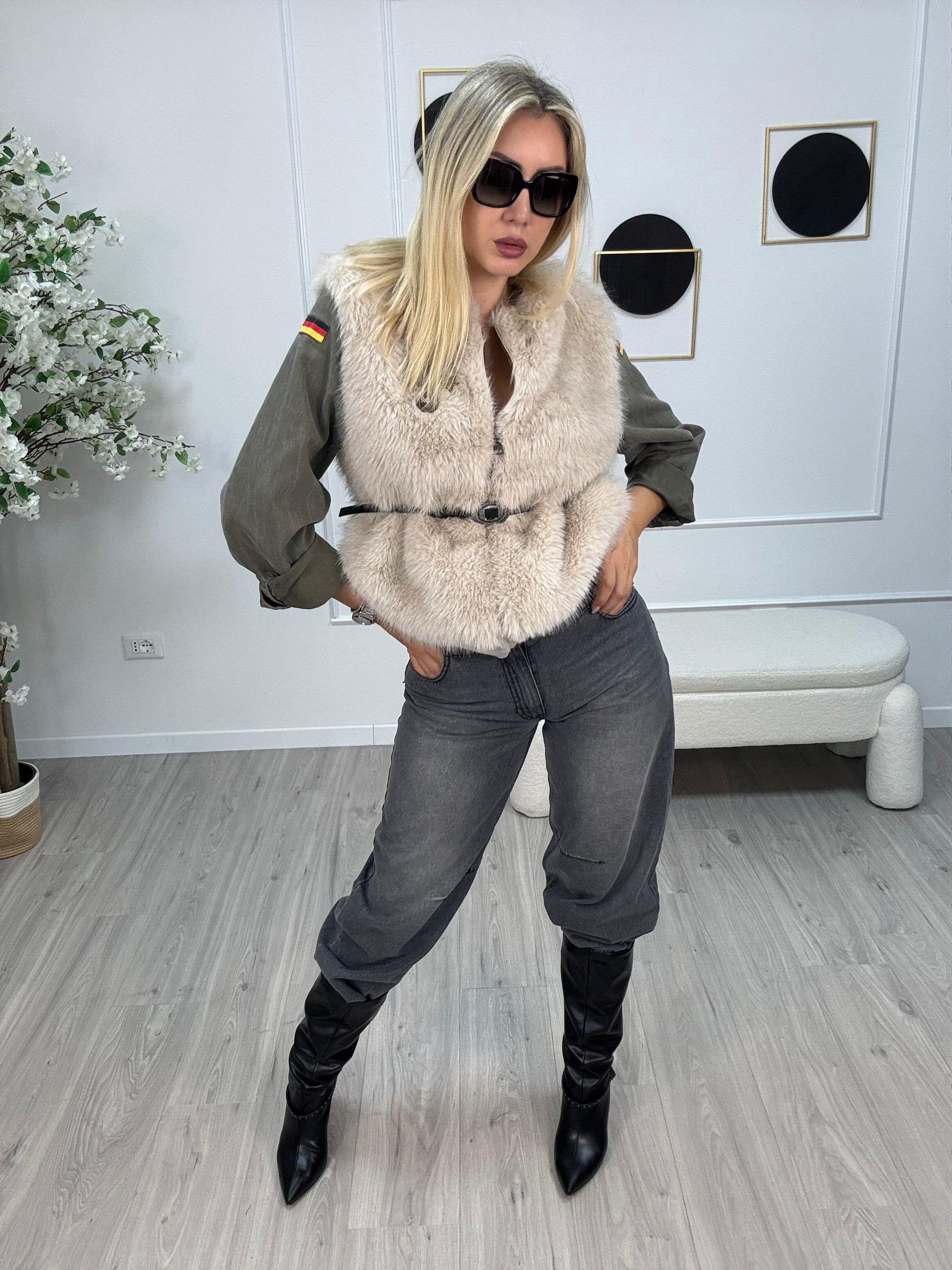 - Descrizione: Giubbotto Ghiaccio Philia Loft con maniche verde militare , accessorio sul petto e cintura. Veste Regolare.