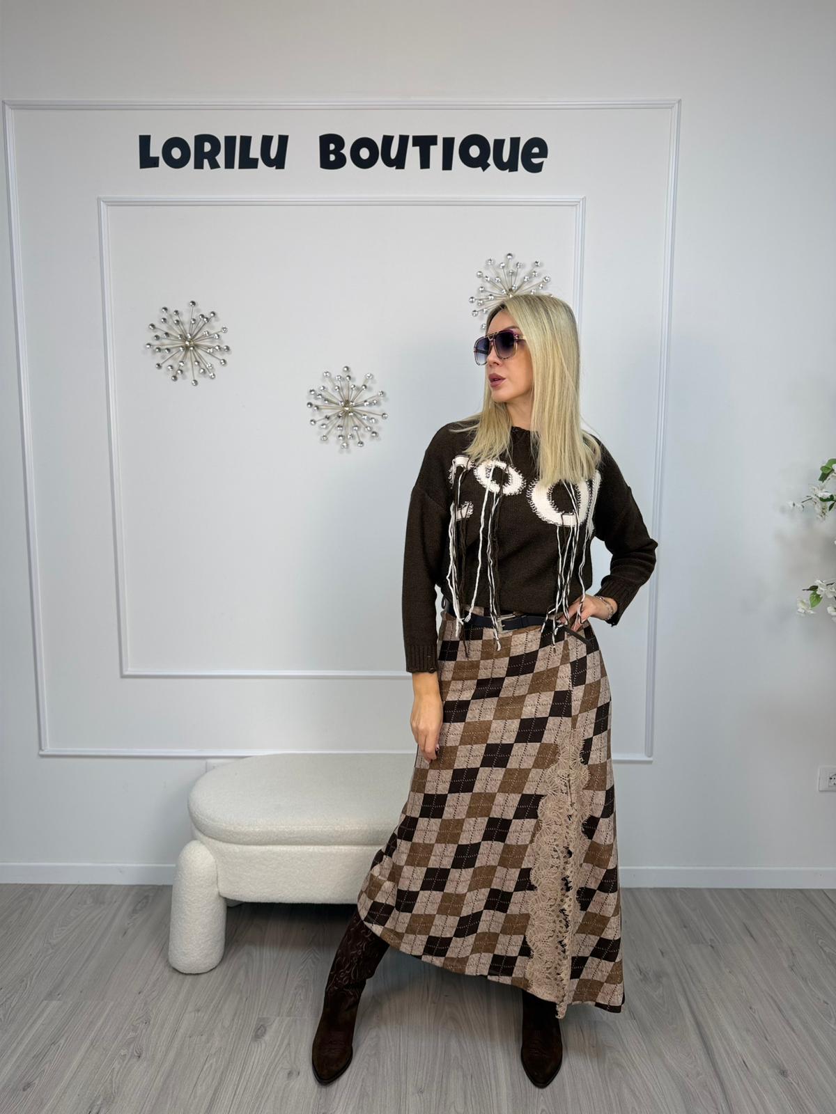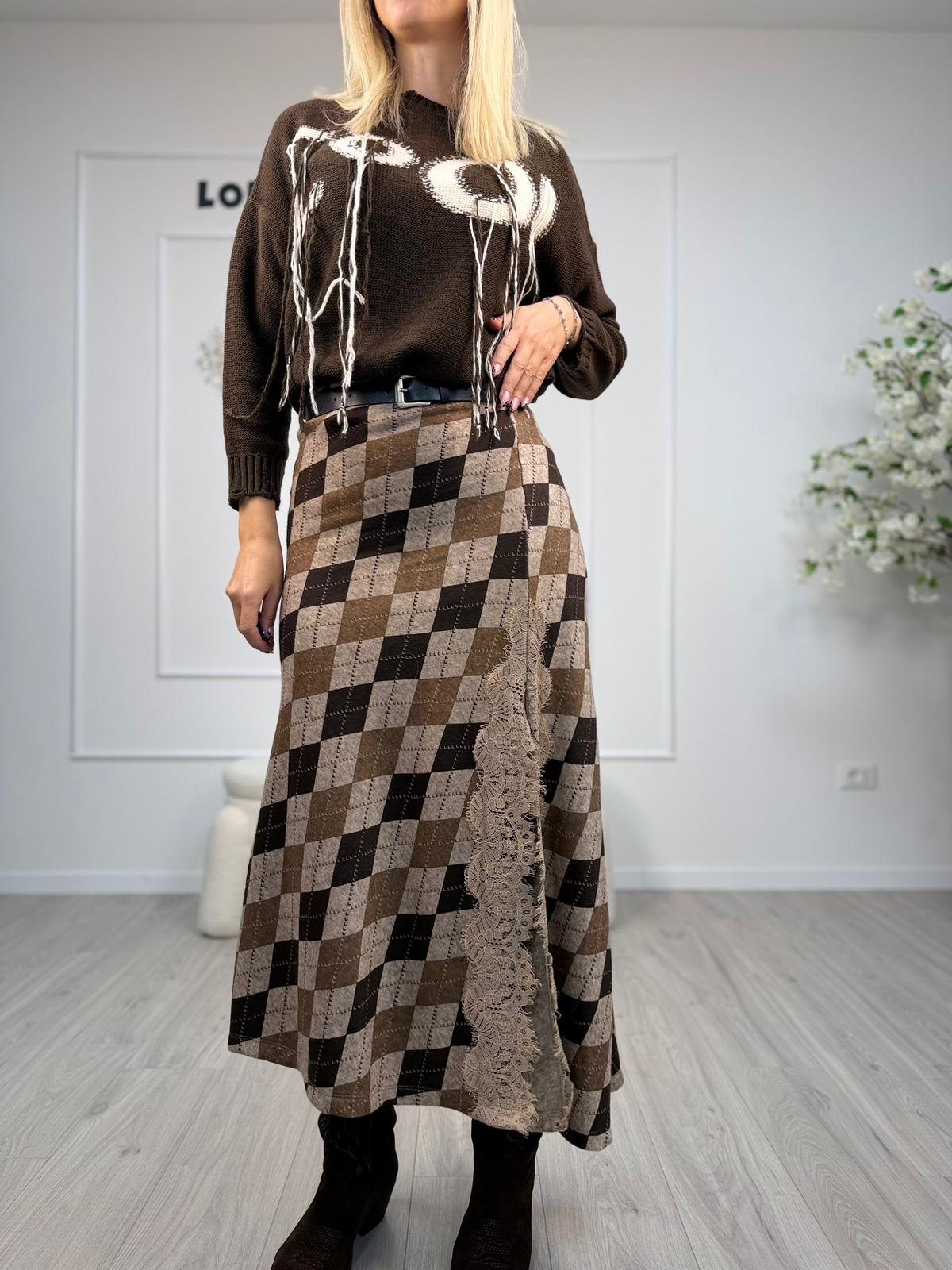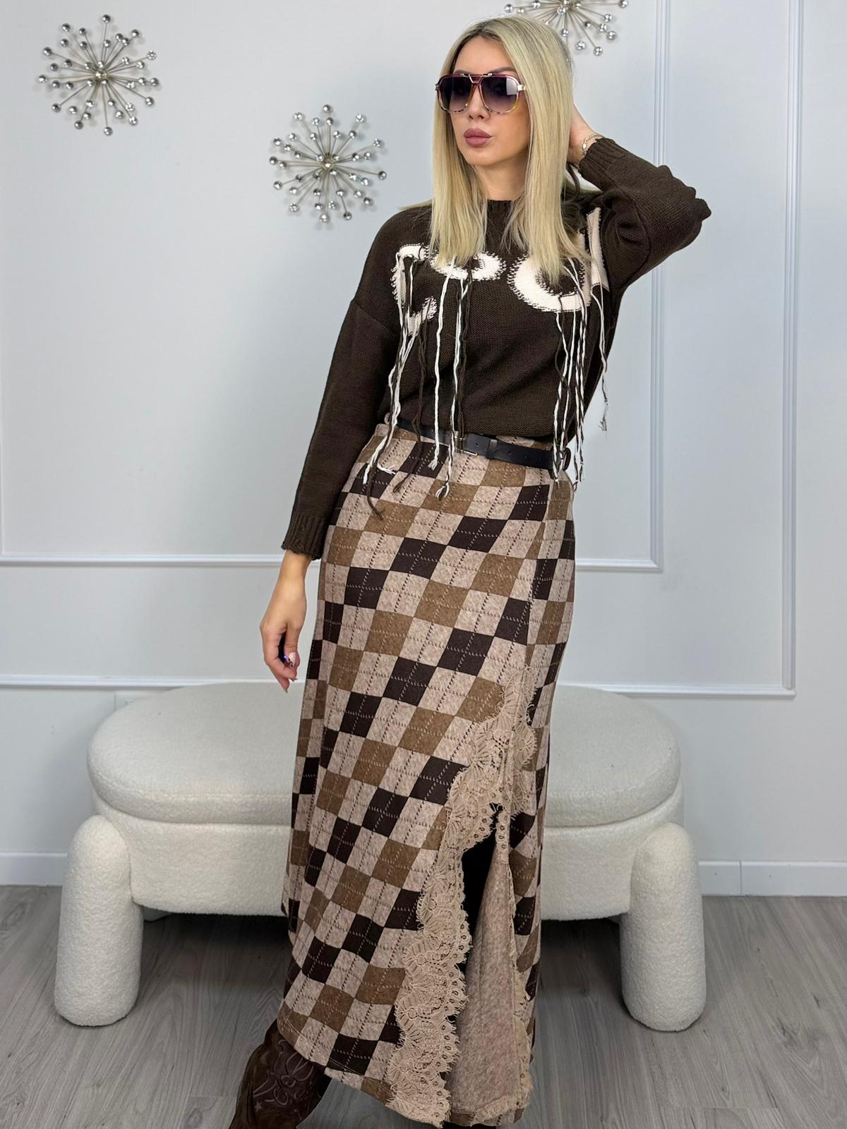 - Descrizione: Gonna lunga HaveOne con un morbido tocco nei toni del marrone e del beige. Presenta un design a vita alta elasticizzata con una cintura in vita e uno spacco laterale impreziosito da pizzo. Il modello ha una vestibilità svasata sul fondo.