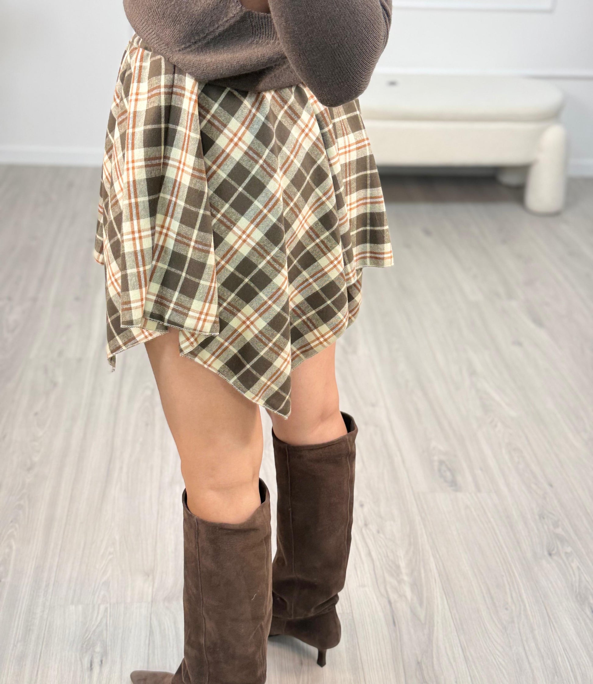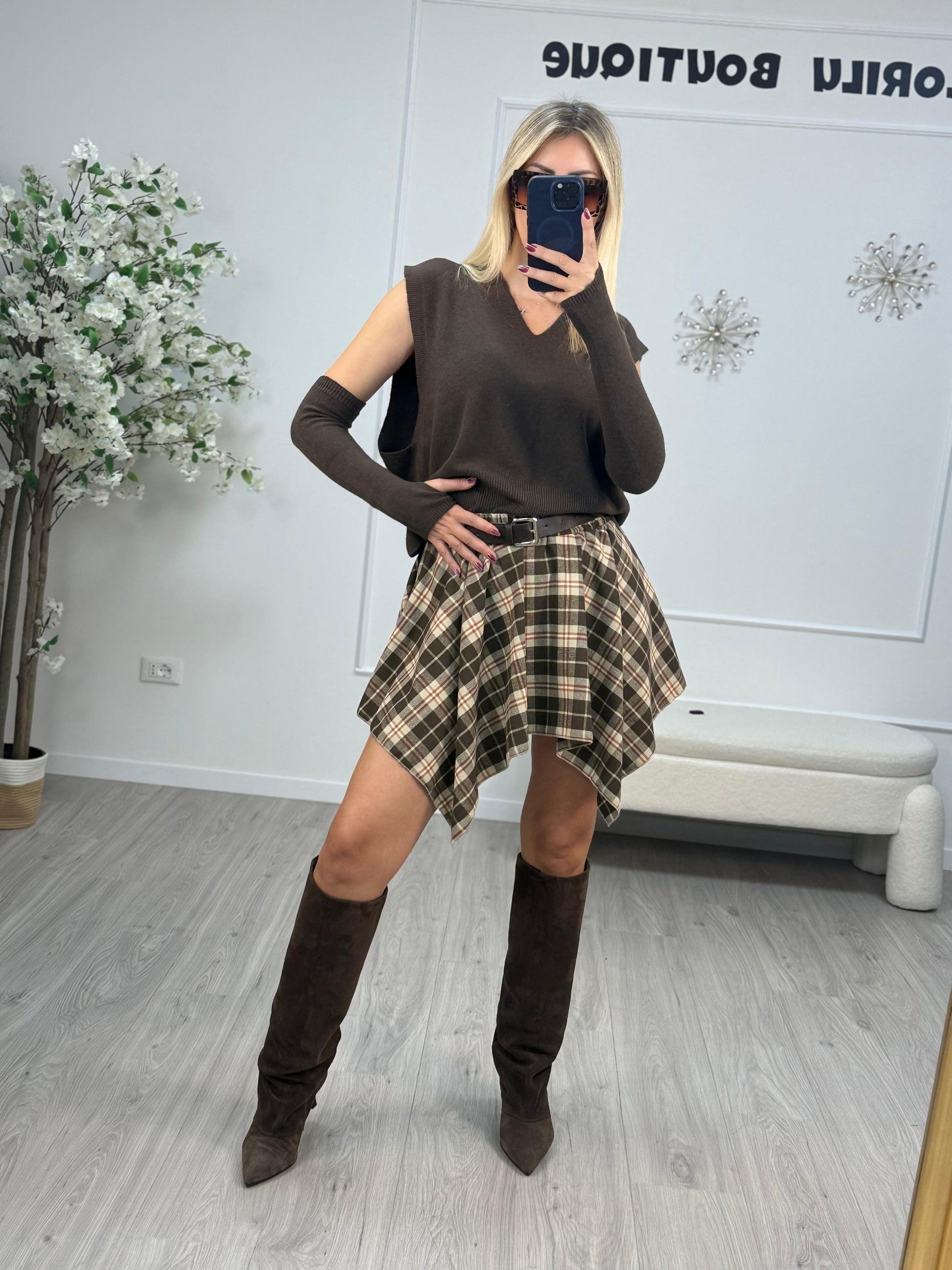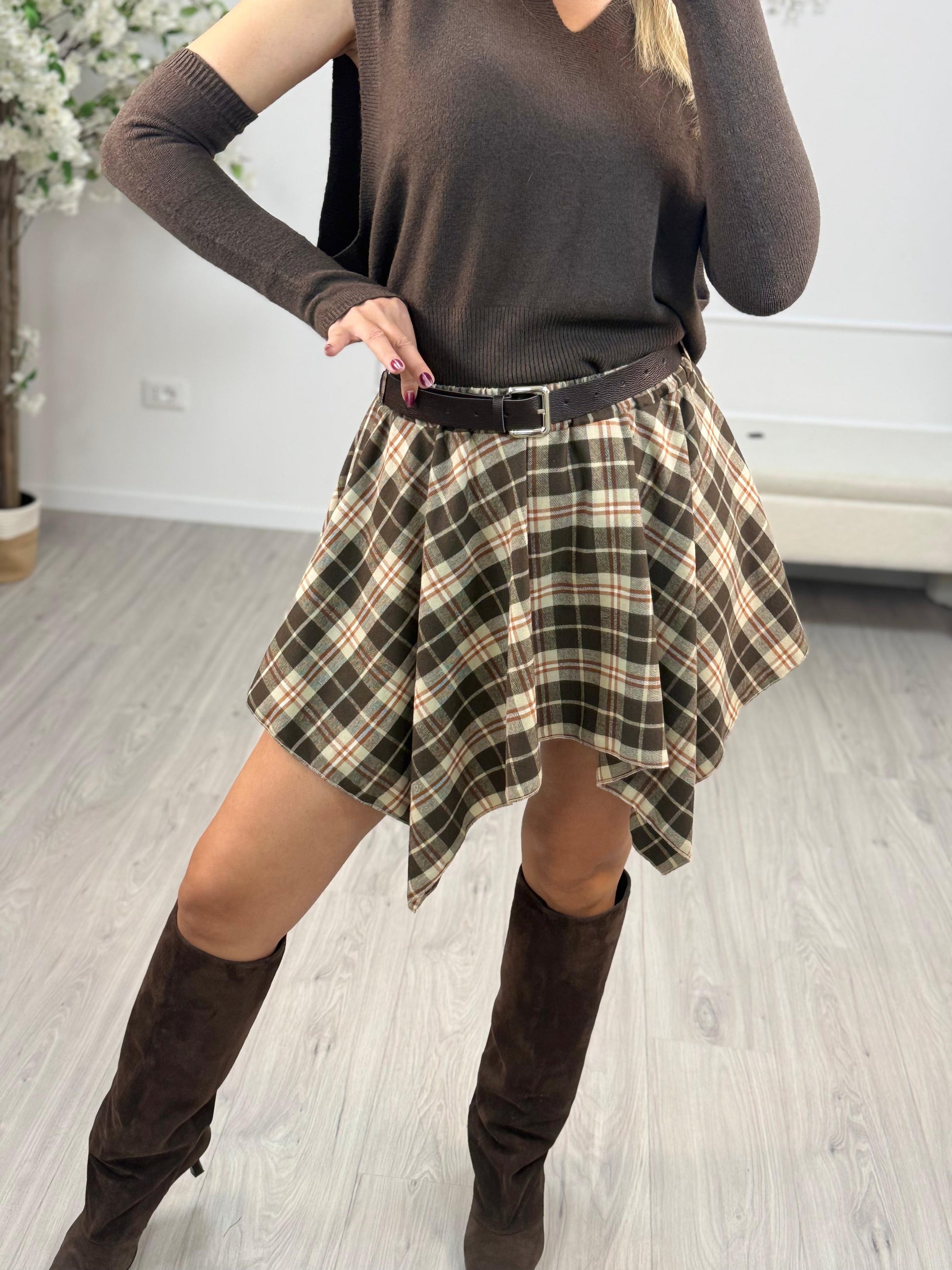 - Gonna check sui toni del moro HaveOne. Modello mini con fondo a punte, vita alta elasticizzata e cintura in vita regolabile.