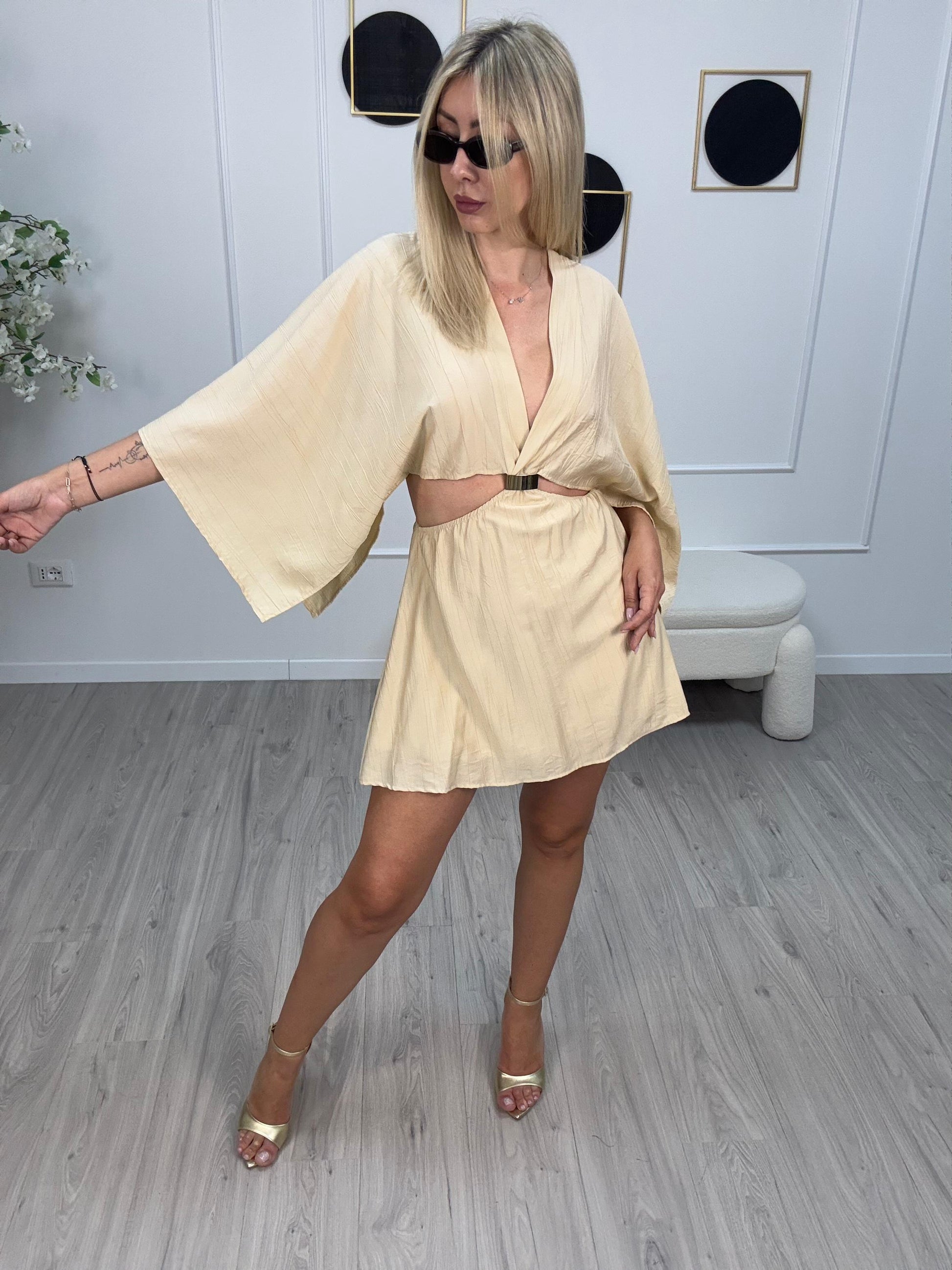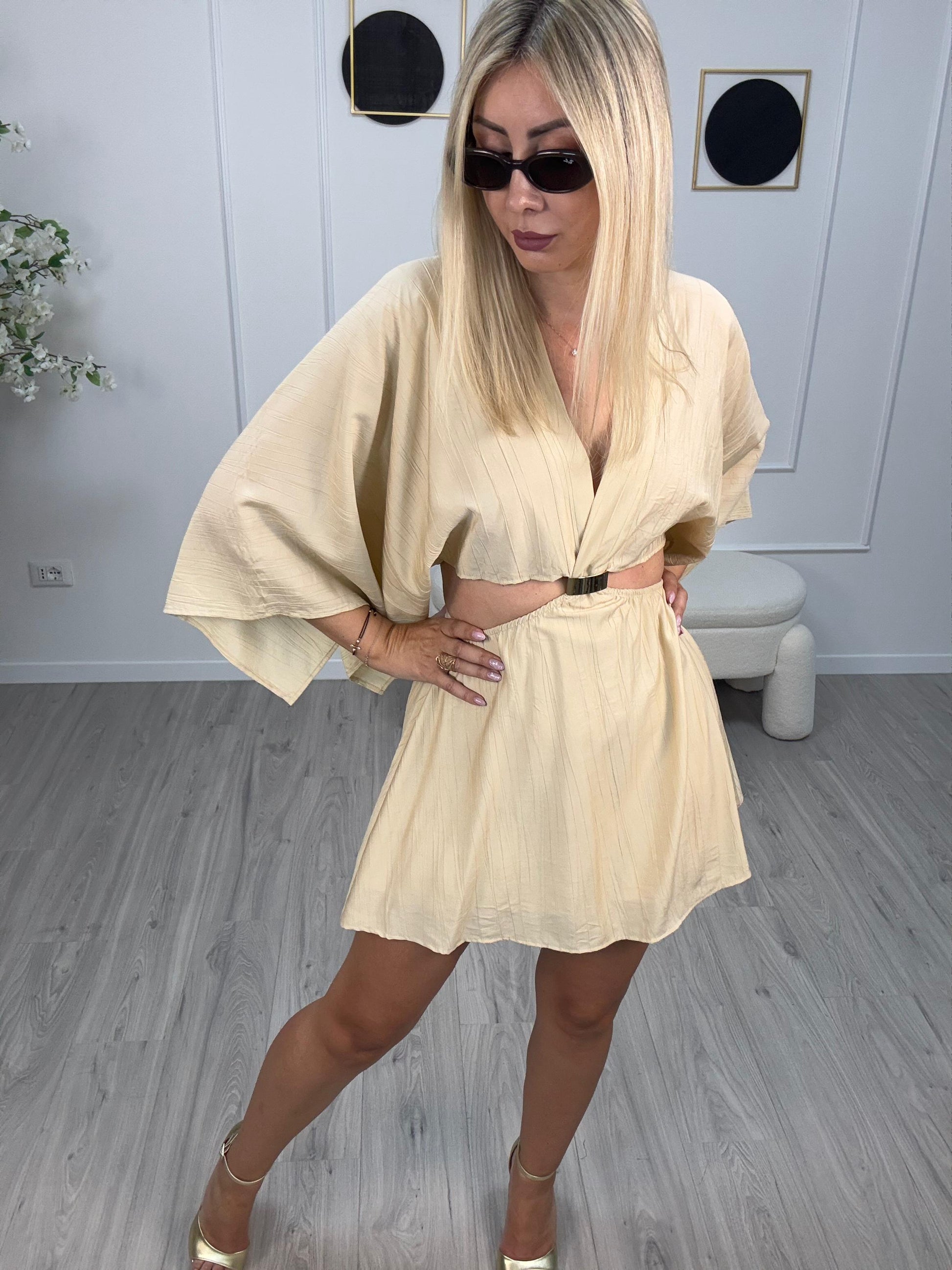 - Abito corto modello farfalla con dettaglio gioiello, gonna doppiata internamente
