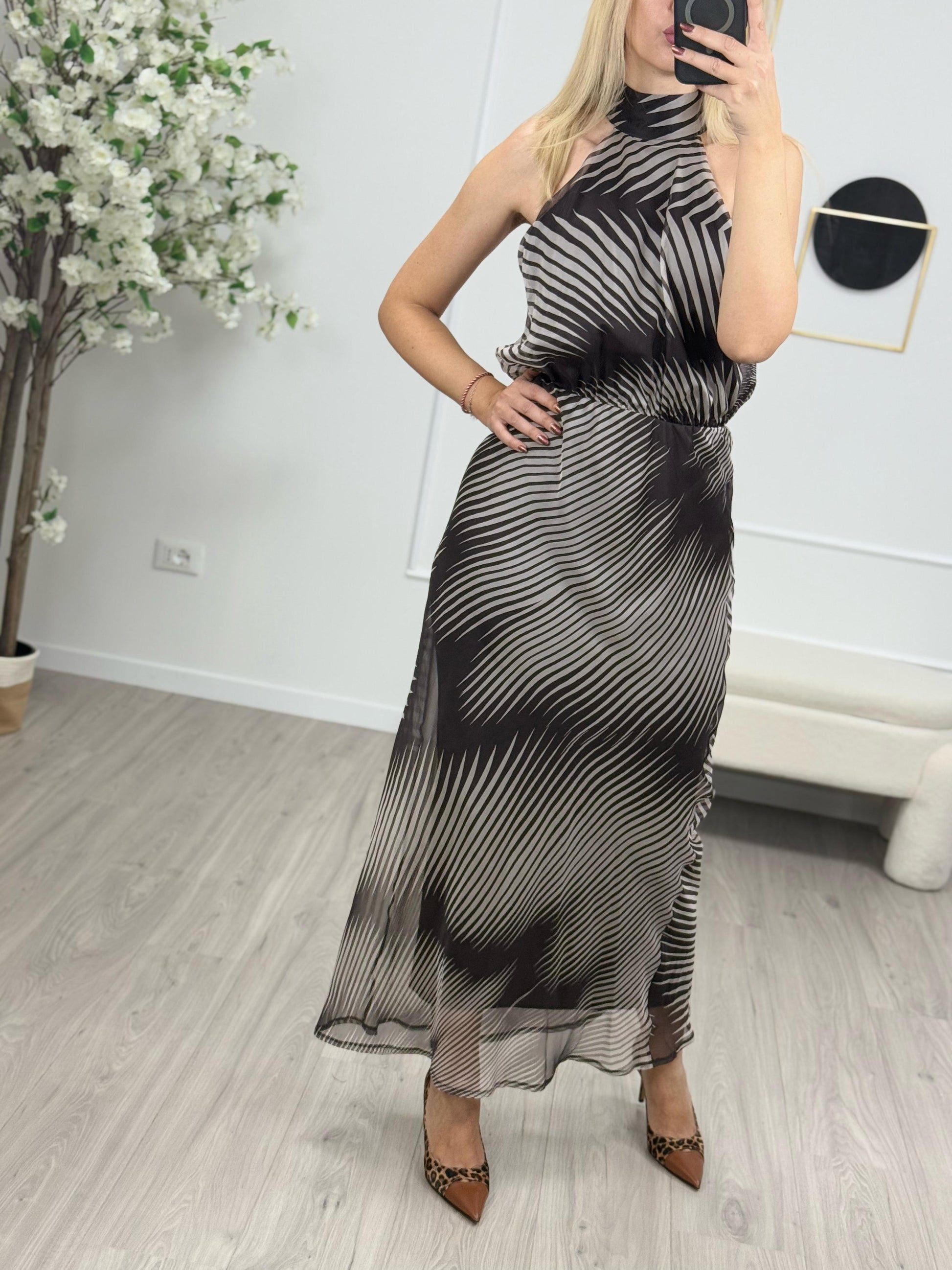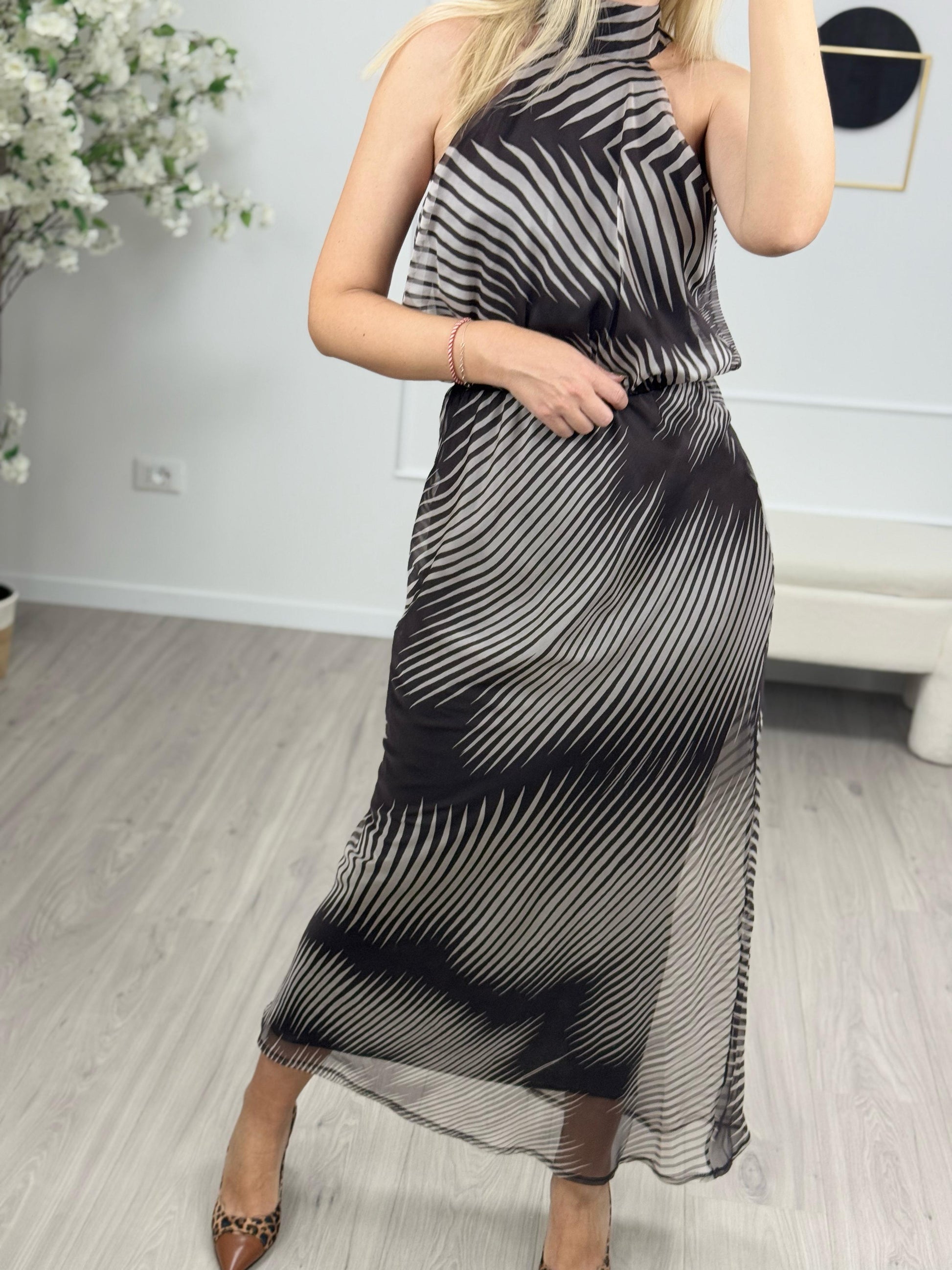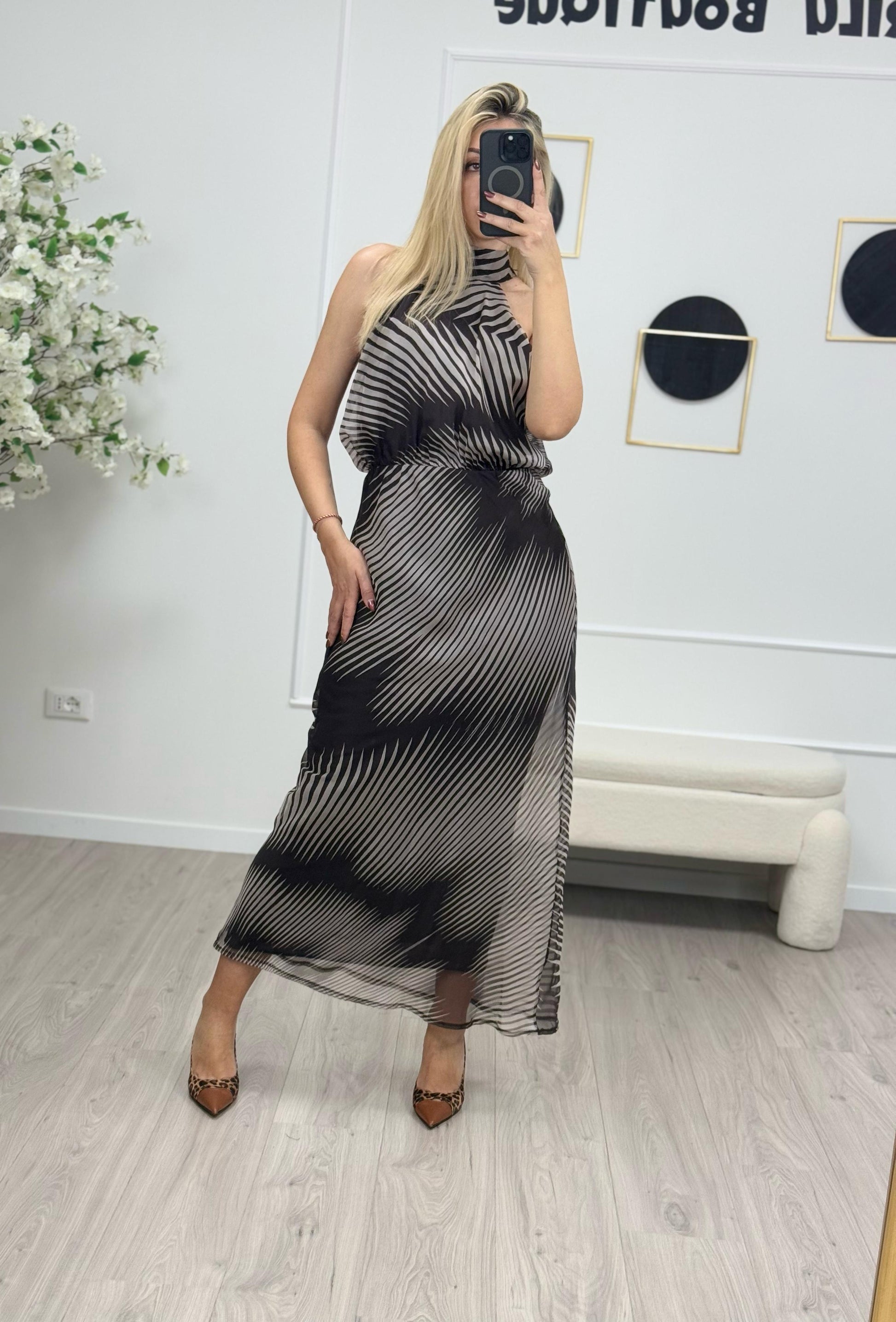 - Questo abito lungo dal taglio sofisticato è perfetto per un look raffinato e femminile. Il design senza maniche con scollo all’americana esalta le spalle, mentre la vestibilità morbida dona leggerezza e comfort. La stampa optical in bianco e moro crea un effetto ottico elegante e moderno. Realizzato in tessuto fluido, è ideale per occasioni speciali, cene eleganti o eventi serali. Chiusura con bottoncini dietro al collo, morbido elastico in vita.