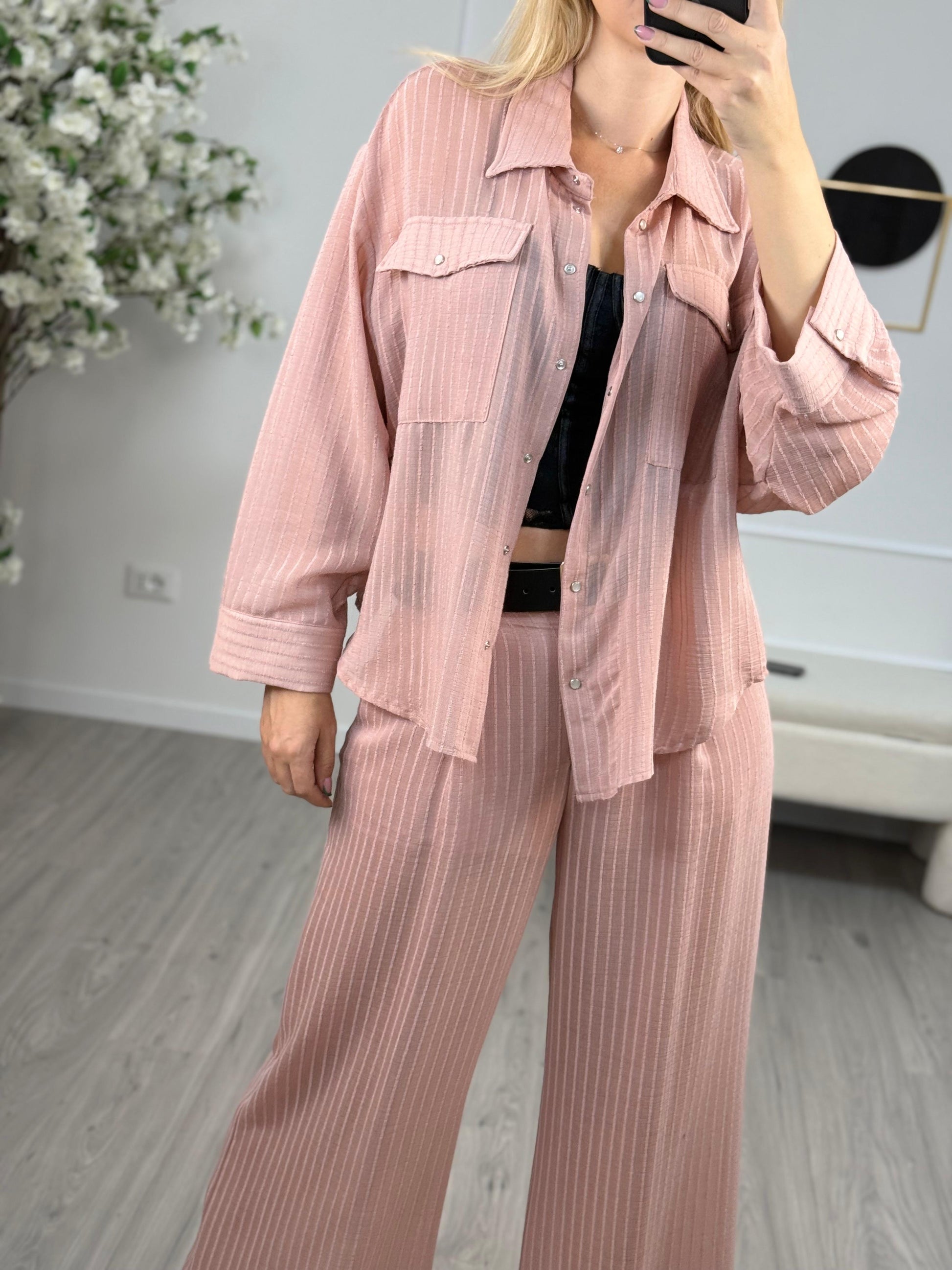 - Camicia in viscosa color rosa gessatura in rilievo HaveOne. Modello fit oversize con colletto e chiusura frontale con bottoni. Tasca lato cuore.
