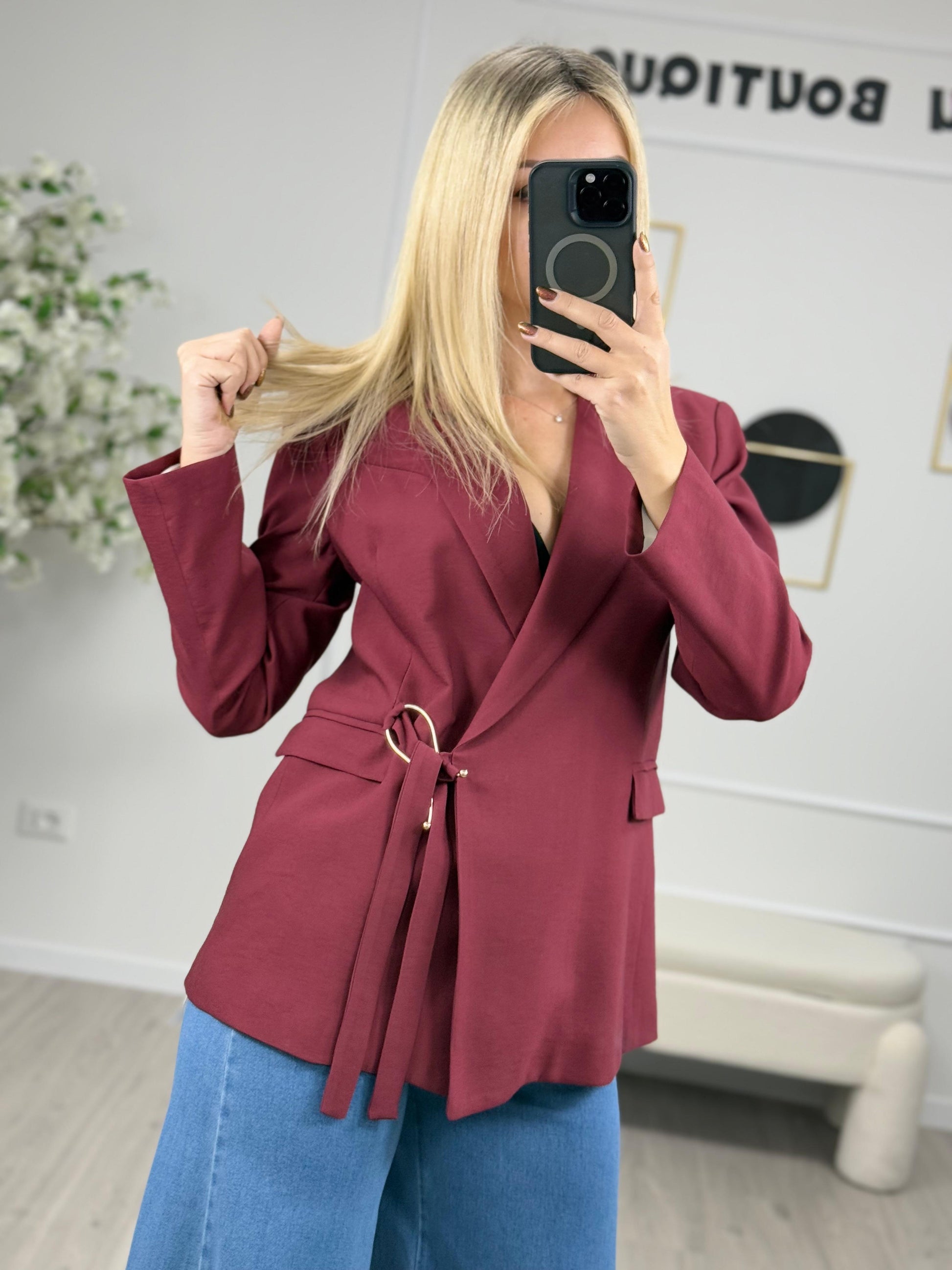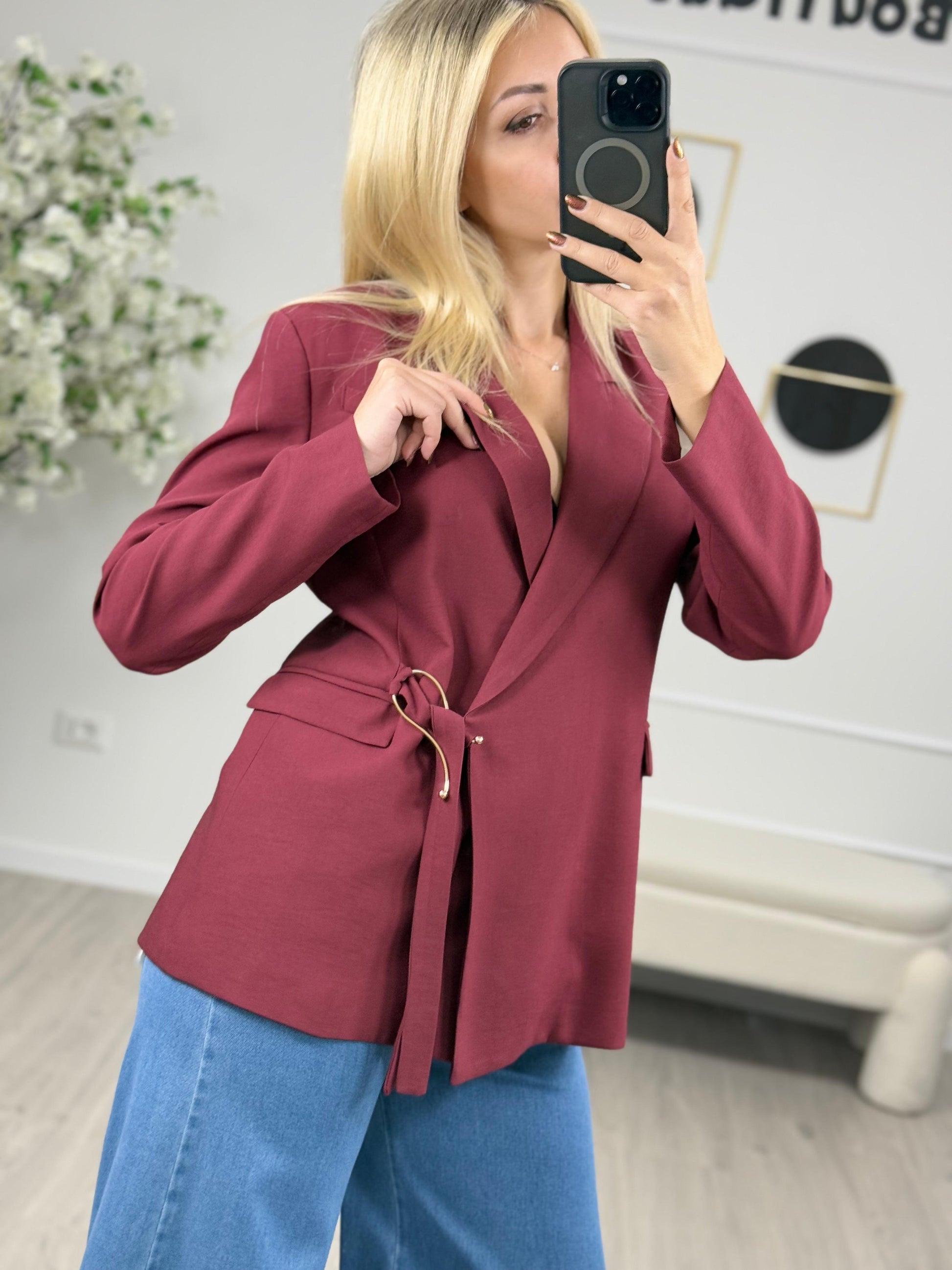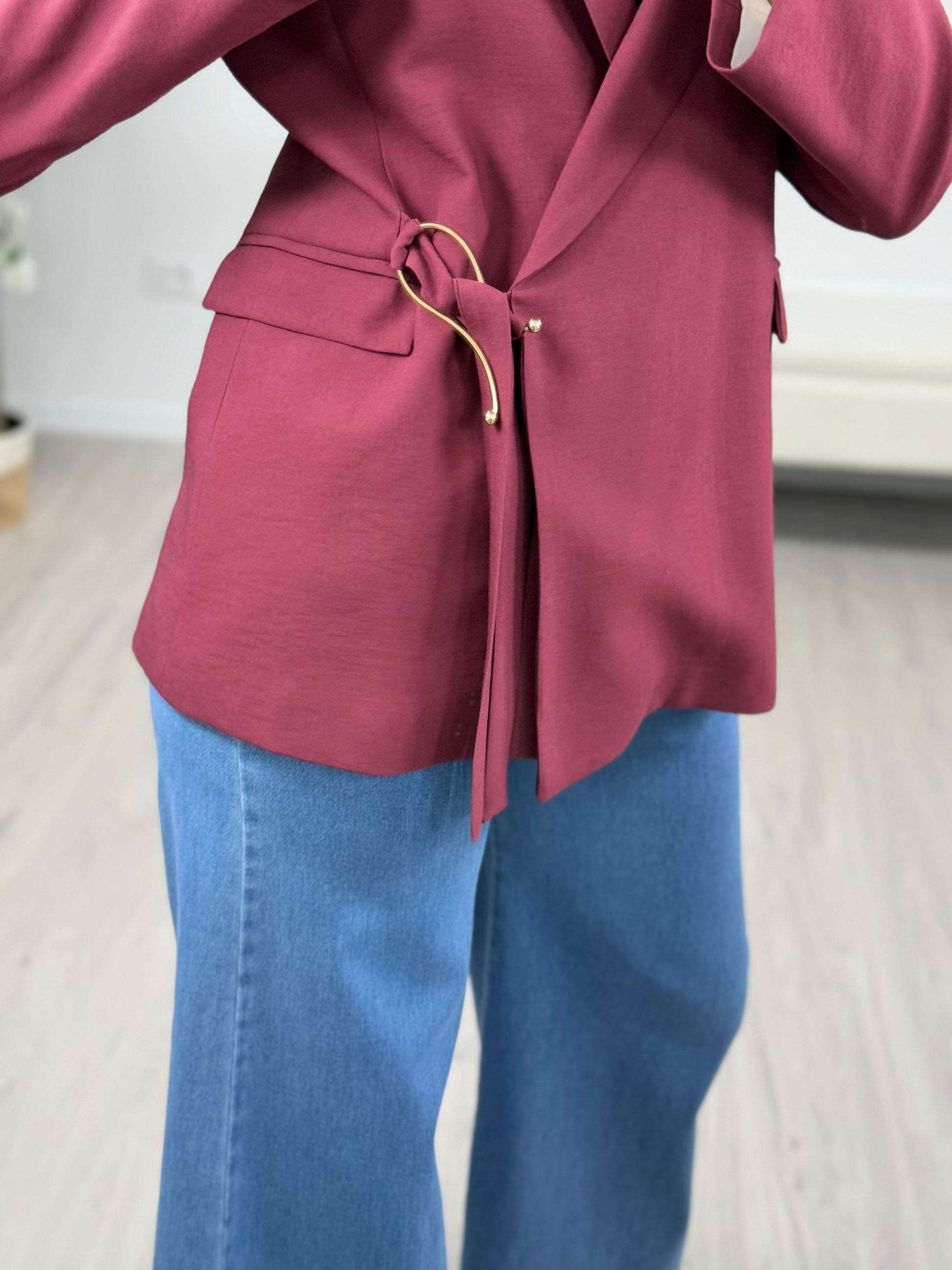 Descrizione: Haveone Giacca Doppiopetto Bordo Giacca color bordo HavaOne. Modello chiusura doppiopetto con bottone interno e dettaglio di laccetti da annodare al gancio dorato. Tasche con patta.