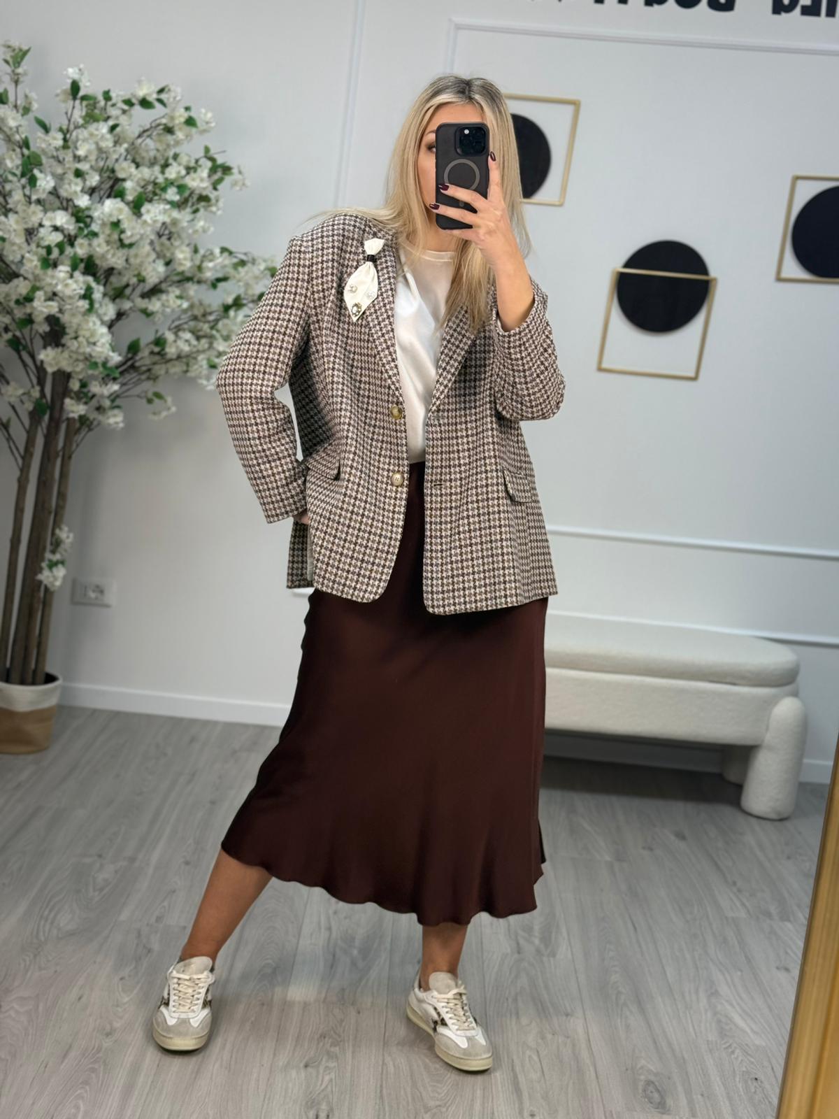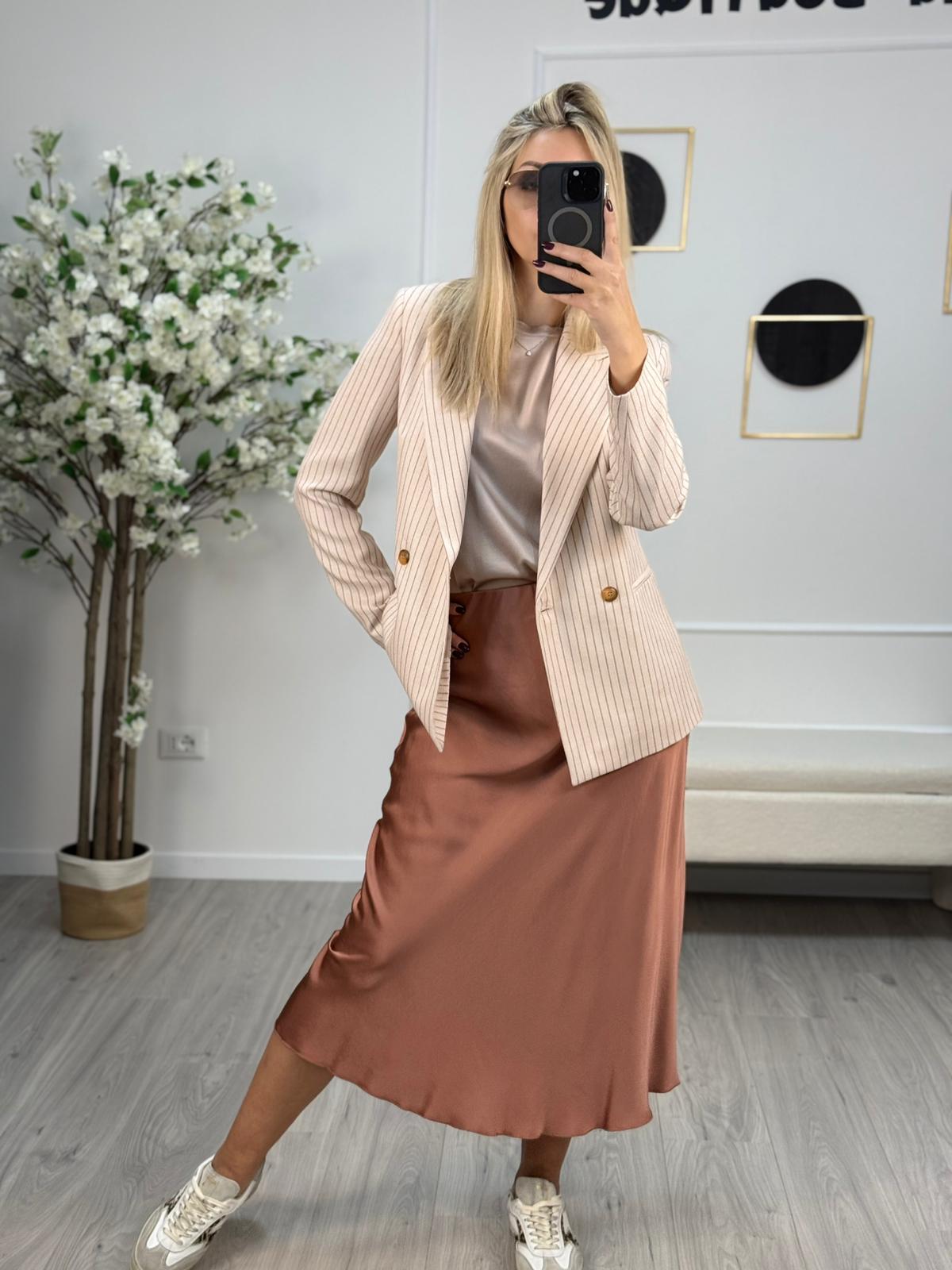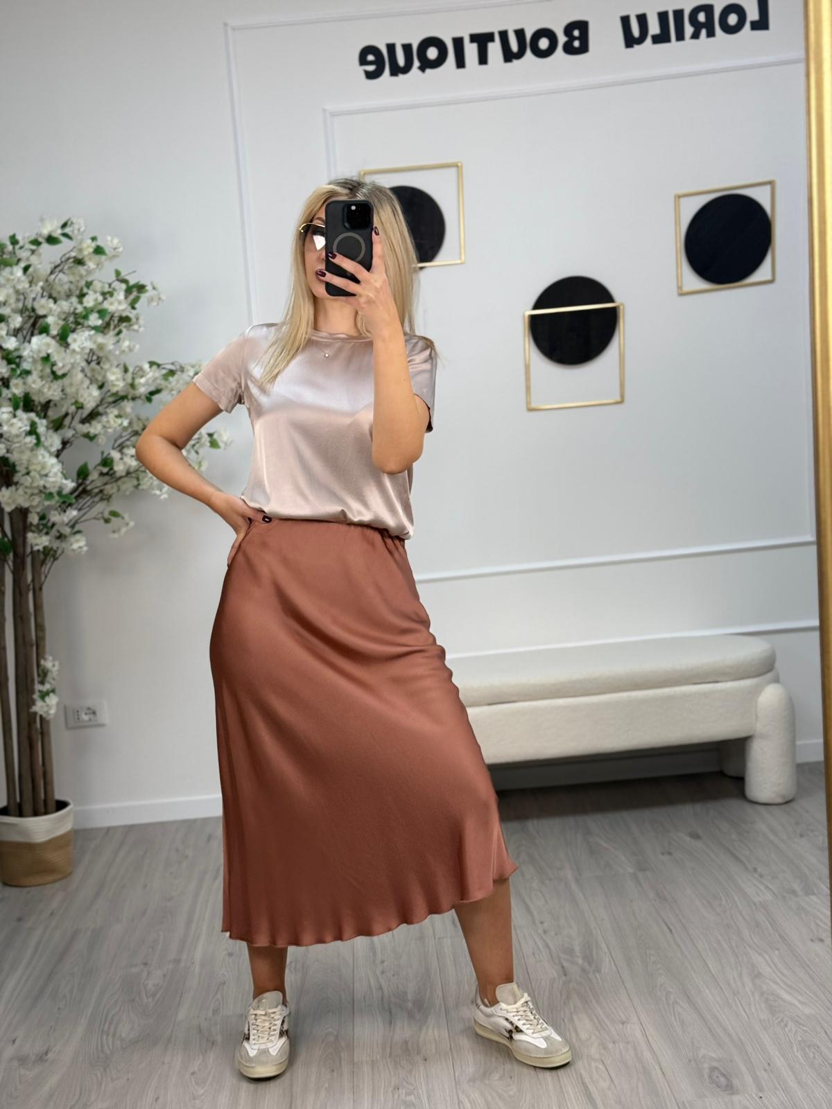 - Fluida e raffinata, questa gonna sottoveste in raso di viscosa scivola con eleganza fino a metà polpaccio. Perfetta da abbinare alla sua blusa coordinata per un look sofisticato e senza tempo.