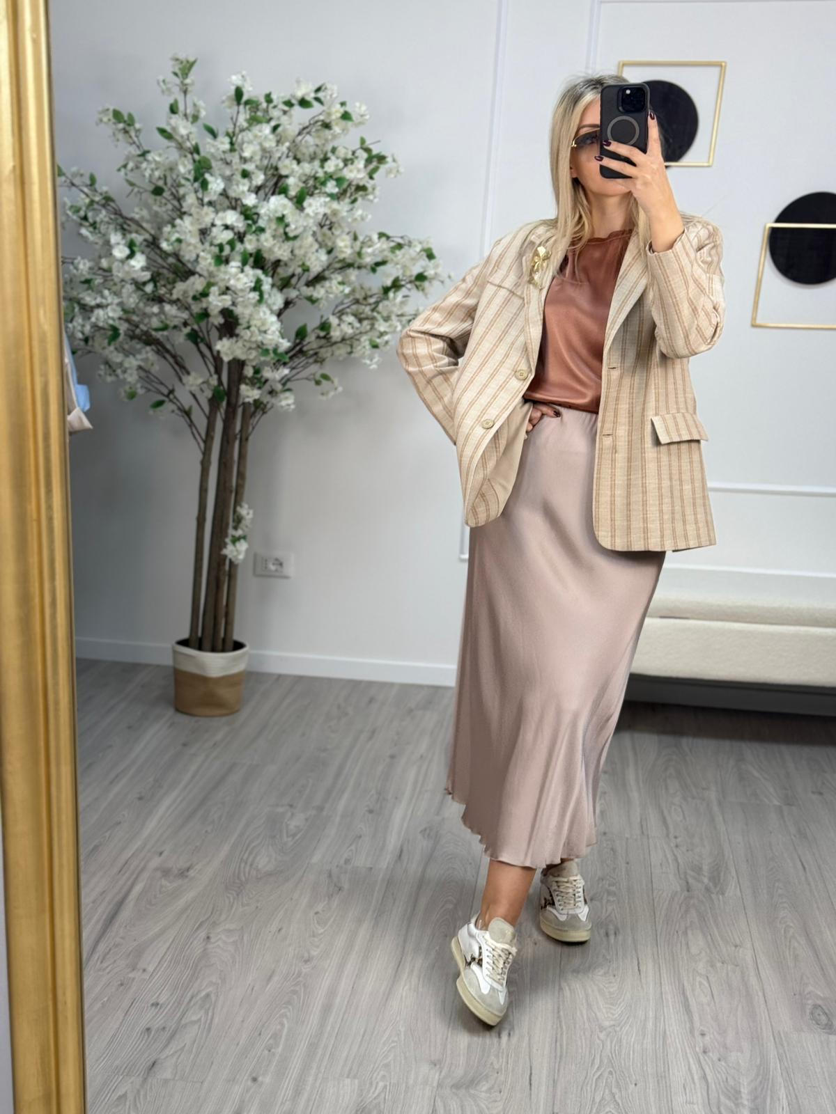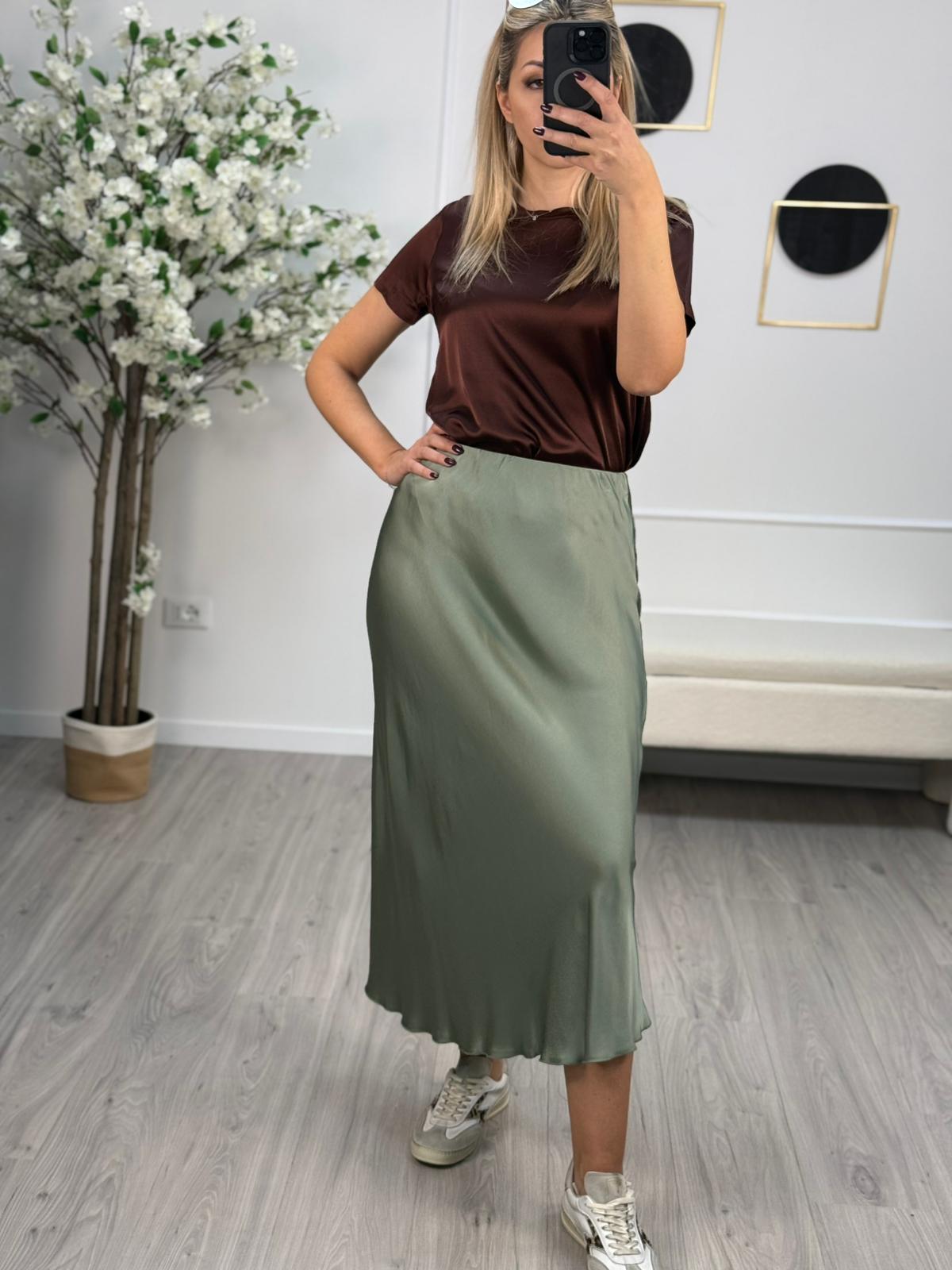 - La gonna in raso di viscosa della collezione primavera/estate di Haveone è caratterizzata dal design midi con lunghezza a metà polpaccio, modello sottoveste ed elastico in vita.