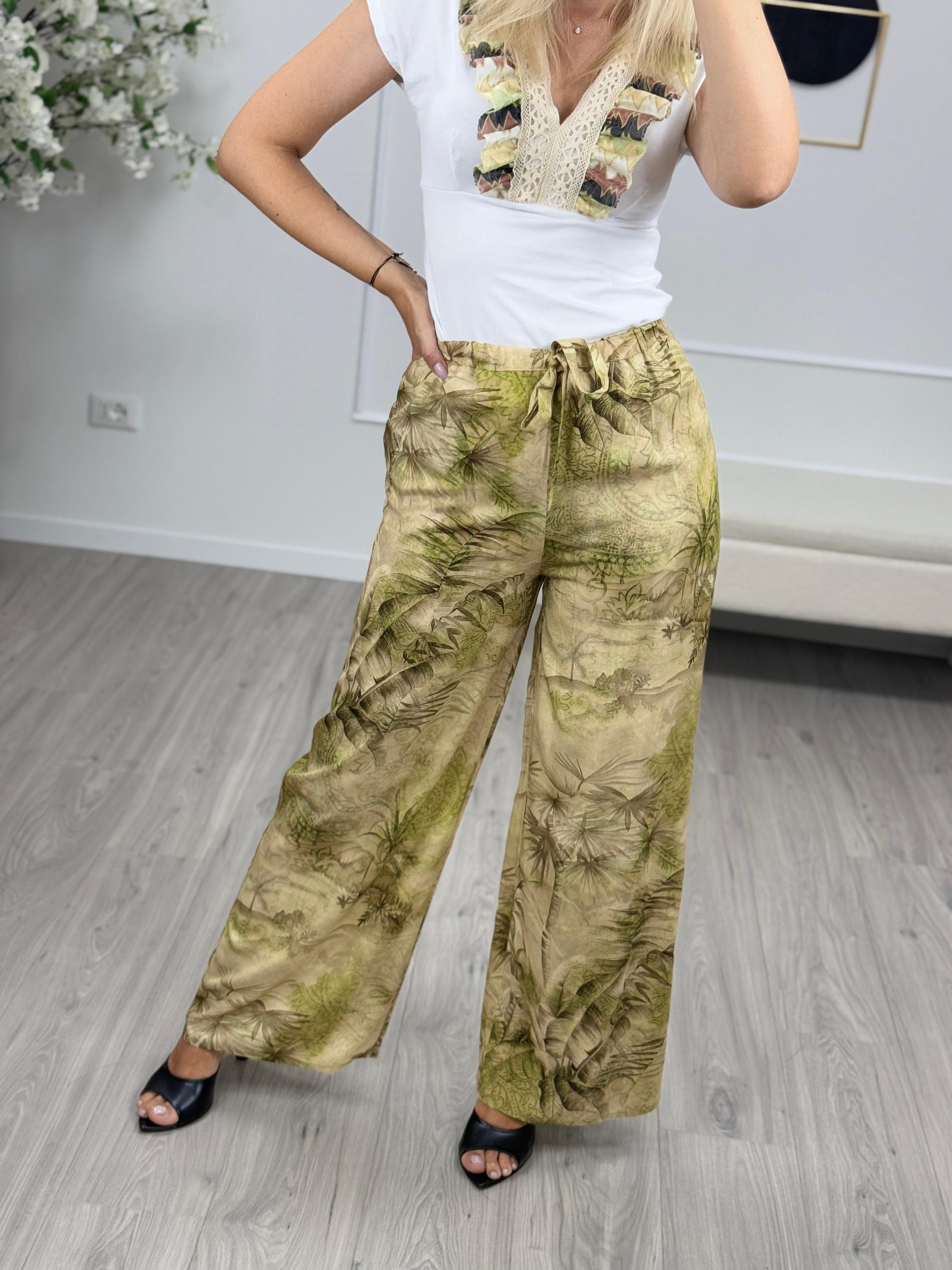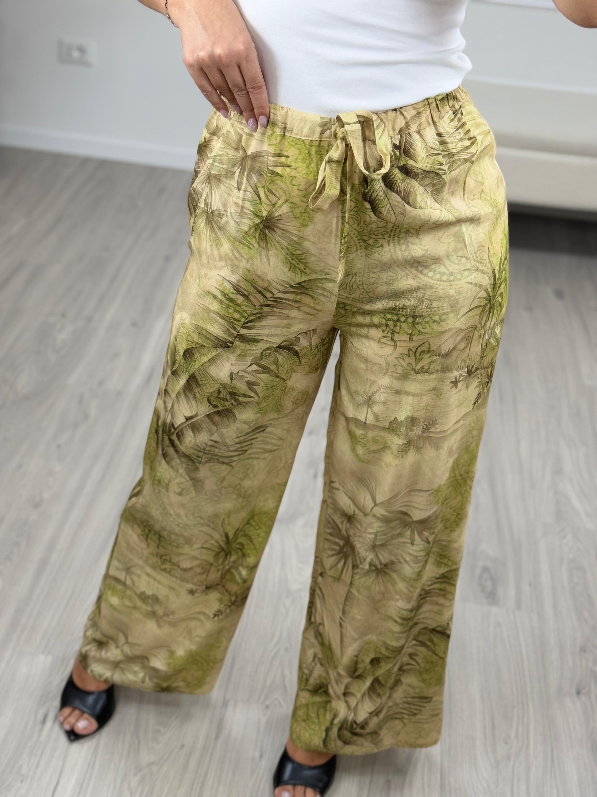 - Descrizione: Pantaloni Olio fantasia Eden color olio HaveOne. Modello wide leg fit a gamba morbida, vita medio alta e coulisse regolabile.