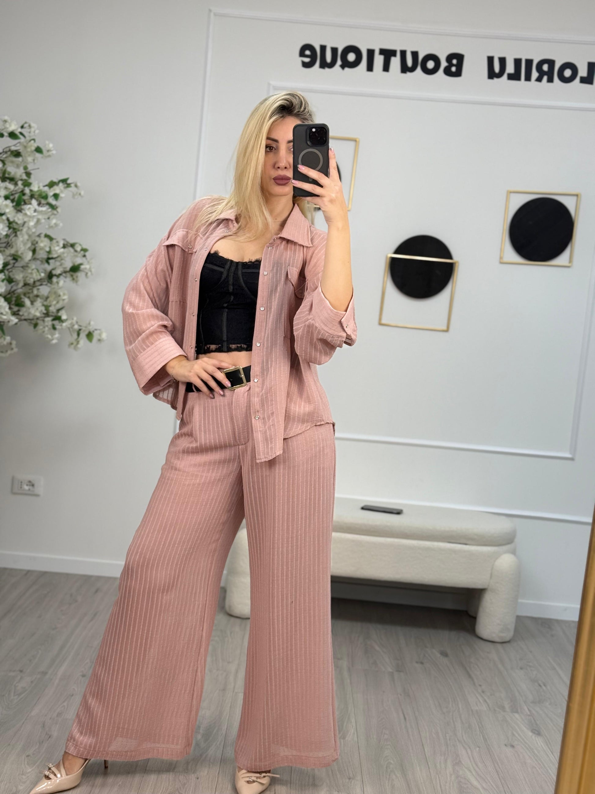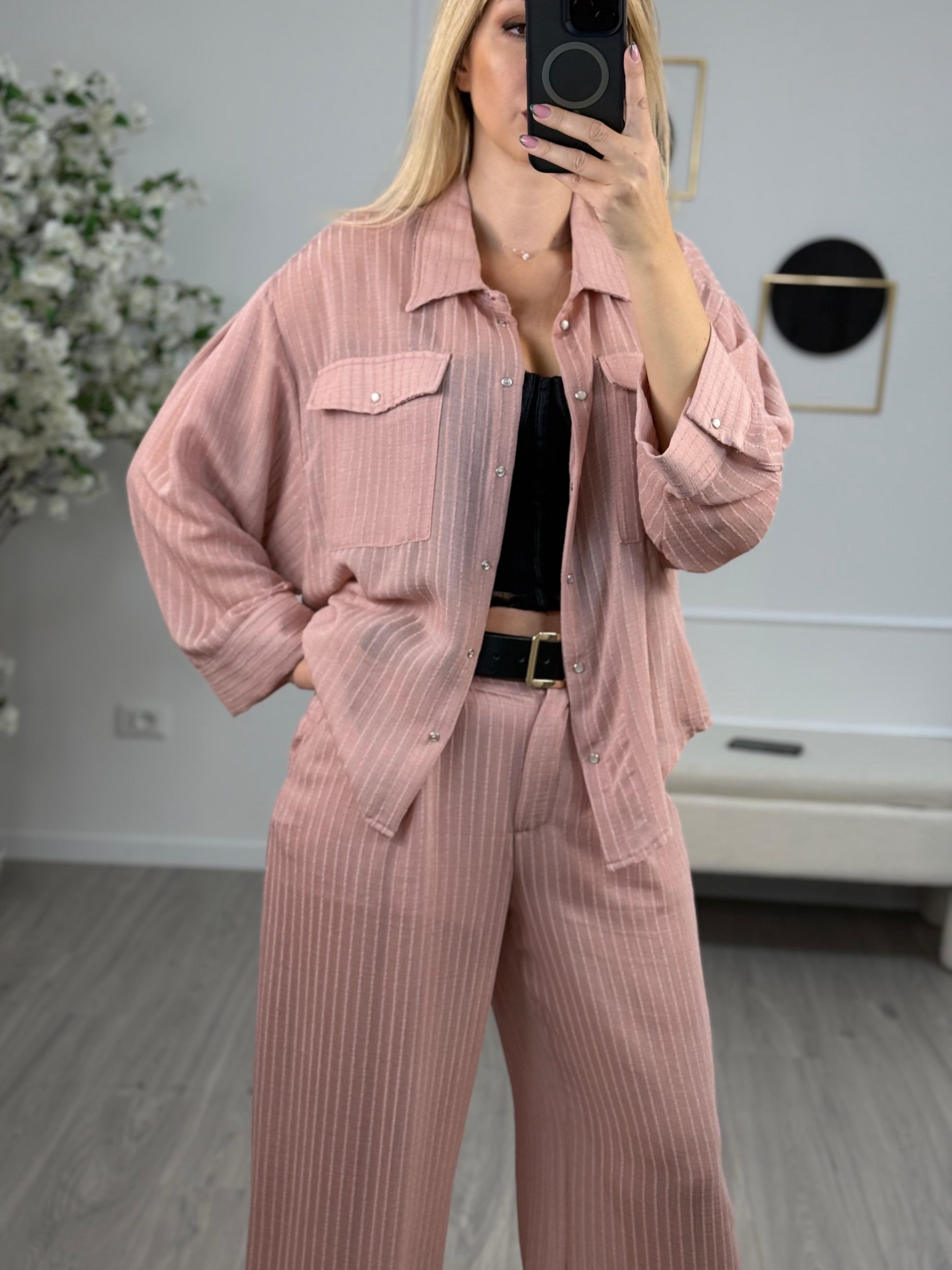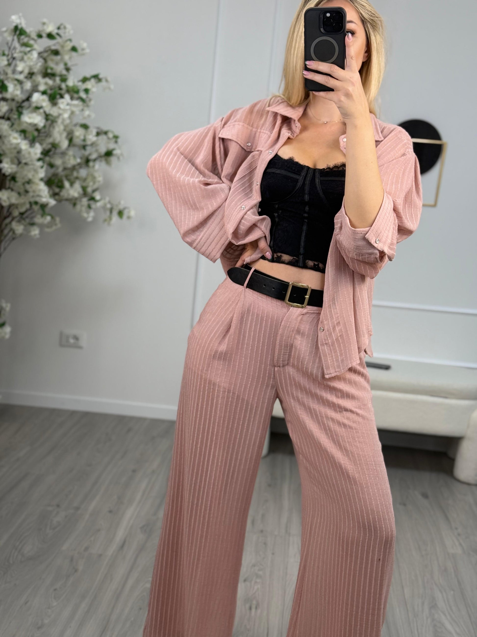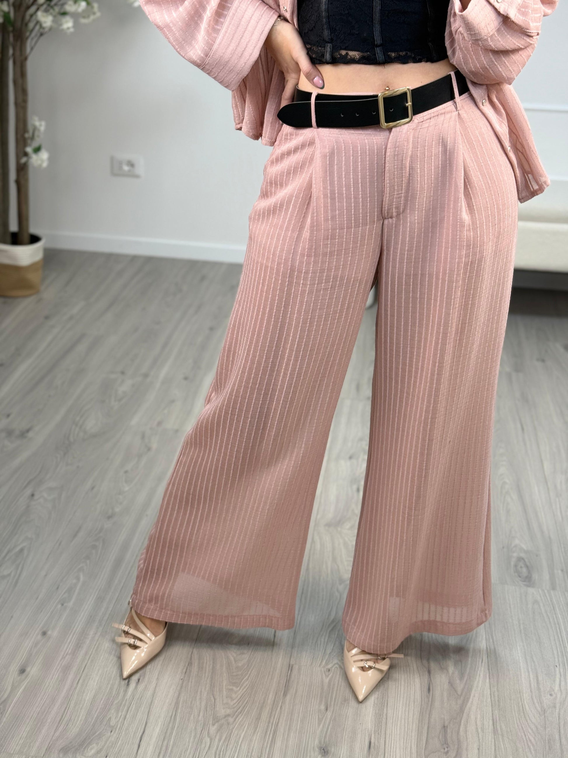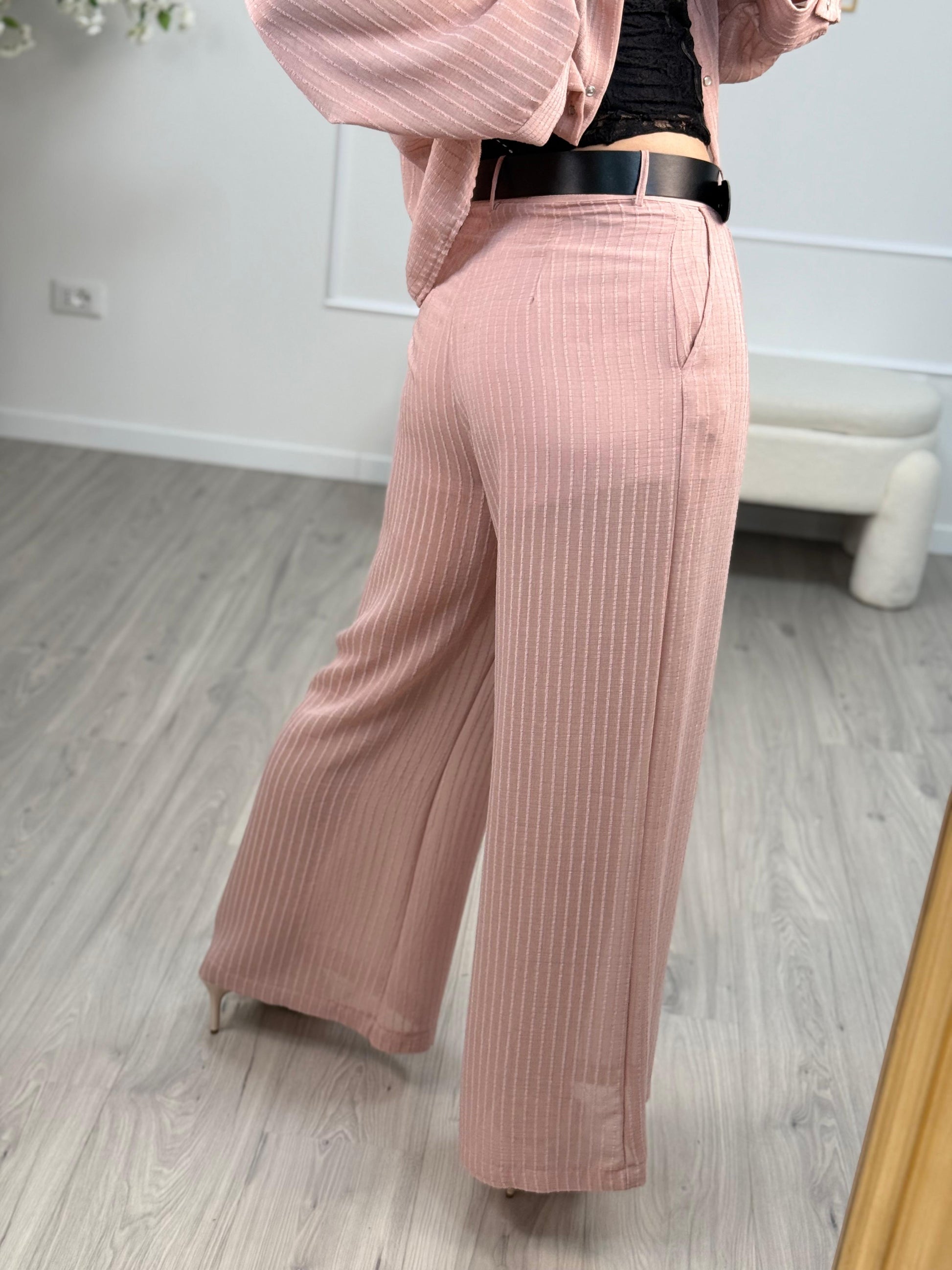 - Pantaloni in viscosa color rosa gessatura in rilievo HaveOne. Modello lungo fit a palazzo con vita alta. Chiusura bottone e zip e dettaglio di maxi cintura marrone con banda elastica. Culotte tono su tono.