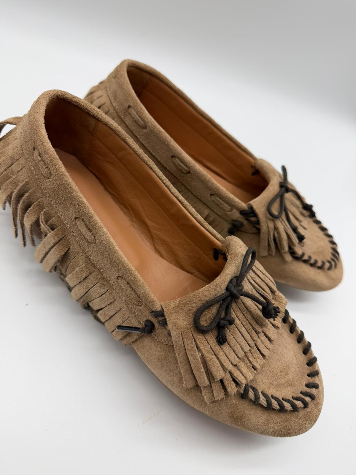 Mocassini in camoscio color caramello con frange e laccetto decorativo in contrasto.