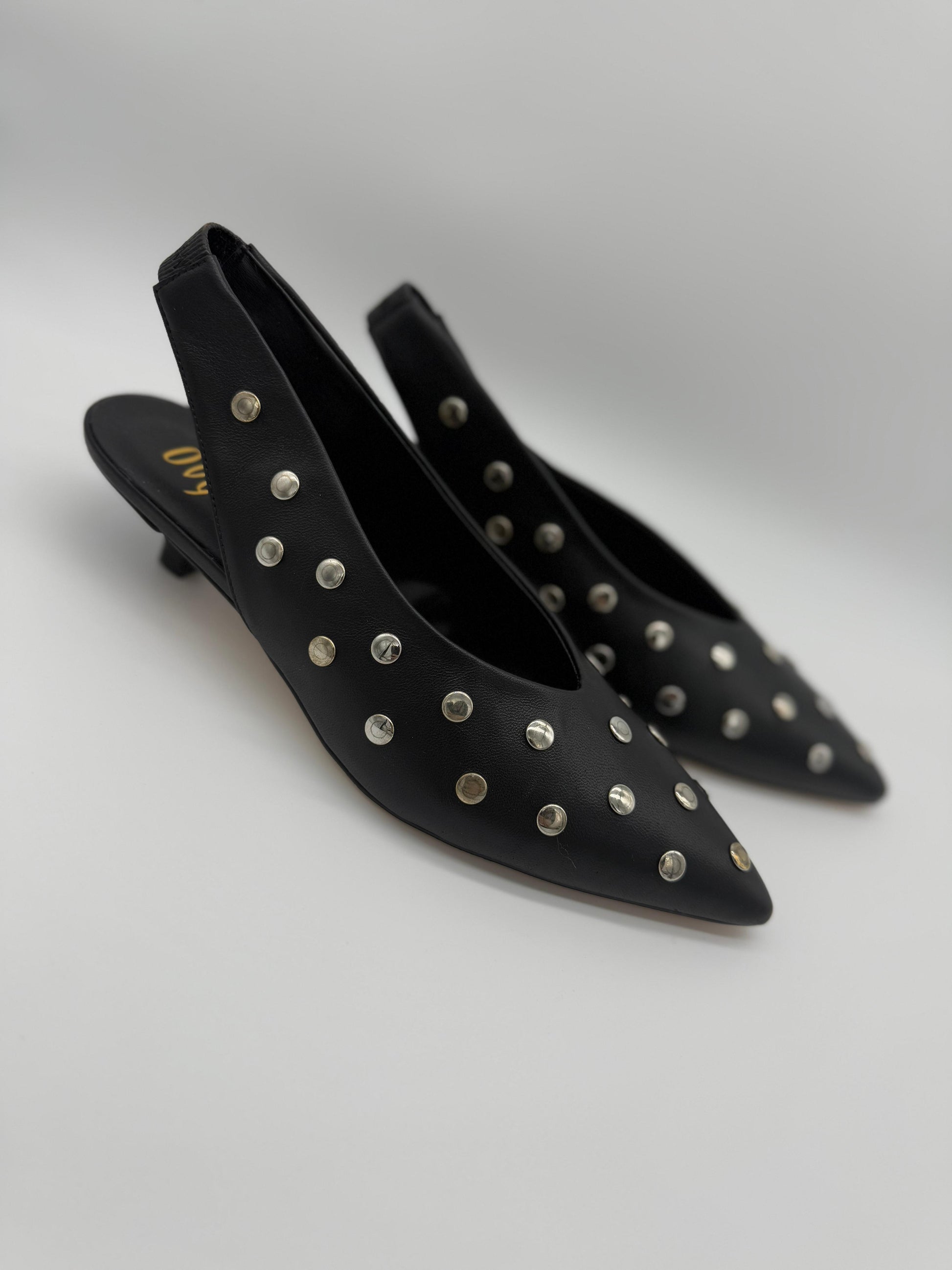 Tomaia decorate da borchie. Tacco fasciato in pelle. Suola antiscivolo.