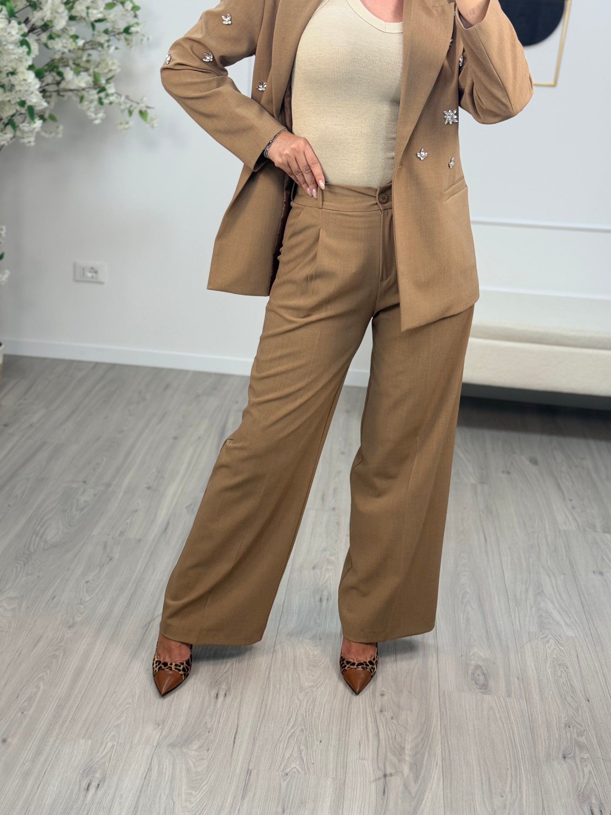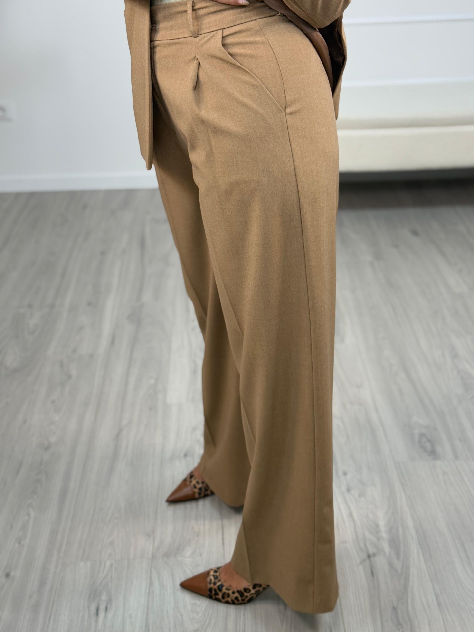 - Descrizione: Pantalone Melange Cammello Modello dritto con vita alta.