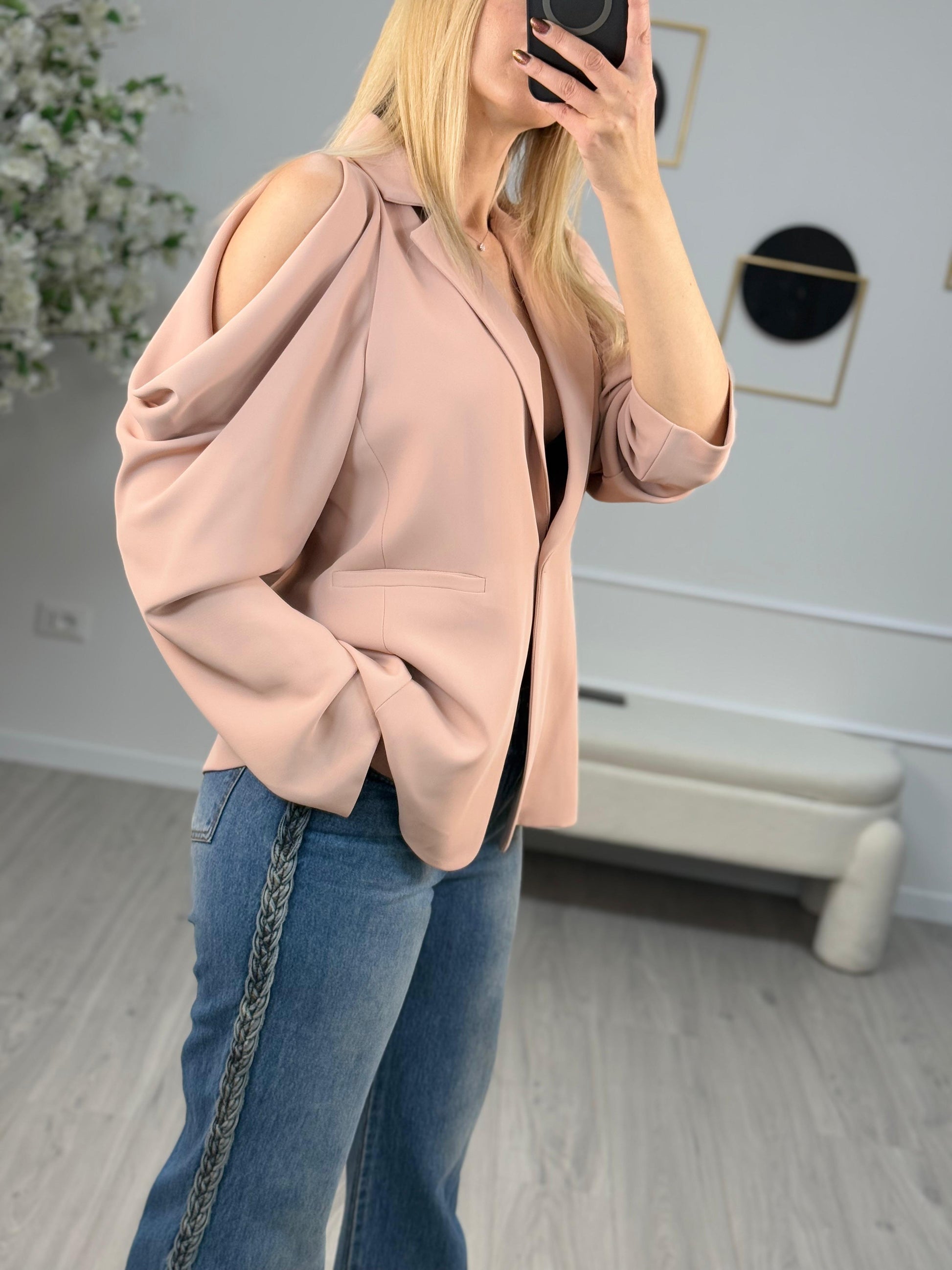 - Giacca elegante con cut-out sulle spalle. Modello monopetto, collo revers, tasche a filetto, con fodera, chiusura con bottone foderato in tinta.