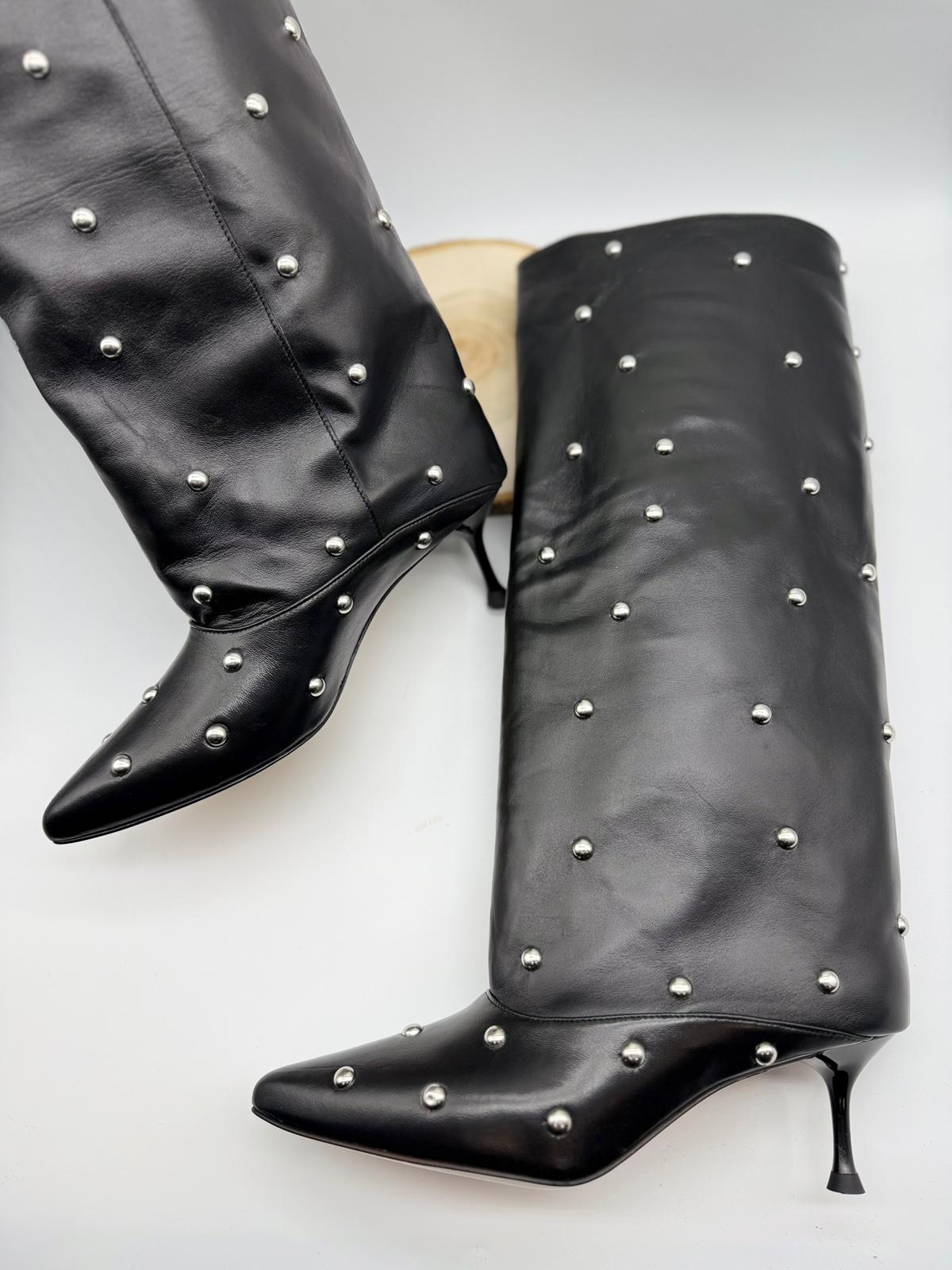 - Stivaletto con tacco basso, dettaglio del gambale ampio con borchie piatte.