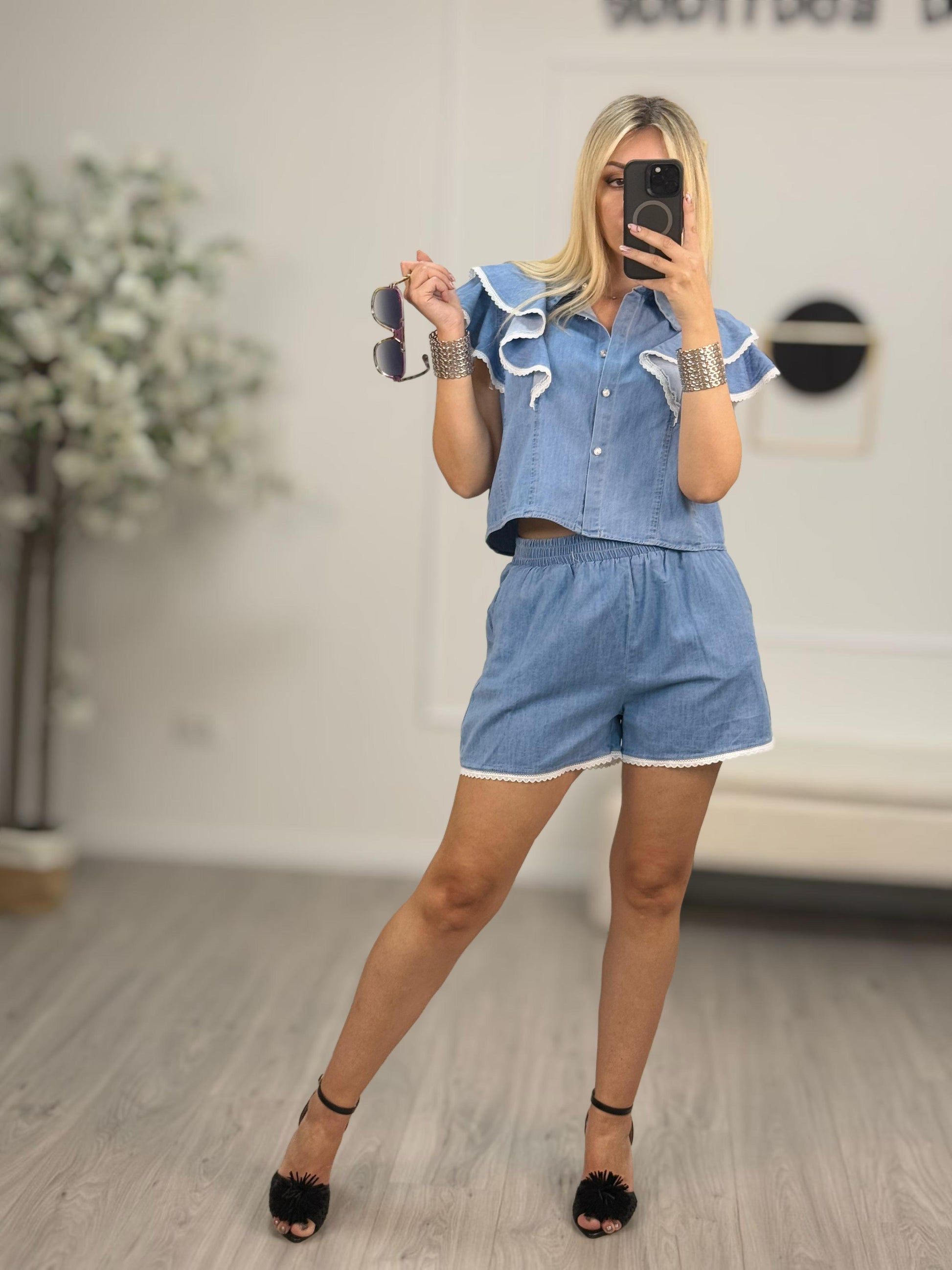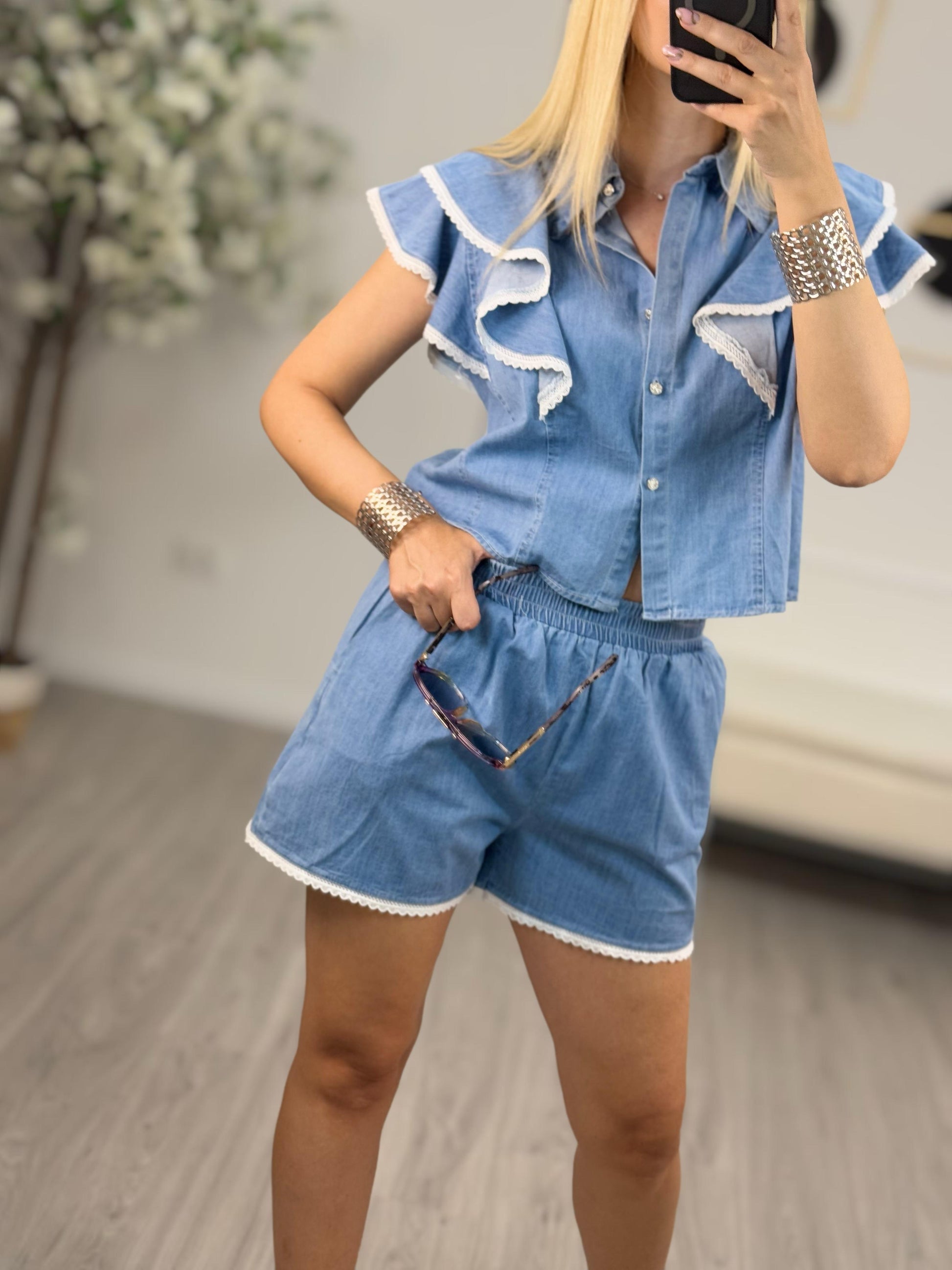 - Completo in Denim con Camicia Crop con Maniche Volant Orlato con Pizzo in Macramè e Short con Elastico in Vita, 2 Tasche Laterali e Orlo in Pizzo Macramè.