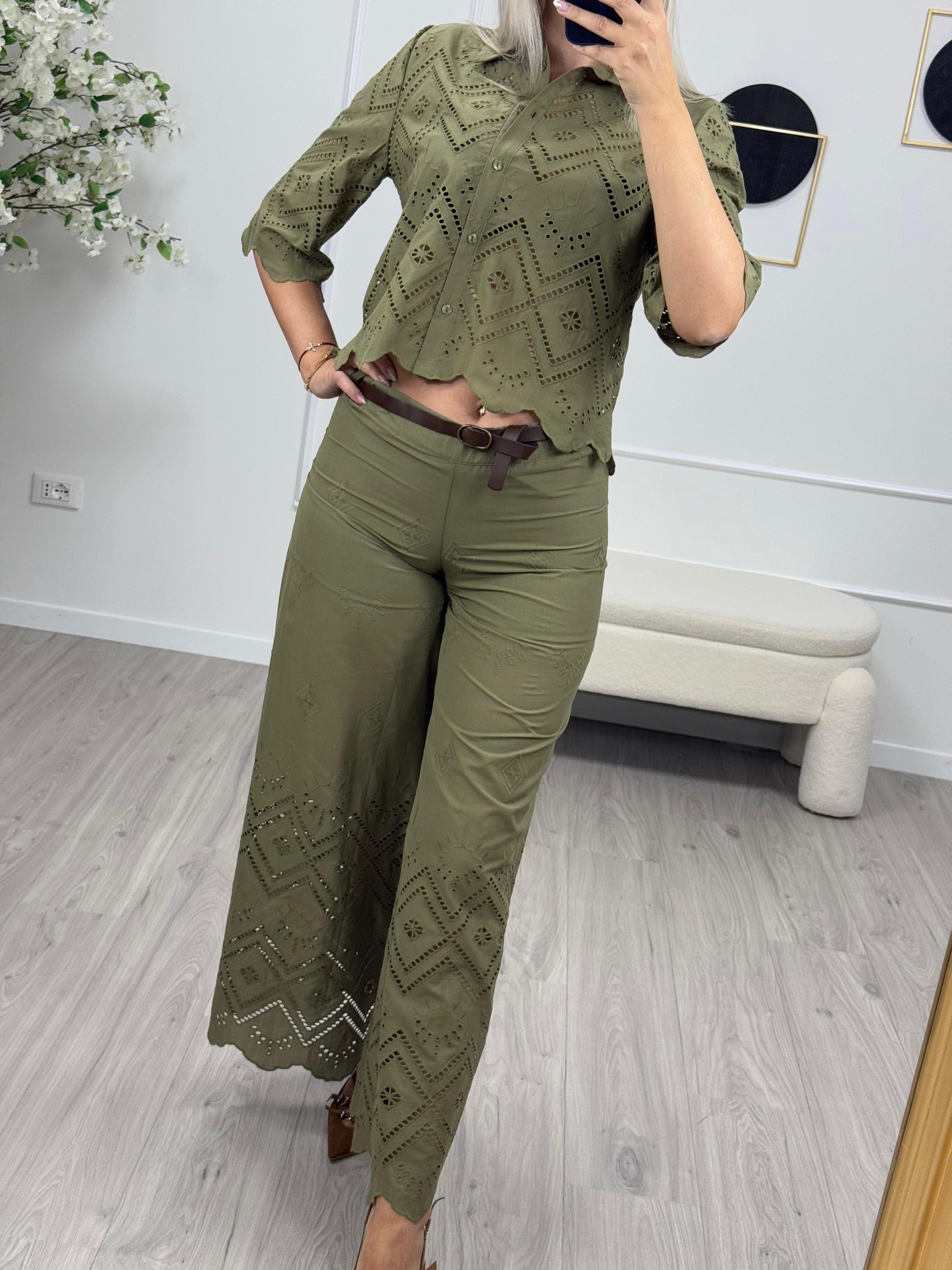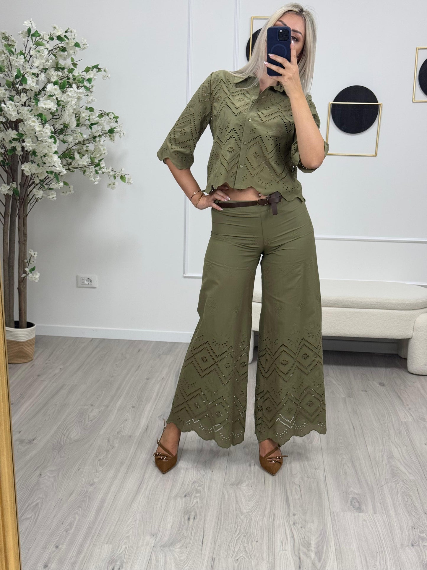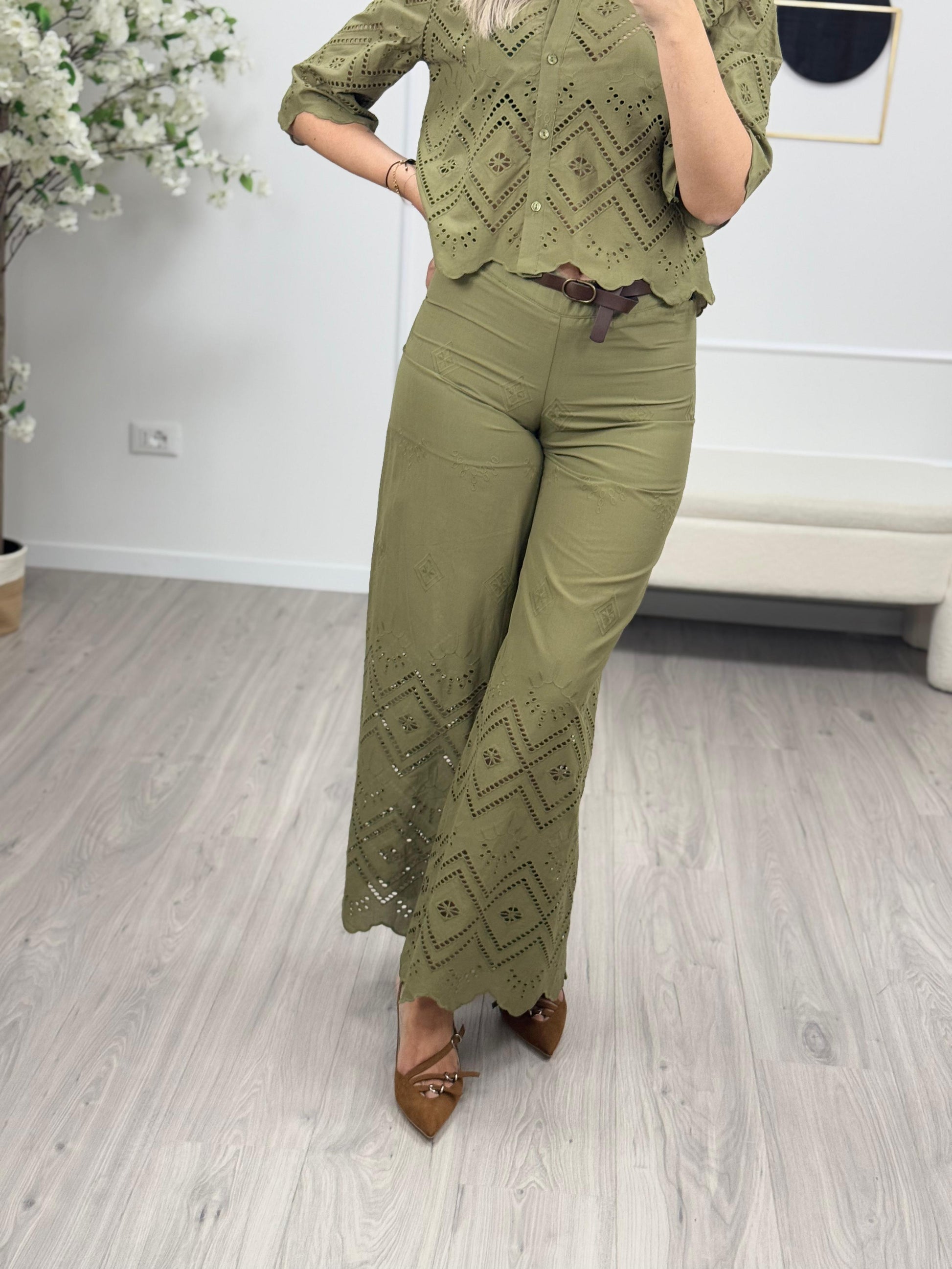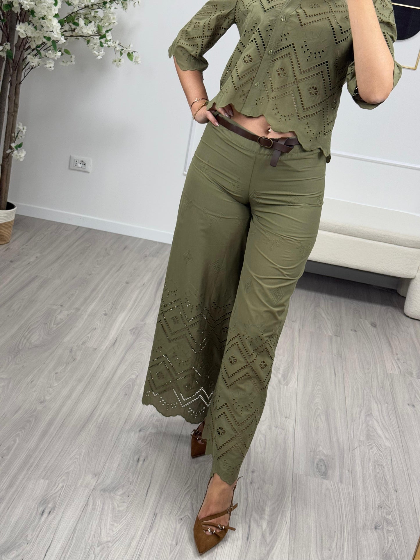 Descrizione: Tensione In Pantaloni colore militare con modello. Composizione: 100%cotone