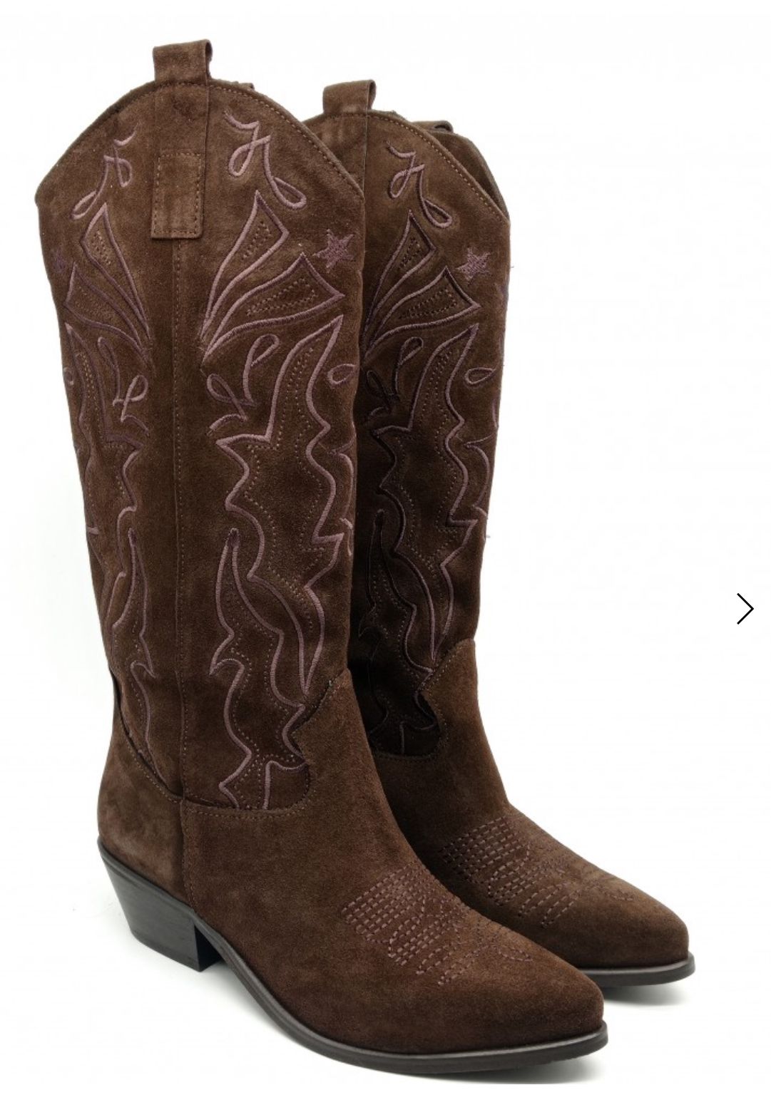 Descrizione: Texani Moro Ricamato Divine Follie Texano alto ricamato, a punta, in camoscio color moro
