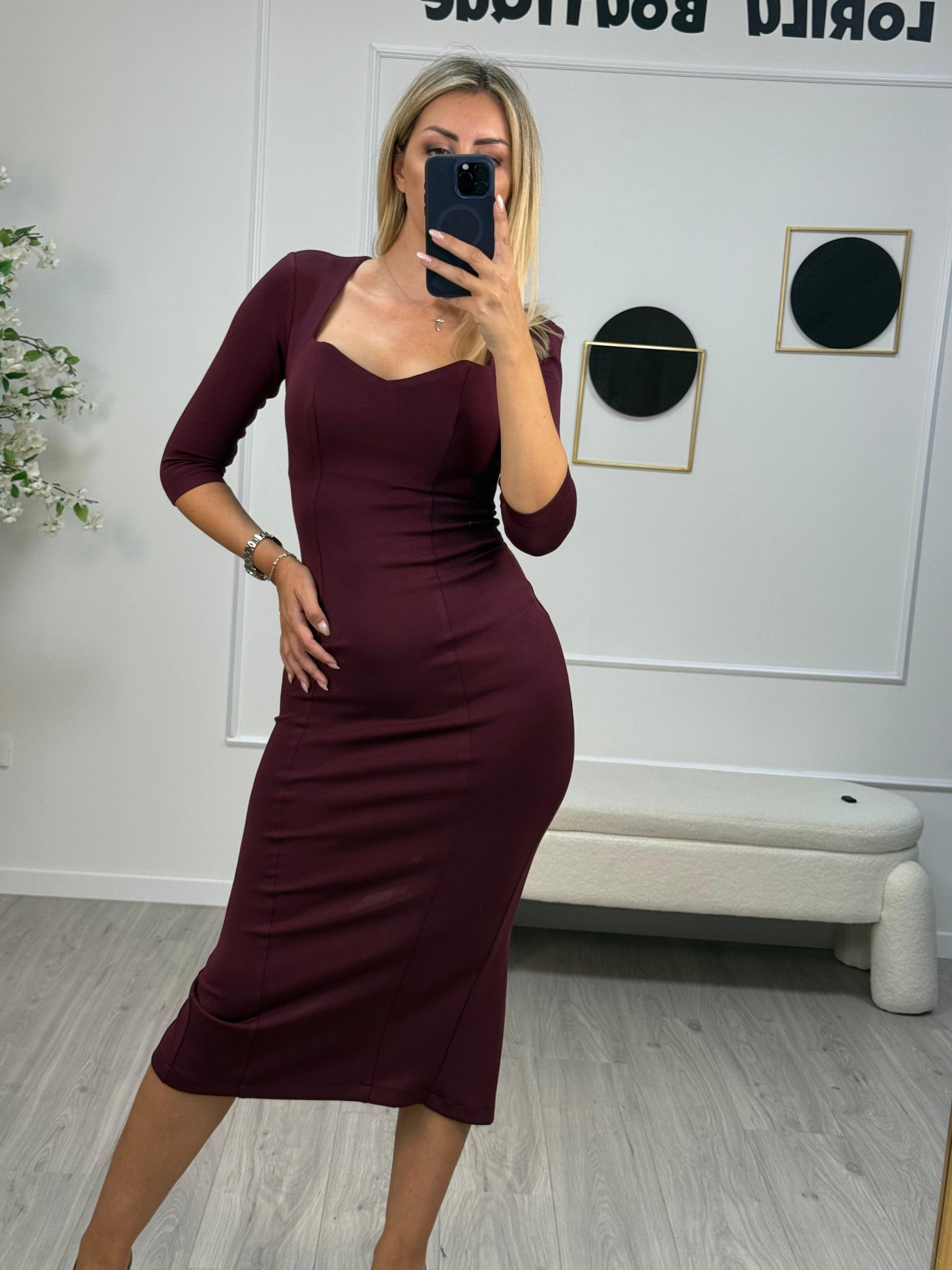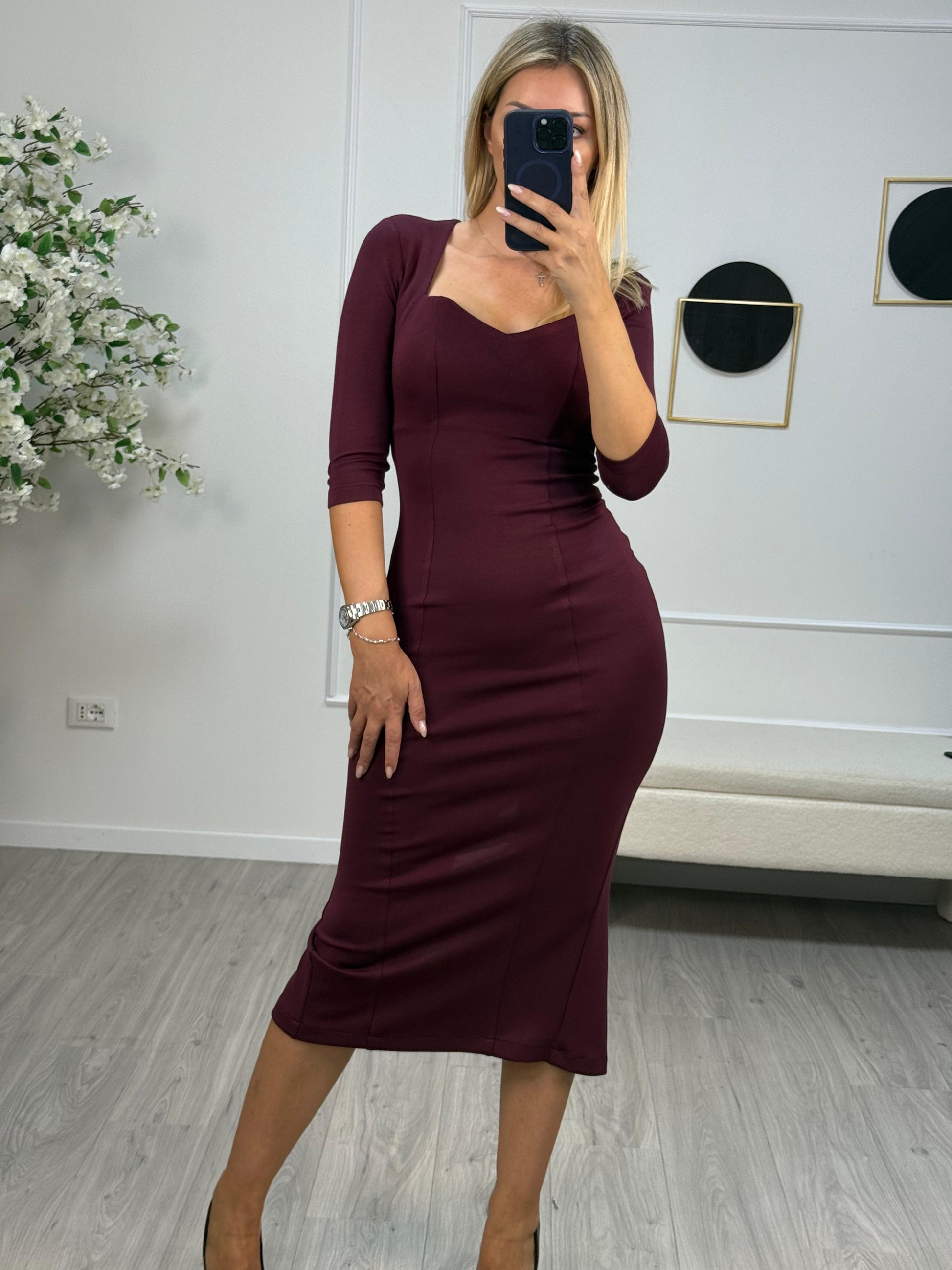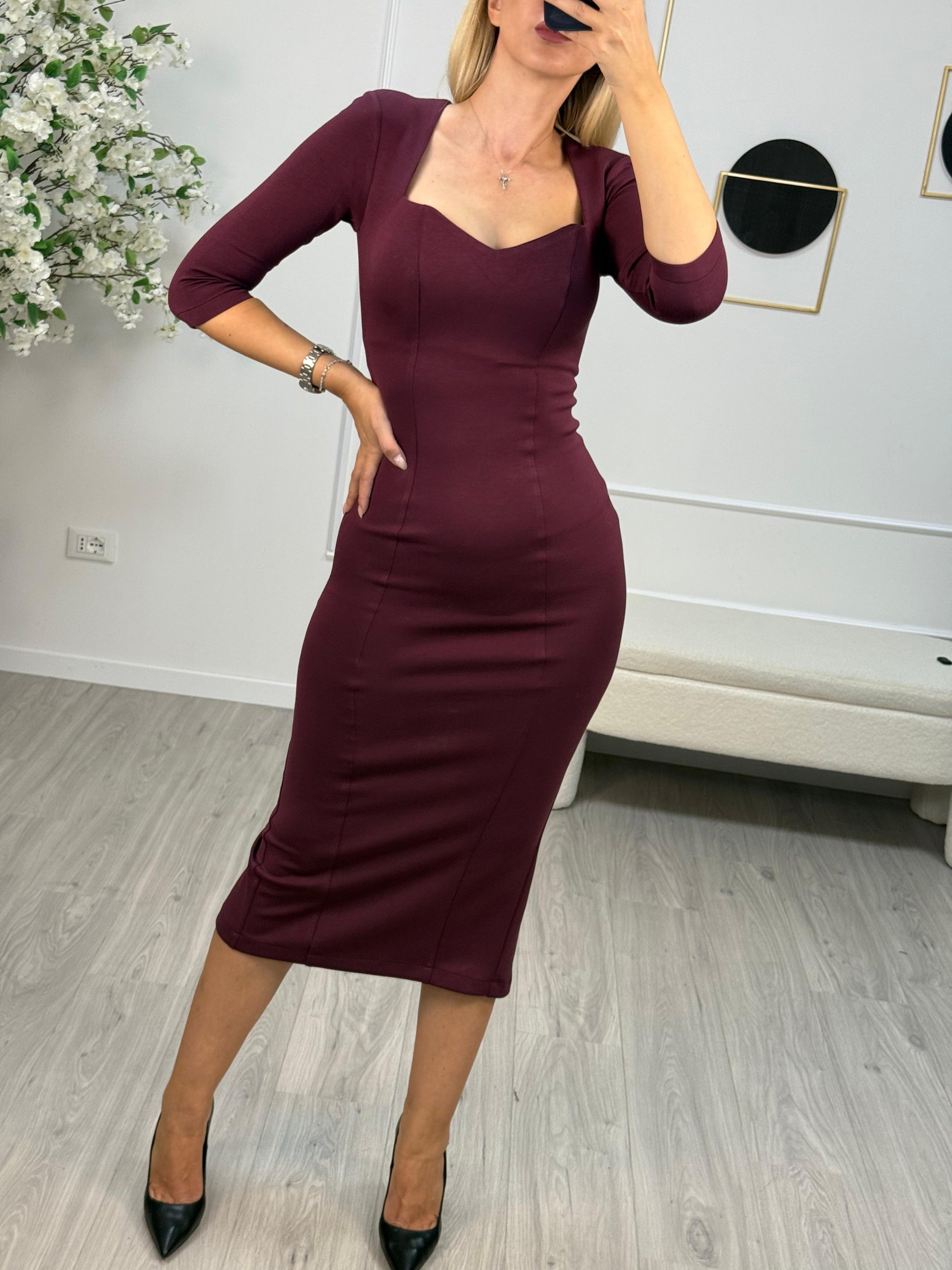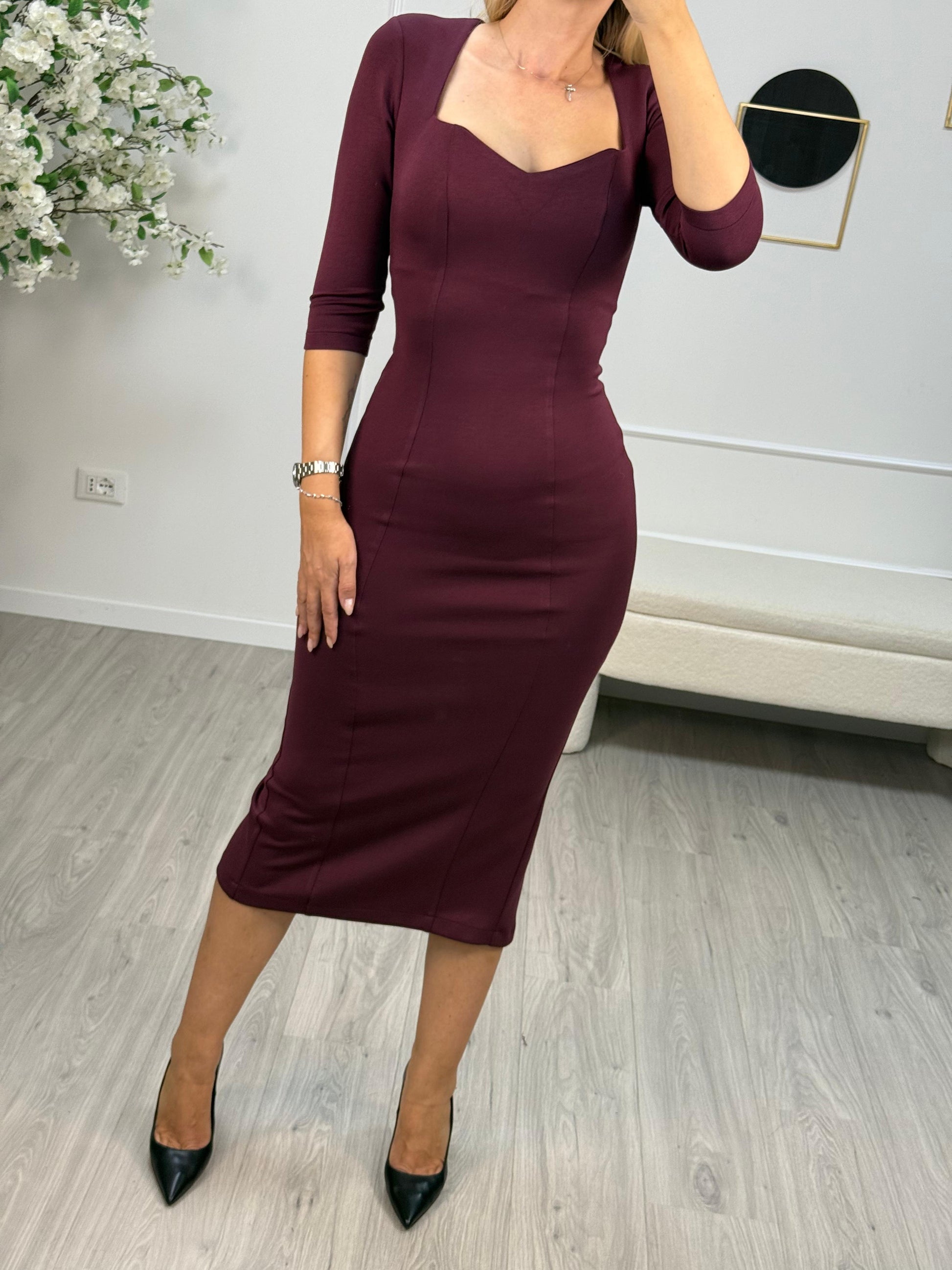 - Descrizione: Tubino Silence Limited, colore bordeaux, modello con maniche a 3/4, scollo a cuore, zip invisibile di chiusura sul retro e spacco posteriore sul fondo.