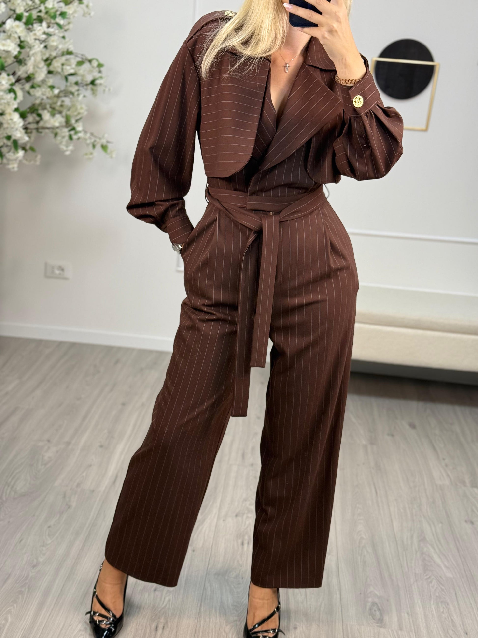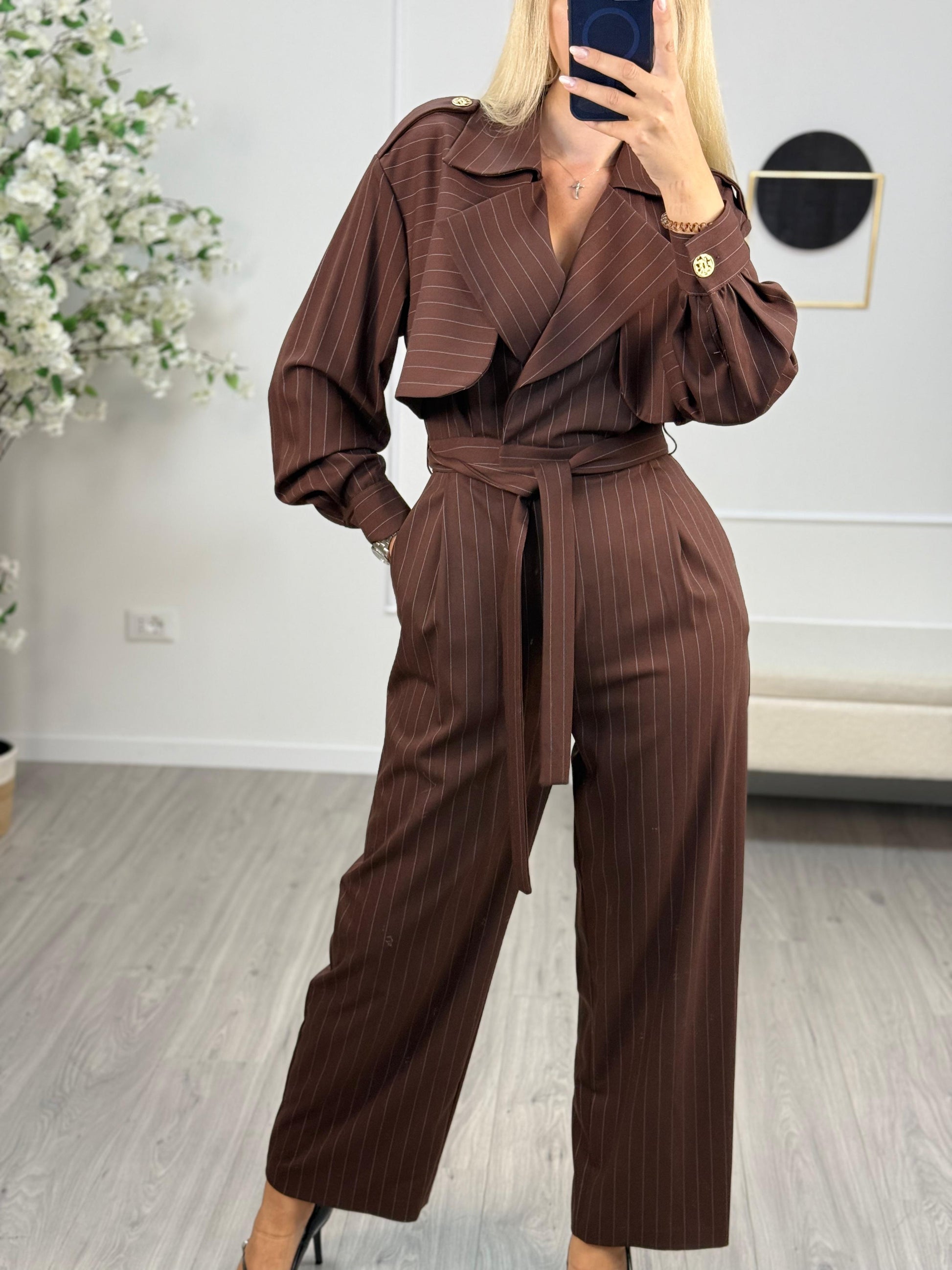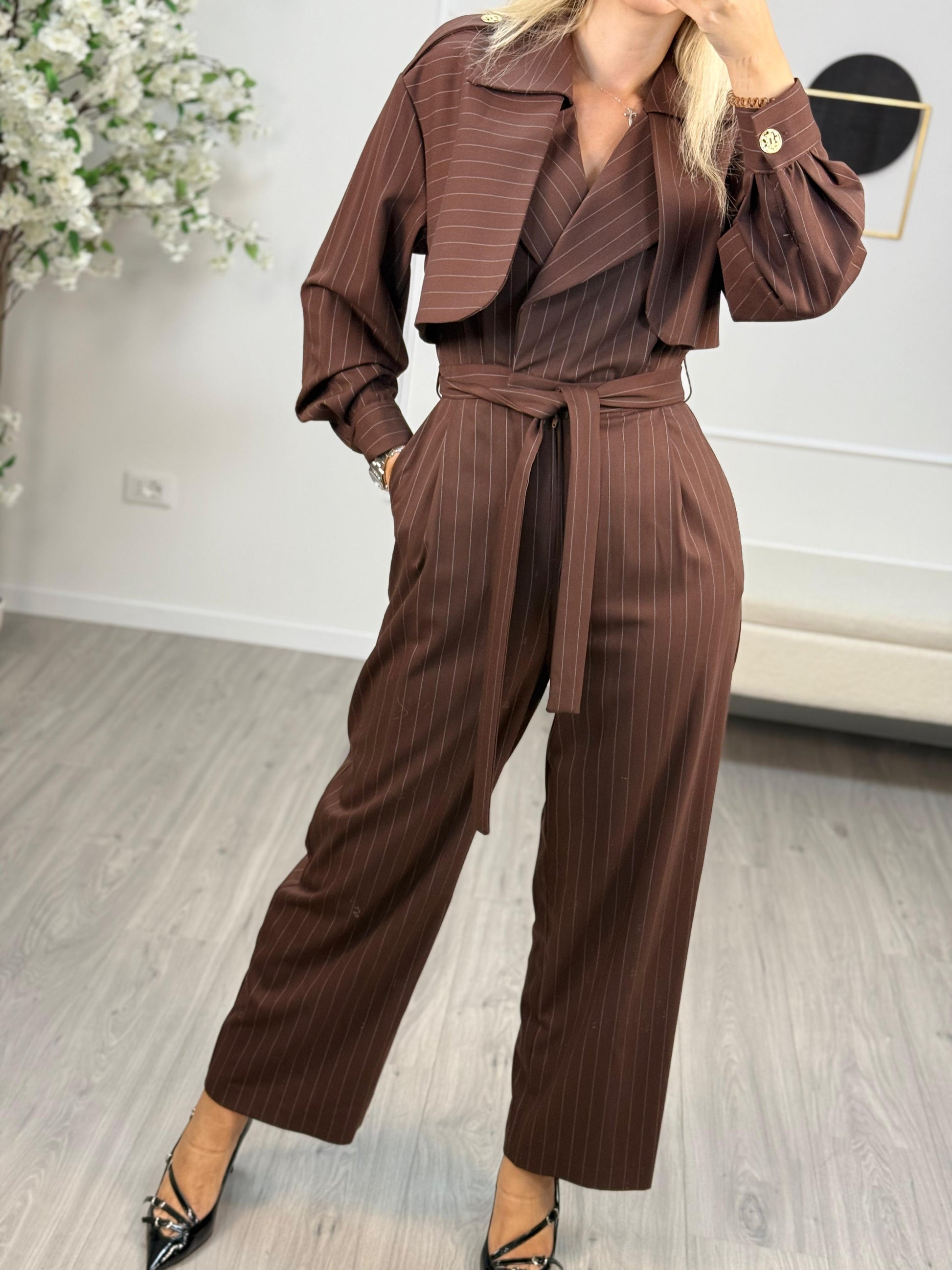 - Descrizione: Tuta Silence Limited colore moro gessata, zip frontale e allacciatura a cintura. Bottoni decorati oro.