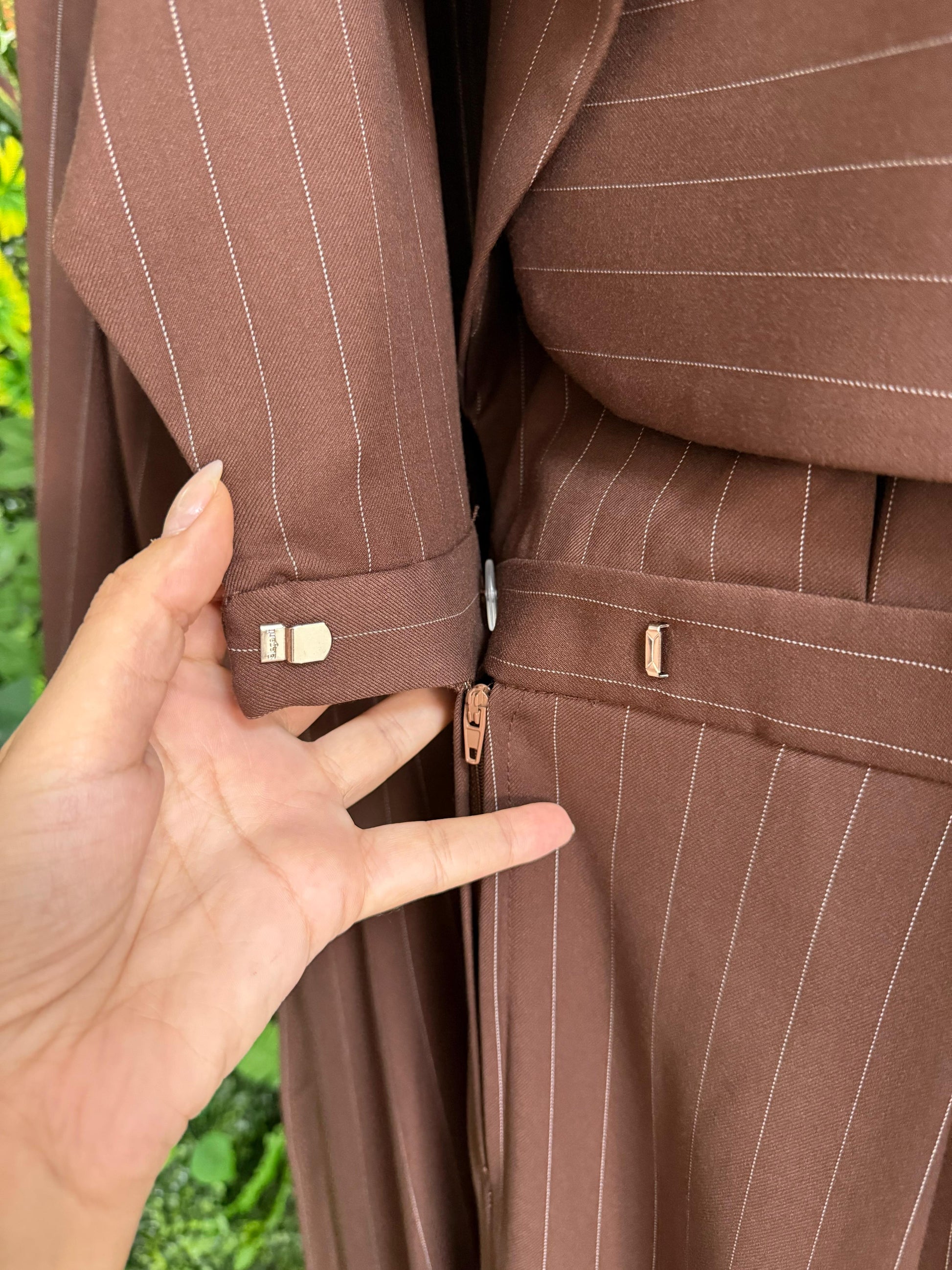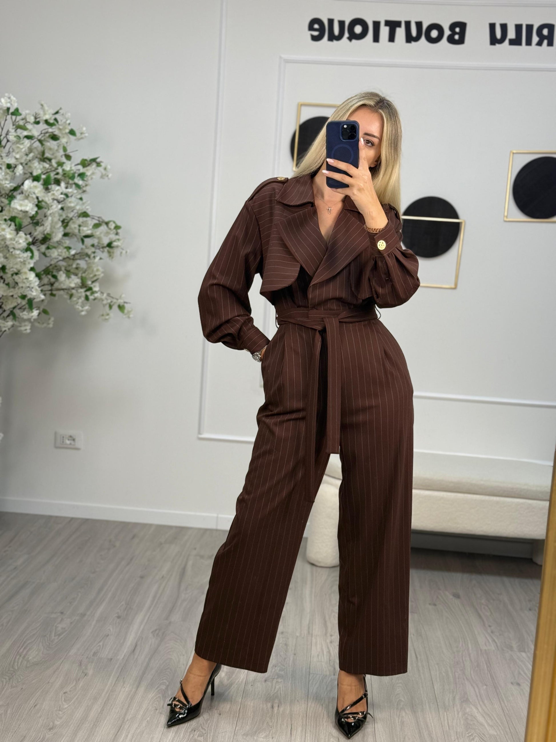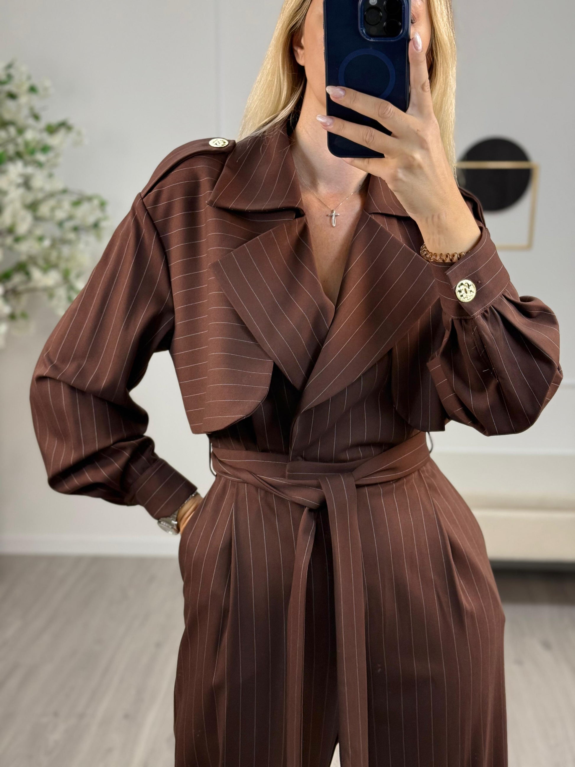 - Descrizione: Tuta Silence Limited colore moro gessata, zip frontale e allacciatura a cintura. Bottoni decorati oro.
